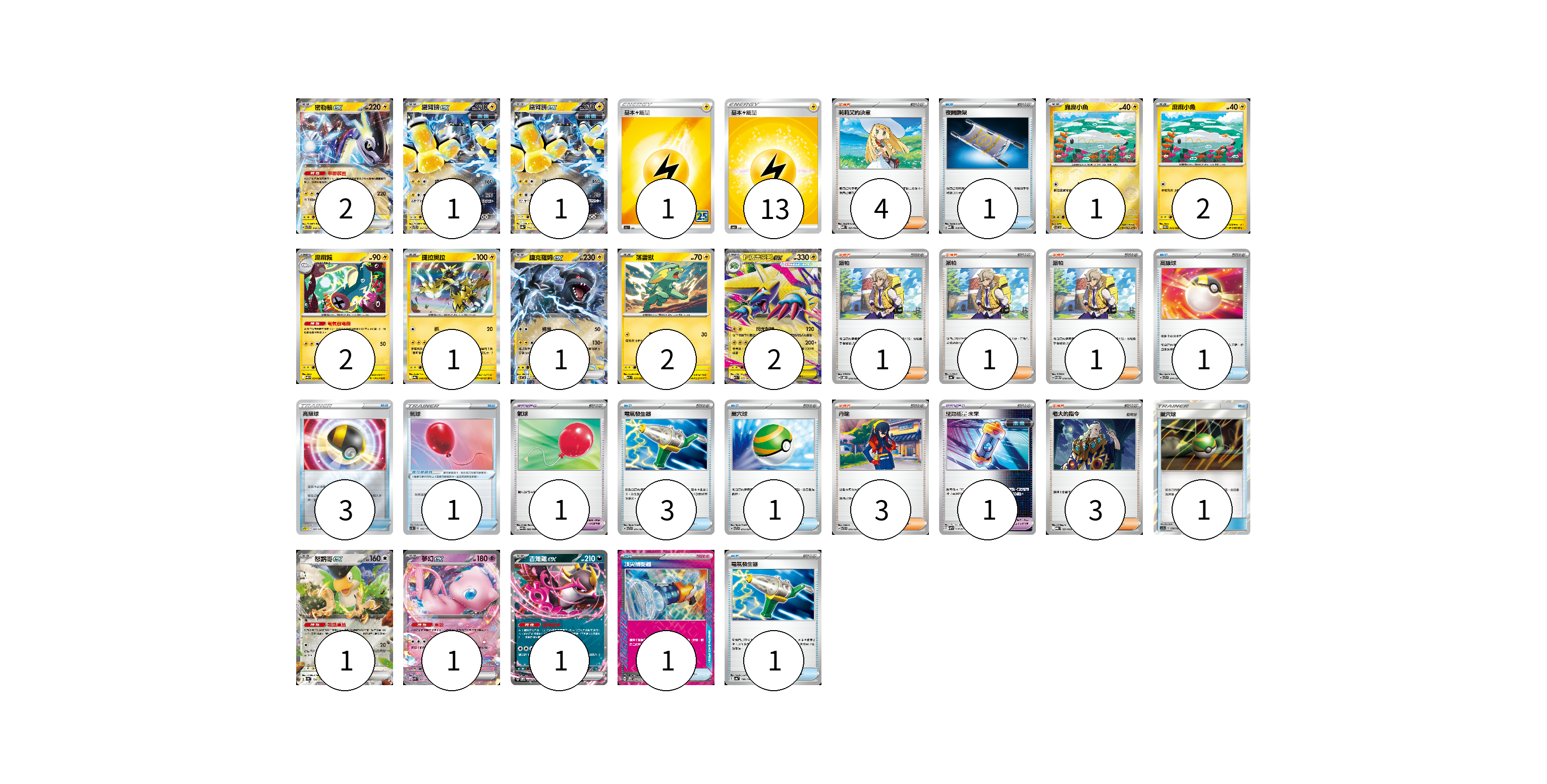 牌組構築方案 以此牌組為基礎新構築牌組 顯示卡面 顯示列表 寶可夢卡(18) 2 1 1 1 2 2 1 1 2 2 1 1 1 寶可夢道具(3) 1 1 1 物品卡(12) 1 1 3 3 1 1 1 1 支援者卡(13) 4 1 1 1 3 3 能量卡(14) 1 13 寶可夢卡(18) 卡牌名稱 張數 卡牌名稱 張數 密勒頓ex SVTR 008/021 02 鐵臂膀ex SVTR 007/021 01 鐵臂膀ex SV8a 054/187 01 麻麻小魚 SV11B 033/086 01 麻麻小魚 SV11B 033/086 02 麻麻鰻 SV11B 034/086 02 捷拉奧拉 SV9a 040/063 01 捷克羅姆ex SV11B 037/086 01 落雷獸 M1S 031/063 02 超級雷電獸ex M1S 032/063 02 怒鸚哥ex SV4a 154/190 01 夢幻ex SVK 001/042 01 吉雉雞ex SVOM 009/021 01 寶可夢道具(3) 卡牌名稱 張數 卡牌名稱 張數 氣球 SC1b 142/153 01 氣球 SV11B 082/086 01 驅勁能量 未來 SVHM 016/022 01 物品卡(12) 卡牌名稱 張數 卡牌名稱 張數 夜間擔架 MBD 016/022 01 高級球 SVTR 014/021 01 高級球 SPZ 009/020 03 電氣發生器 SVTR 011/021 03 巢穴球 SVTR 013/021 01 巢穴球 AS5a 178/184 01 頂尖捕捉器 SV5M 062/071 01 電氣發生器 SV4a 156/190 01 支援者卡(13) 卡牌名稱 張數 卡牌名稱 張數 莉莉艾的決意 MBD 021/022 04 派帕 SVOD 018/020 01 派帕 SV4a 180/190 01 派帕 SVTM 019/022 01 丹瑜 SVTR 016/021 03 老大的指令 MBG 021/022 03 能量卡(14) 卡牌名稱 張數 卡牌名稱 張數 基本雷能量 S8a LIG 01 基本雷能量 SN LIG 13 以此牌組為基礎新構築牌組 牌組編碼 BdIQYu-HtvyTB-vqGlxc copy 列印牌組單 牌組編碼已複製 分享至SNS