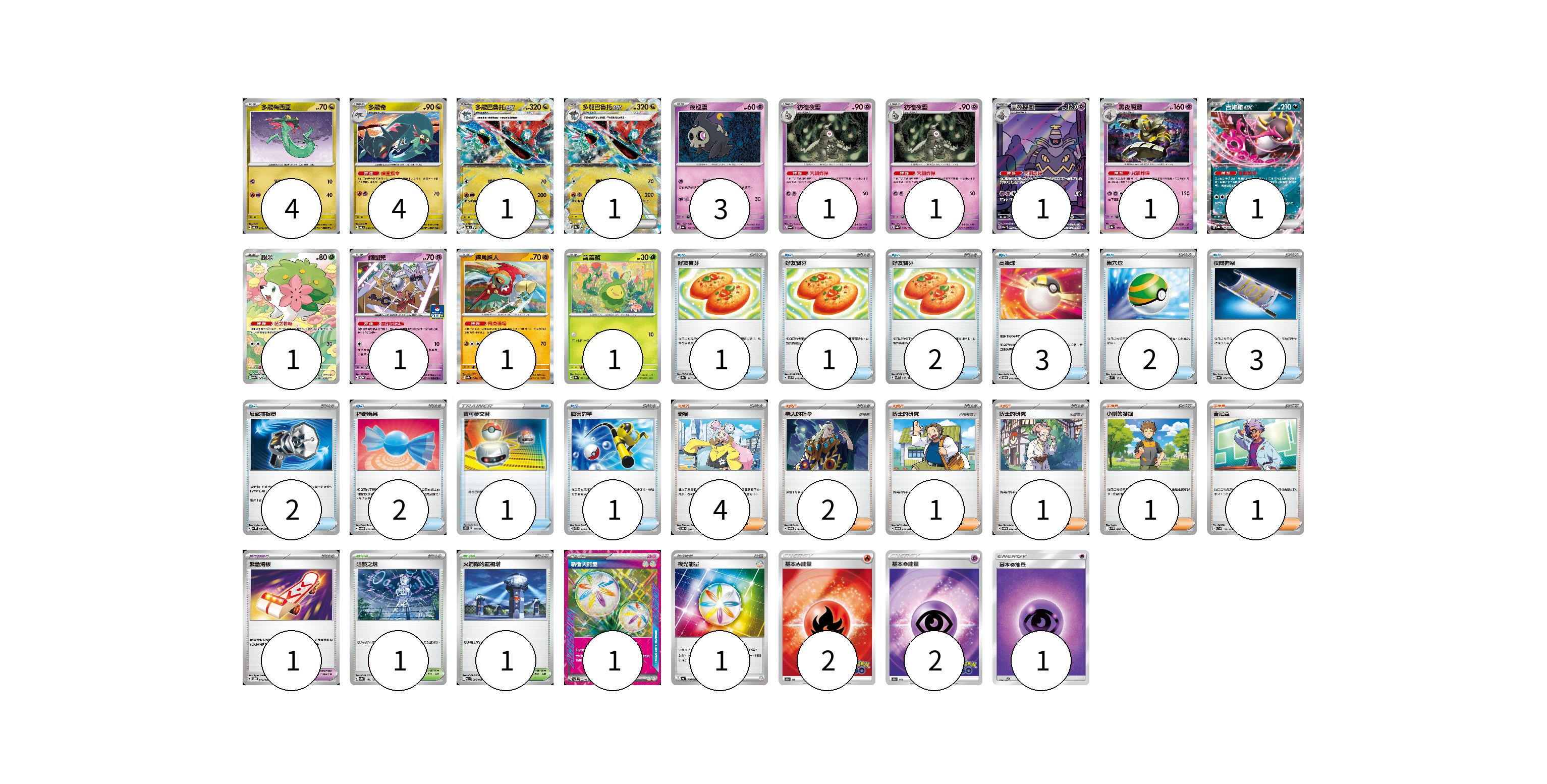 牌組構築方案 以此牌組為基礎新構築牌組 顯示卡面 顯示列表 寶可夢卡(22) 4 4 1 1 3 1 1 1 1 1 1 1 1 1 寶可夢道具(1) 1 物品卡(18) 1 1 2 3 2 3 2 2 1 1 支援者卡(10) 4 2 1 1 1 1 競技場卡(2) 1 1 能量卡(7) 1 1 2 2 1 寶可夢卡(22) 卡牌名稱 張數 卡牌名稱 張數 多龍梅西亞 SV6 079/101 04 多龍奇 SV6 080/101 04 多龍巴魯托ex SV6 081/101 01 多龍巴魯托ex SV8a 120/187 01 夜巡靈 SV6a 018/064 03 彷徨夜靈 SV6a 019/064 01 彷徨夜靈 SV8a 065/187 01 黑夜魔靈 SV6a 070/064 01 黑夜魔靈 SV8a 066/187 01 吉雉雞ex SV8a 104/187 01 謝米 SV9a 066/063 01 鑰圈兒 SV-P 089/SV-P 01 摔角鷹人 SV8a 084/187 01 含羞苞 SV8a 001/187 01 寶可夢道具(1) 卡牌名稱 張數 卡牌名稱 張數 緊急滑板 SVOD 015/020 01 物品卡(18) 卡牌名稱 張數 卡牌名稱 張數 好友寶芬 SV8a 147/187 01 好友寶芬 SVTS 012/022 01 好友寶芬 SV5K 063/071 02 高級球 SVOD 012/020 03 巢穴球 SVM 133/175 02 夜間擔架 SV6a 056/064 03 反擊捕捉器 SV4M 059/066 02 神奇糖果 SVOD 013/020 02 寶可夢交替 SC2D 145/157 01 厲害釣竿 SVTG 009/019 01 支援者卡(10) 卡牌名稱 張數 卡牌名稱 張數 奇樹 SVOD 016/020 04 老大的指令 SVOD 019/020 02 博士的研究 SVOD 017/020 01 博士的研究 SVOM 019/021 01 小剛的發掘 SV9 096/100 01 吉尼亞 SVD 129/139 01 競技場卡(2) 卡牌名稱 張數 卡牌名稱 張數 阻礙之塔 SV8a 181/187 01 火箭隊的監視塔 SV10 096/098 01 能量卡(7) 卡牌名稱 張數 卡牌名稱 張數 新衝天能量 SV5K 071/071 01 夜光能量 SV4a 190/190 01 基本火能量 S10b FIR 02 基本超能量 S10b PSY 02 基本超能量 AS6D PSY 01 以此牌組為基礎新構築牌組 牌組編碼 BekyyO-bftidu-lIBXHC copy 列印牌組單 牌組編碼已複製 分享至SNS
