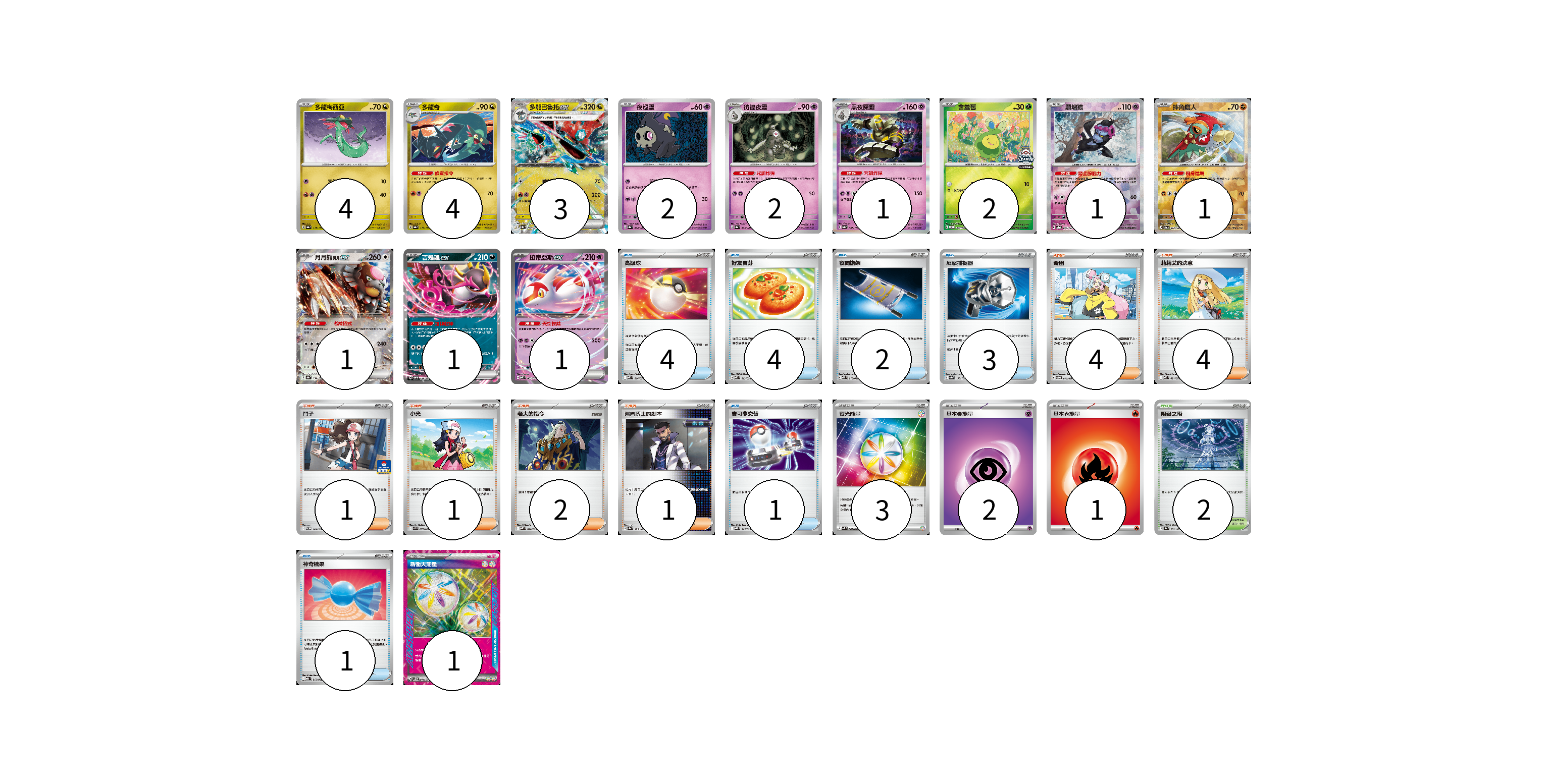 牌組構築方案 以此牌組為基礎新構築牌組 顯示卡面 顯示列表 寶可夢卡(23) 4 4 3 2 2 1 2 1 1 1 1 1 物品卡(15) 4 4 2 3 1 1 支援者卡(13) 4 4 1 1 2 1 競技場卡(2) 2 能量卡(7) 3 2 1 1 寶可夢卡(23) 卡牌名稱 張數 卡牌名稱 張數 多龍梅西亞 SV8a 118/187 04 多龍奇 SV8a 119/187 04 多龍巴魯托ex SV8a 120/187 03 夜巡靈 SV8a 064/187 02 彷徨夜靈 SV8a 065/187 02 黑夜魔靈 SV8a 066/187 01 含羞苞 M-P 037/M-P 02 願增猿 SV8a 075/187 01 摔角鷹人 SV8a 084/187 01 月月熊 赫月ex SV8a 134/187 01 吉雉雞ex SVOM 009/021 01 拉帝亞斯ex MBD 003/022 01 物品卡(15) 卡牌名稱 張數 卡牌名稱 張數 高級球 MBD 014/022 04 好友寶芬 MBD 013/022 04 夜間擔架 MBD 016/022 02 反擊捕捉器 SV8a 139/187 03 寶可夢交替 MBG 015/022 01 神奇糖果 MBG 013/022 01 支援者卡(13) 卡牌名稱 張數 卡牌名稱 張數 奇樹 SVOD 016/020 04 莉莉艾的決意 MBD 021/022 04 鬥子 M-P 048/M-P 01 小光 M2 077/080 01 老大的指令 MBD 020/022 02 弗圖博士的劇本 SV8a 175/187 01 競技場卡(2) 卡牌名稱 張數 卡牌名稱 張數 阻礙之塔 SV8a 181/187 02 能量卡(7) 卡牌名稱 張數 卡牌名稱 張數 夜光能量 SVK 042/042 03 基本超能量 sv-p PSY 02 基本火能量 sv-p FIR 01 新衝天能量 SV5K 071/071 01 以此牌組為基礎新構築牌組 牌組編碼 BetRMG-LepdZr-kMbSWR copy 列印牌組單 牌組編碼已複製 分享至SNS