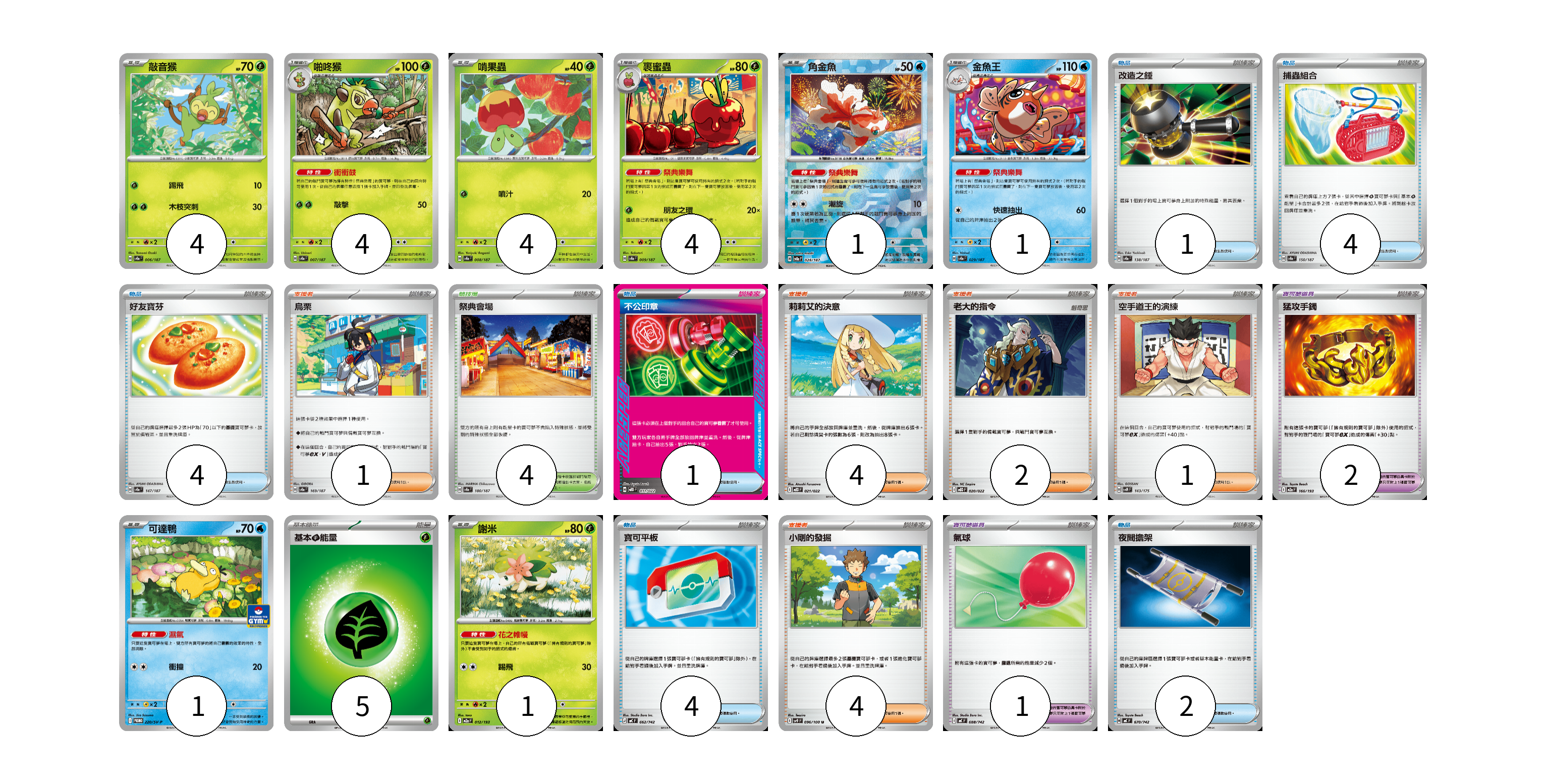 牌組構築方案 以此牌組為基礎新構築牌組 顯示卡面 顯示列表 寶可夢卡(20) 4 4 4 4 1 1 1 1 寶可夢道具(3) 2 1 物品卡(16) 1 4 4 1 4 2 支援者卡(12) 1 4 2 1 4 競技場卡(4) 4 能量卡(5) 5 寶可夢卡(20) 卡牌名稱 張數 卡牌名稱 張數 敲音猴 SV8a 006/187 04 啪咚猴 SV8a 007/187 04 啃果蟲 SV8a 008/187 04 裹蜜蟲 SV8a 009/187 04 角金魚 SV8a 028/187 01 金魚王 SV8a 029/187 01 可達鴨 SV-P 220/SV-P 01 謝米 M2a 012/193 01 寶可夢道具(3) 卡牌名稱 張數 卡牌名稱 張數 猛攻手鐲 M2a 166/193 02 氣球 MC 688/742 01 物品卡(16) 卡牌名稱 張數 卡牌名稱 張數 改造之錘 SV8a 138/187 01 捕蟲組合 SV8a 150/187 04 好友寶芬 SV8a 147/187 04 不公印章 MBD 011/022 01 寶可平板 MC 662/742 04 夜間擔架 MC 670/742 02 支援者卡(12) 卡牌名稱 張數 卡牌名稱 張數 烏栗 SV8a 169/187 01 莉莉艾的決意 MBD 021/022 04 老大的指令 MBD 020/022 02 空手道王的演練 SVM 143/175 01 小剛的發掘 SV9 096/100 04 競技場卡(4) 卡牌名稱 張數 卡牌名稱 張數 祭典會場 SV8a 180/187 04 能量卡(5) 卡牌名稱 張數 卡牌名稱 張數 基本【草】能量 M-P GRA 05 以此牌組為基礎新構築牌組 牌組編碼 Bevcam-caTaeL-CuAnCi copy 列印牌組單 牌組編碼已複製 分享至SNS