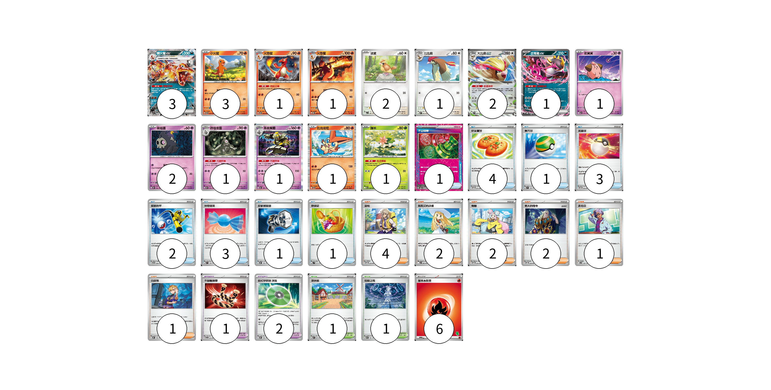 牌組構築方案 以此牌組為基礎新構築牌組 顯示卡面 顯示列表 寶可夢卡(21) 3 3 1 1 2 1 2 1 1 2 1 1 1 1 寶可夢道具(3) 1 2 物品卡(16) 1 4 1 3 2 3 1 1 支援者卡(12) 4 2 2 2 1 1 競技場卡(2) 1 1 能量卡(6) 6 寶可夢卡(21) 卡牌名稱 張數 卡牌名稱 張數 噴火龍ex SV4a 115/190 03 小火龍 SVTL 001/021 03 火恐龍 SVTL 002/021 01 火恐龍 SVQL 002/022 01 波波 SV3 087/108 02 比比鳥 SVK 004/042 01 大比鳥ex SVK 005/042 02 吉雉雞ex SVOD 004/020 01 皮寶寶 SV4a 077/190 01 夜巡靈 SV8a 064/187 02 彷徨夜靈 SV8a 065/187 01 黑夜魔靈 SV8a 066/187 01 比克提尼 SV11B 012/086 01 謝米 SV9a 006/063 01 寶可夢道具(3) 卡牌名稱 張數 卡牌名稱 張數 不服輸頭帶 SVTL 016/021 01 招式學習器 演進 SV8a 160/187 02 物品卡(16) 卡牌名稱 張數 卡牌名稱 張數 不公印章 SV5a 053/066 01 好友寶芬 SVOD 011/020 04 巢穴球 SVM 133/175 01 高級球 SVOM 013/021 03 厲害釣竿 SVTG 009/019 02 神奇糖果 SVM 135/175 03 反擊捕捉器 SV8a 139/187 01 野餐籃 SV1V 071/078 01 支援者卡(12) 卡牌名稱 張數 卡牌名稱 張數 派帕 SVOD 018/020 04 莉莉艾的決意 M1L 062/063 02 奇樹 SVOD 016/020 02 老大的指令 SVOD 019/020 02 吉尼亞 SVD 129/139 01 白蕾雅 SV8a 176/187 01 競技場卡(2) 卡牌名稱 張數 卡牌名稱 張數 深缽鎮 SVK 039/042 01 阻礙之塔 SV8a 181/187 01 能量卡(6) 卡牌名稱 張數 卡牌名稱 張數 基本【火】能量 SVI FIR 06 以此牌組為基礎新構築牌組 牌組編碼 BfcvsA-LvDlxM-sopufE copy 列印牌組單 牌組編碼已複製 分享至SNS