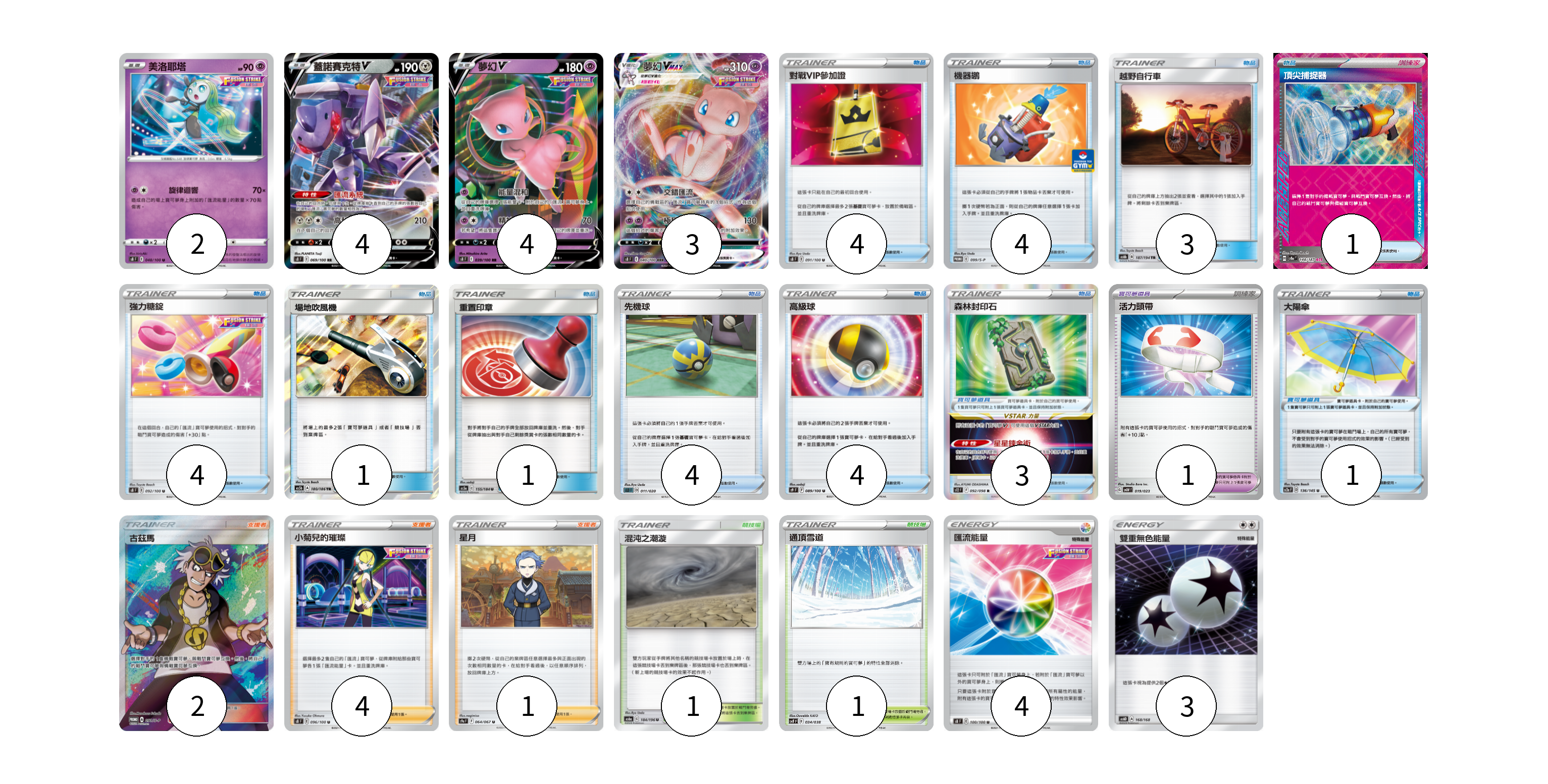 牌組構築方案 以此牌組為基礎新構築牌組 顯示卡面 顯示列表 寶可夢卡(13) 2 4 4 3 寶可夢道具(5) 3 1 1 物品卡(26) 4 4 3 1 4 1 1 4 4 支援者卡(7) 2 4 1 競技場卡(2) 1 1 能量卡(7) 4 3 寶可夢卡(13) 卡牌名稱 張數 卡牌名稱 張數 美洛耶塔 S8 048/100 02 蓋諾賽克特V S8 069/100 04 夢幻V S8 039/100 04 夢幻VMAX S8 040/100 03 寶可夢道具(5) 卡牌名稱 張數 卡牌名稱 張數 森林封印石 S12 092/098 03 活力頭帶 SVAW 019/023 01 大陽傘 SC2a 136/145 01 物品卡(26) 卡牌名稱 張數 卡牌名稱 張數 對戰VIP參加證 S8 091/100 04 機器鶘 S-P 099/S-P 04 越野自行車 AS6b 187/194 03 頂尖捕捉器 SV8a 148/187 01 強力糖錠 S8 092/100 04 場地吹風機 AS5b 180/186 01 重置印章 AS5a 155/184 01 先機球 SLD 011/020 04 高級球 S9 089/100 04 支援者卡(7) 卡牌名稱 張數 卡牌名稱 張數 古茲馬 S-P 091/S-P 02 小菊兒的璀璨 S8 096/100 04 星月 S9a 064/067 01 競技場卡(2) 卡牌名稱 張數 卡牌名稱 張數 混沌之潮漩 AS6a 184/196 01 通頂雪道 SVF 034/038 01 能量卡(7) 卡牌名稱 張數 卡牌名稱 張數 匯流能量 S8 100/100 04 雙重無色能量 AS6D 168/168 03 以此牌組為基礎新構築牌組 牌組編碼 BhZRrP-KrVgzt-HiFIGs copy 列印牌組單 牌組編碼已複製 分享至SNS