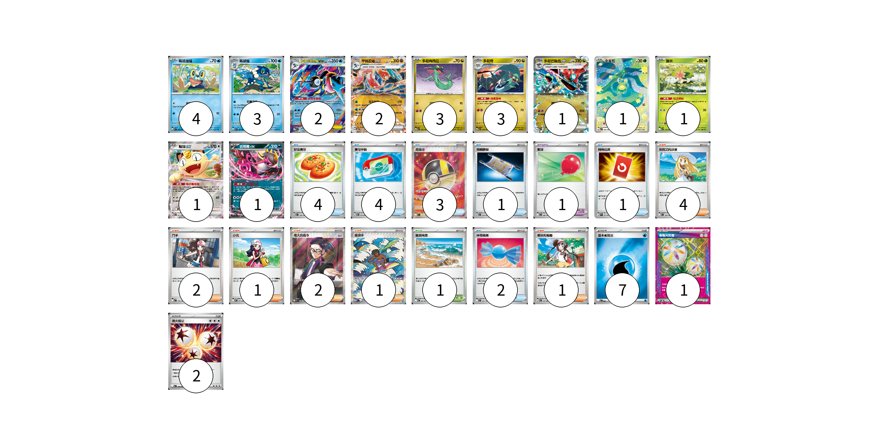 牌組構築方案 以此牌組為基礎新構築牌組 顯示卡面 顯示列表 寶可夢卡(22) 4 3 2 2 3 3 1 1 1 1 1 寶可夢道具(1) 1 物品卡(15) 4 4 3 1 1 2 支援者卡(11) 4 2 1 2 1 1 競技場卡(1) 1 能量卡(10) 7 1 2 寶可夢卡(22) 卡牌名稱 張數 卡牌名稱 張數 呱呱泡蛙 M4 020/083 04 呱頭蛙 M4 021/083 03 超級甲賀忍蛙ex M4 022/083 02 甲賀忍蛙ex SV5a 045/066 02 多龍梅西亞 MC 546/742 03 多龍奇 MC 547/742 03 多龍巴魯托ex MC 548/742 01 含羞苞 M2a 196/193 01 謝米 M2a 012/193 01 喵喵ex M3 061/080 01 吉雉雞ex MC 489/742 01 寶可夢道具(1) 卡牌名稱 張數 卡牌名稱 張數 氣球 MC 688/742 01 物品卡(15) 卡牌名稱 張數 卡牌名稱 張數 好友寶芬 MC 648/742 04 寶可平板 M3 070/080 04 高級球 M2a 216/193 03 夜間擔架 MC 670/742 01 特殊紅牌 M4 072/083 01 神奇糖果 MC 655/742 02 支援者卡(11) 卡牌名稱 張數 卡牌名稱 張數 莉莉艾的決意 MC 729/742 04 鬥子 MC 718/742 02 小光 M2 077/080 01 老大的指令(烏羽) MC 760/742 02 衝浪手 M2a 249/193 01 鳴依的勉勵 M3 075/080 01 競技場卡(1) 卡牌名稱 張數 卡牌名稱 張數 衝浪海灘 M1S 062/063 01 能量卡(10) 卡牌名稱 張數 卡牌名稱 張數 基本【水】能量 MC WAT 07 新衝天能量 SV5K 071/071 01 燃火能量 MC 736/742 02 以此牌組為基礎新構築牌組 牌組編碼 BhdCJm-lKwyxF-SnNzjb copy 列印牌組單 牌組編碼已複製 分享至SNS