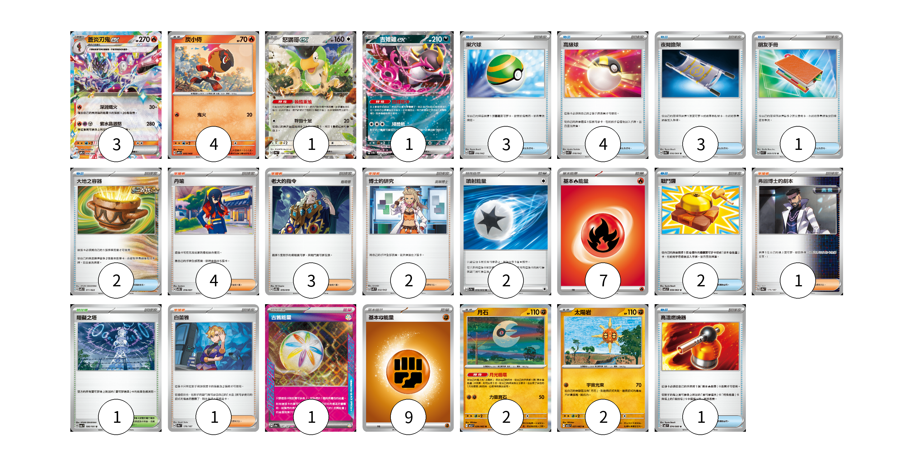 牌組構築方案 以此牌組為基礎新構築牌組 顯示卡面 顯示列表 寶可夢卡(13) 3 4 1 1 2 2 物品卡(16) 3 4 3 1 2 2 1 支援者卡(11) 4 3 2 1 1 競技場卡(1) 1 能量卡(19) 2 7 1 9 寶可夢卡(13) 卡牌名稱 張數 卡牌名稱 張數 蒼炎刃鬼ex SVPS 006/008 03 炭小侍 SVPS 005/008 04 怒鸚哥ex SV4a 154/190 01 吉雉雞ex SV6a 038/064 01 月石 M1L 026/063 02 太陽岩 M1L 027/063 02 物品卡(16) 卡牌名稱 張數 卡牌名稱 張數 巢穴球 SVK 016/042 03 高級球 SVK 018/042 04 夜間擔架 SV6a 056/064 03 朋友手冊 SV1S 069/078 01 大地之容器 SVTS 011/022 02 戰鬥鑼 M1L 059/063 02 高溫燃燒器 M2 074/080 01 支援者卡(11) 卡牌名稱 張數 卡牌名稱 張數 丹瑜 SVTR 016/021 04 老大的指令 SVTG 019/019 03 博士的研究 SVK 032/042 02 弗圖博士的劇本 SV8a 175/187 01 白蕾雅 SV8a 176/187 01 競技場卡(1) 卡牌名稱 張數 卡牌名稱 張數 阻礙之塔 SV6 100/101 01 能量卡(19) 卡牌名稱 張數 卡牌名稱 張數 噴射能量 SV1a 072/073 02 基本火能量 sv-p FIR 07 古舊能量 SV8a 187/187 01 基本【鬥】能量 M-P FIG 09 以此牌組為基礎新構築牌組 牌組編碼 BhihPr-cIptbV-yjWJIs copy 列印牌組單 牌組編碼已複製 分享至SNS