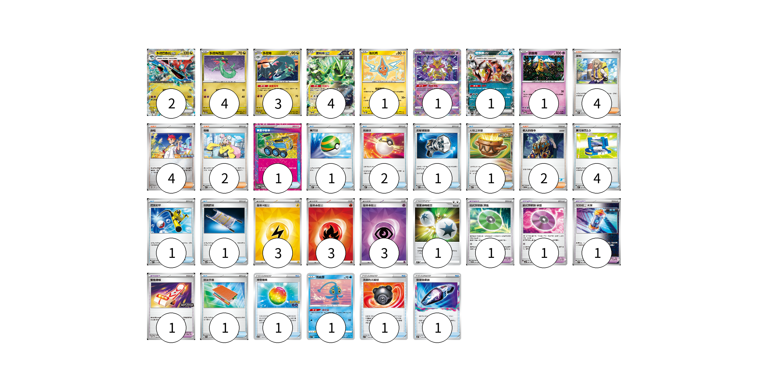 牌組構築方案 以此牌組為基礎新構築牌組 顯示卡面 顯示列表 寶可夢卡(18) 2 4 3 4 1 1 1 1 1 寶可夢道具(4) 1 1 1 1 物品卡(16) 1 1 2 1 1 4 1 1 1 1 1 1 支援者卡(12) 4 4 2 2 能量卡(10) 3 3 3 1 寶可夢卡(18) 卡牌名稱 張數 卡牌名稱 張數 多龍巴魯托ex SV6 081/101 02 多龍梅西亞 SV6 079/101 04 多龍奇 SV6 080/101 03 鐵荊棘ex SV5a 033/066 04 洛托姆 SV8 037/106 01 光輝胡地 S11a 031/068 01 奇麒麟ex SV5M 042/071 01 麒麟奇 SV5a 034/066 01 瑪納霏 SVF 003/038 01 寶可夢道具(4) 卡牌名稱 張數 卡牌名稱 張數 招式學習器 演進 SVTL 017/021 01 招式學習器 衰退 SV4K 063/066 01 驅勁能量 未來 SV4M 062/066 01 緊急滑板 SV-P 140/SV-P 01 物品卡(16) 卡牌名稱 張數 卡牌名稱 張數 貴重手推車 SVK 020/042 01 巢穴球 SVK 016/042 01 高級球 SVK 018/042 02 反擊捕捉器 SVK 009/042 01 大地之容器 SVK 012/042 01 寶可裝置3.0 SVK 021/042 04 厲害釣竿 SVK 011/042 01 夜間擔架 SV6a 056/064 01 朋友手冊 SVK 014/042 01 神奇糖果 S10b 066/071 01 洗翠的沉重球 SVF 019/038 01 放逐吸塵器 SVB 016/028 01 支援者卡(12) 卡牌名稱 張數 卡牌名稱 張數 派帕 SVK 035/042 04 赤松 SV-P 150/SV-P 04 奇樹 SVK 031/042 02 老大的指令 SVI 066/066 02 能量卡(10) 卡牌名稱 張數 卡牌名稱 張數 基本【雷】能量 SVK LIG 03 基本【火】能量 SVK FIR 03 基本【超】能量 SVK PSY 03 雙重渦輪能量 SVTM 022/022 01 以此牌組為基礎新構築牌組 牌組編碼 BhyLkm-ySQBbK-yZTwtH copy 列印牌組單 牌組編碼已複製 分享至SNS