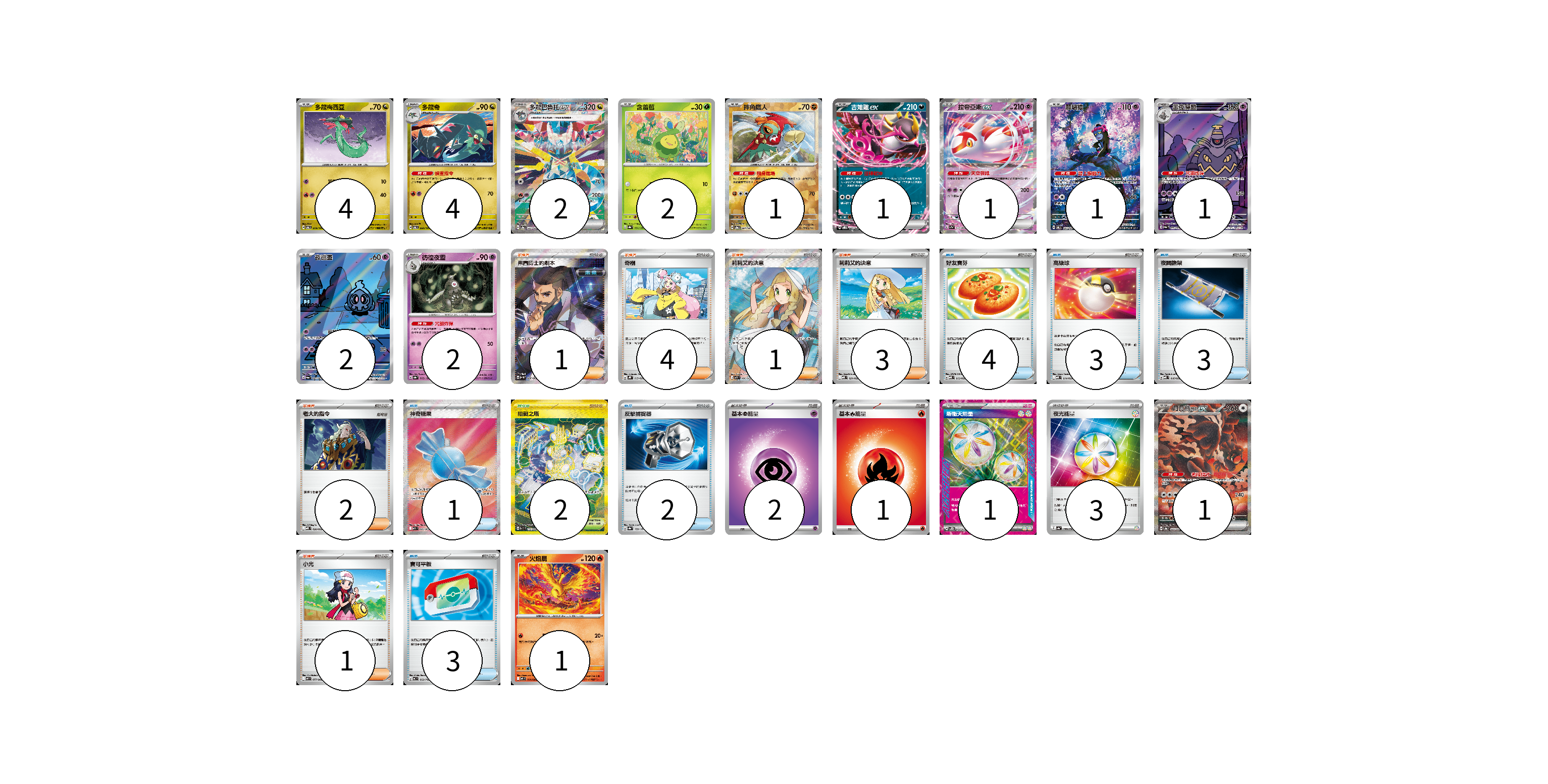 牌組構築方案 以此牌組為基礎新構築牌組 顯示卡面 顯示列表 寶可夢卡(23) 4 4 2 2 1 1 1 1 1 2 2 1 1 物品卡(16) 4 3 3 1 2 3 支援者卡(12) 1 4 1 3 2 1 競技場卡(2) 2 能量卡(7) 2 1 1 3 寶可夢卡(23) 卡牌名稱 張數 卡牌名稱 張數 多龍梅西亞 SV6 079/101 04 多龍奇 SV6 080/101 04 多龍巴魯托ex SV8a 221/187 02 含羞苞 SV8a 001/187 02 摔角鷹人 SV8a 084/187 01 吉雉雞ex SVOD 004/020 01 拉帝亞斯ex SV7a 019/064 01 願增猿 SV6 107/101 01 黑夜魔靈 SV6a 070/064 01 夜巡靈 SV6a 068/064 02 彷徨夜靈 SV8a 065/187 02 月月熊 赫月ex SV8a 225/187 01 火焰鳥 M2 014/080 01 物品卡(16) 卡牌名稱 張數 卡牌名稱 張數 好友寶芬 MBD 013/022 04 高級球 MBD 014/022 03 夜間擔架 MBD 016/022 03 神奇糖果 M1S 082/063 01 反擊捕捉器 SV8a 139/187 02 寶可平板 MC 662/742 03 支援者卡(12) 卡牌名稱 張數 卡牌名稱 張數 弗圖博士的劇本 SV4M 086/066 01 奇樹 SVHK 019/022 04 莉莉艾的決意 M1L 086/063 01 莉莉艾的決意 MBD 021/022 03 老大的指令 MBD 020/022 02 小光 M2 077/080 01 競技場卡(2) 卡牌名稱 張數 卡牌名稱 張數 阻礙之塔 SV10 132/098 02 能量卡(7) 卡牌名稱 張數 卡牌名稱 張數 基本【超】能量 M-P PSY 02 基本【火】能量 M-P FIR 01 新衝天能量 SV5K 071/071 01 夜光能量 SV4a 190/190 03 以此牌組為基礎新構築牌組 牌組編碼 BiIKOh-ttSkoD-HTxtOG copy 列印牌組單 牌組編碼已複製 分享至SNS