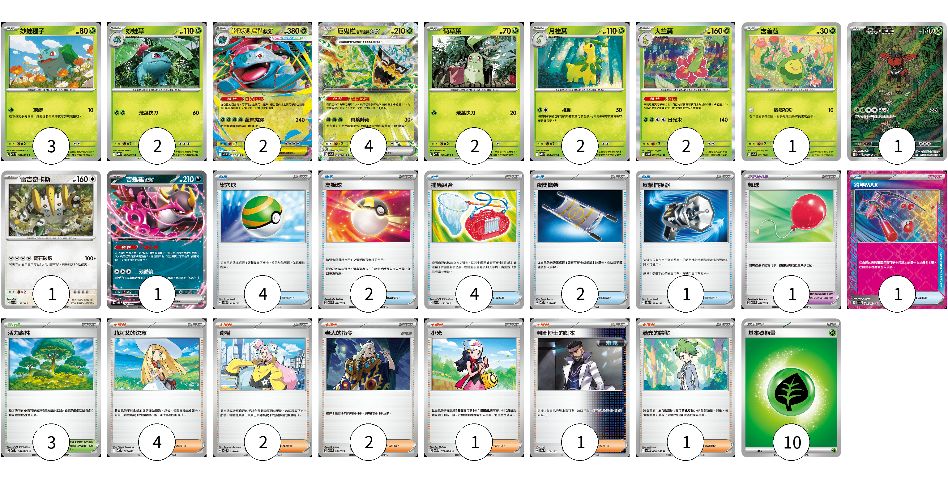 牌組構築方案 以此牌組為基礎新構築牌組 顯示卡面 顯示列表 寶可夢卡(21) 3 2 2 4 2 2 2 1 1 1 1 寶可夢道具(1) 1 物品卡(14) 4 2 4 2 1 1 支援者卡(11) 4 2 2 1 1 1 競技場卡(3) 3 能量卡(10) 10 寶可夢卡(21) 卡牌名稱 張數 卡牌名稱 張數 妙蛙種子 M1L 001/063 03 妙蛙草 M1L 002/063 02 超級妙蛙花ex M1L 003/063 02 厄鬼椪 碧草面具ex SV8a 020/187 04 菊草葉 M1S 003/063 02 月桂葉 M1S 004/063 02 大竺葵 M1S 005/063 02 含羞苞 SV8a 001/187 01 卡璞・哞哞 SV6a 065/064 01 雷吉奇卡斯 SV8a 132/187 01 吉雉雞ex SVOD 004/020 01 寶可夢道具(1) 卡牌名稱 張數 卡牌名稱 張數 氣球 MBD 018/022 01 物品卡(14) 卡牌名稱 張數 卡牌名稱 張數 巢穴球 SVM 133/175 04 高級球 MBD 014/022 02 捕蟲組合 SV8a 150/187 04 夜間擔架 MBD 016/022 02 反擊捕捉器 SV8a 139/187 01 釣竿MAX SV8a 142/187 01 支援者卡(11) 卡牌名稱 張數 卡牌名稱 張數 莉莉艾的決意 MBD 021/022 04 奇樹 SVOD 016/020 02 老大的指令 MBD 020/022 02 小光 M2 077/080 01 弗圖博士的劇本 SV8a 175/187 01 滿充的體貼 M1S 060/063 01 競技場卡(3) 卡牌名稱 張數 卡牌名稱 張數 活力森林 M1S 061/063 03 能量卡(10) 卡牌名稱 張數 卡牌名稱 張數 基本【草】能量 M-P GRA 10 以此牌組為基礎新構築牌組 牌組編碼 BiLUYs-UtSkdY-HQJGJI copy 列印牌組單 牌組編碼已複製 分享至SNS