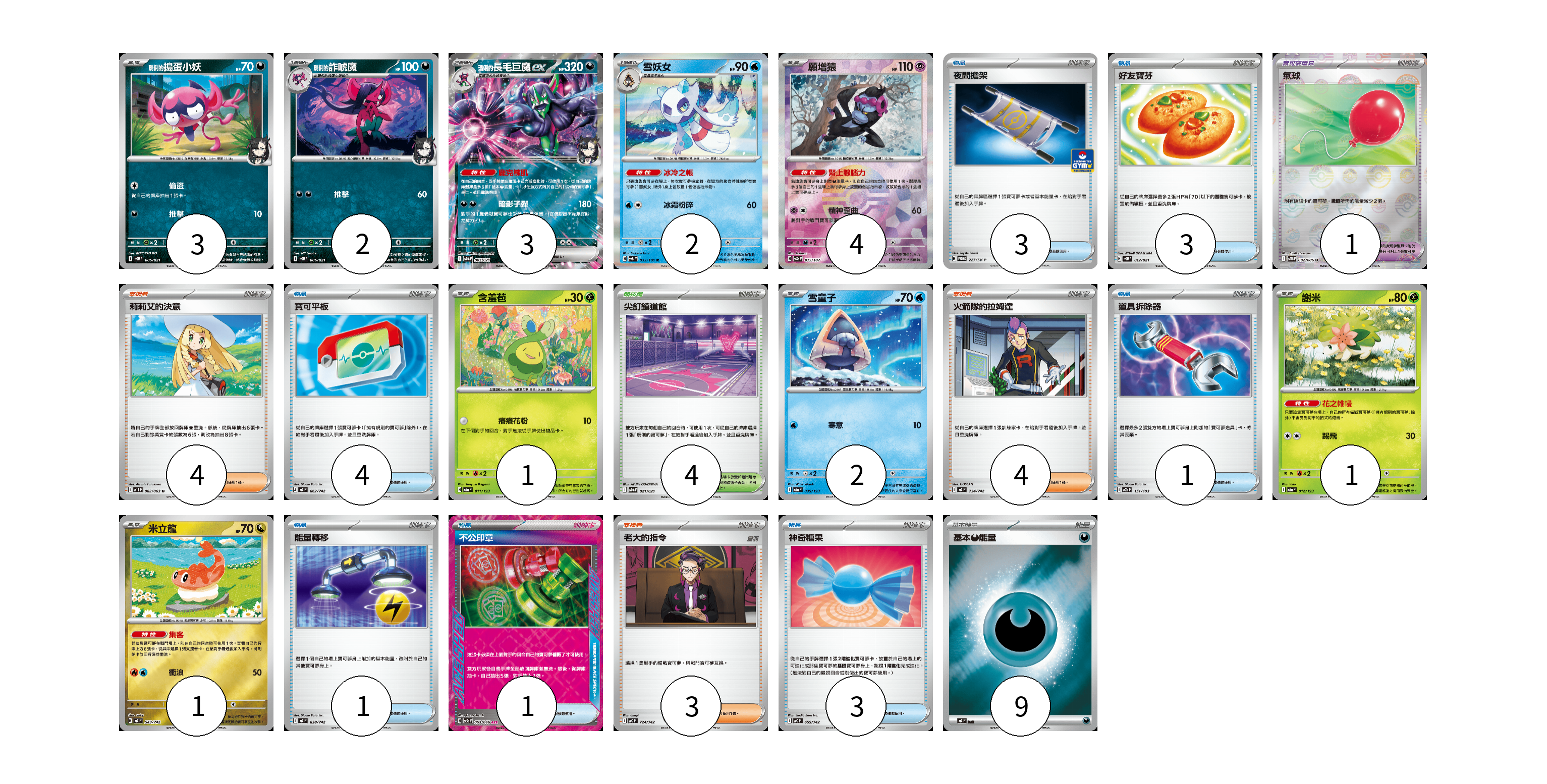 牌組構築方案 以此牌組為基礎新構築牌組 顯示卡面 顯示列表 寶可夢卡(19) 3 2 3 2 4 1 2 1 1 寶可夢道具(1) 1 物品卡(16) 3 3 4 1 1 1 3 支援者卡(11) 4 4 3 競技場卡(4) 4 能量卡(9) 9 寶可夢卡(19) 卡牌名稱 張數 卡牌名稱 張數 <瑪俐的>搗蛋小妖 SVOM 005/021 03 <瑪俐的>詐唬魔 SVOM 006/021 02 <瑪俐的>長毛巨魔ex SVOM 007/021 03 雪妖女 SV6 033/101 02 願增猿 SV8a 075/187 04 含羞苞 M2a 011/193 01 雪童子 M2a 035/193 02 謝米 M2a 012/193 01 米立龍 MC 549/742 01 寶可夢道具(1) 卡牌名稱 張數 卡牌名稱 張數 氣球 SV11B 082/086 01 物品卡(16) 卡牌名稱 張數 卡牌名稱 張數 夜間擔架 SV-P 227/SV-P 03 好友寶芬 SVOM 012/021 03 寶可平板 MC 662/742 04 道具拆除器 M2a 151/193 01 能量轉移 MC 638/742 01 不公印章 SV5a 053/066 01 神奇糖果 MC 655/742 03 支援者卡(11) 卡牌名稱 張數 卡牌名稱 張數 莉莉艾的決意 M1L 062/063 04 火箭隊的拉姆達 MC 734/742 04 老大的指令 MC 724/742 03 競技場卡(4) 卡牌名稱 張數 卡牌名稱 張數 尖釘鎮道館 SVOM 021/021 04 能量卡(9) 卡牌名稱 張數 卡牌名稱 張數 基本【惡】能量 MC DAR 09 以此牌組為基礎新構築牌組 牌組編碼 BkGIBo-KCPVgU-zlSCQv copy 列印牌組單 牌組編碼已複製 分享至SNS