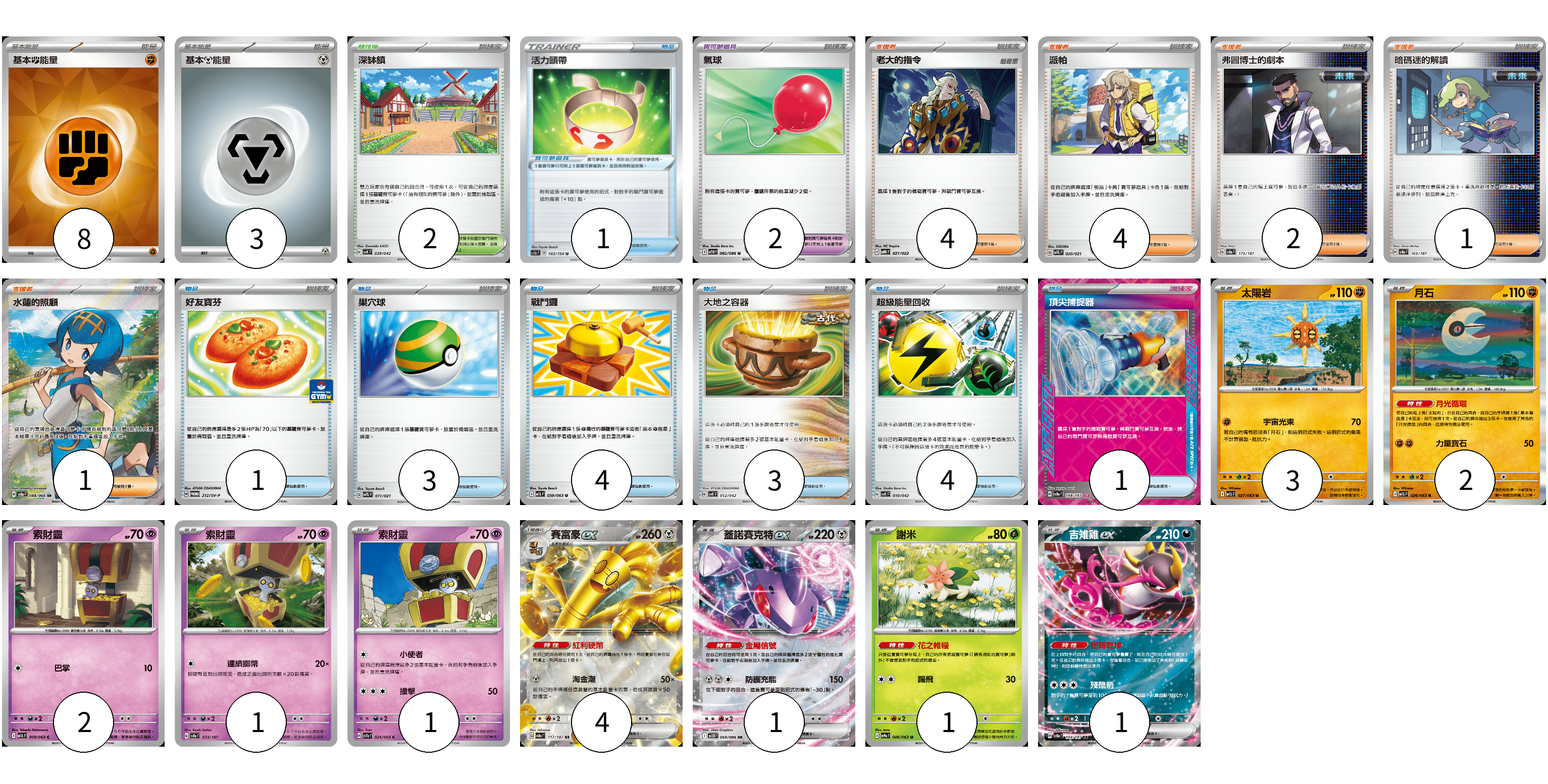 牌組構築方案 以此牌組為基礎新構築牌組 顯示卡面 顯示列表 寶可夢卡(16) 3 2 2 1 1 4 1 1 1 寶可夢道具(3) 1 2 物品卡(16) 1 3 4 3 4 1 支援者卡(12) 4 4 2 1 1 競技場卡(2) 2 能量卡(11) 8 3 寶可夢卡(16) 卡牌名稱 張數 卡牌名稱 張數 太陽岩 M1L 027/063 03 月石 M1L 026/063 02 索財靈 M1L 019/063 02 索財靈 SV8a 073/187 01 索財靈 SV7a 024/064 01 賽富豪ex SV8a 117/187 04 蓋諾賽克特ex SV11B 069/086 01 謝米 SV9a 006/063 01 吉雉雞ex SV8a 104/187 01 寶可夢道具(3) 卡牌名稱 張數 卡牌名稱 張數 活力頭帶 SC1a 143/154 01 氣球 SV11B 082/086 02 物品卡(16) 卡牌名稱 張數 卡牌名稱 張數 好友寶芬 SV-P 212/SV-P 01 巢穴球 SVTL 011/021 03 戰鬥鑼 M1L 059/063 04 大地之容器 SVK 012/042 03 超級能量回收 SVK 010/042 04 頂尖捕捉器 SV8a 148/187 01 支援者卡(12) 卡牌名稱 張數 卡牌名稱 張數 老大的指令 MBG 021/022 04 派帕 SVTL 020/021 04 弗圖博士的劇本 SV8a 175/187 02 暗碼迷的解讀 SV8a 165/187 01 水蓮的照顧 SV5a 088/066 01 競技場卡(2) 卡牌名稱 張數 卡牌名稱 張數 深缽鎮 SVK 039/042 02 能量卡(11) 卡牌名稱 張數 卡牌名稱 張數 基本【鬥】能量 SVM FIG 08 基本【鋼】能量 SVTH MET 03 以此牌組為基礎新構築牌組 牌組編碼 BkOtmS-xWuHsj-IjpXoZ copy 列印牌組單 牌組編碼已複製 分享至SNS