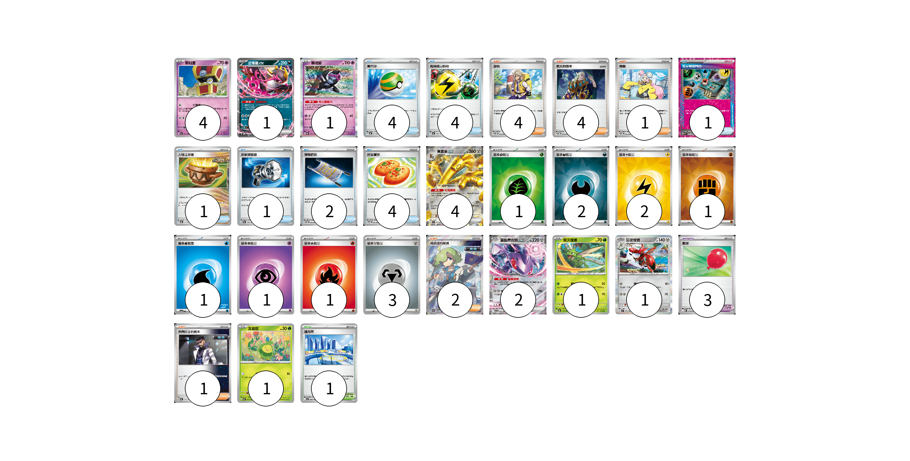 牌組構築方案 以此牌組為基礎新構築牌組 顯示卡面 顯示列表 寶可夢卡(15) 4 1 1 4 2 1 1 1 寶可夢道具(3) 3 物品卡(17) 4 4 1 1 1 2 4 支援者卡(12) 4 4 1 2 1 競技場卡(1) 1 能量卡(12) 1 2 2 1 1 1 1 3 寶可夢卡(15) 卡牌名稱 張數 卡牌名稱 張數 索財靈 SV7a 024/064 04 吉雉雞ex SVOD 004/020 01 願增猿 SV8a 075/187 01 賽富豪ex SV3a 050/062 04 蓋諾賽克特ex SV11B 069/086 02 飛天螳螂 SV2a 123/165 01 巨鉗螳螂 SV3 077/108 01 含羞苞 SV8a 001/187 01 寶可夢道具(3) 卡牌名稱 張數 卡牌名稱 張數 氣球 MBD 018/022 03 物品卡(17) 卡牌名稱 張數 卡牌名稱 張數 巢穴球 SVHK 012/022 04 超級能量回收 SV4a 157/190 04 能量輸送PRO SV7a 052/064 01 大地之容器 SVHK 011/022 01 反擊捕捉器 SV8a 139/187 01 夜間擔架 SVOM 016/021 02 好友寶芬 SVOD 011/020 04 支援者卡(12) 卡牌名稱 張數 卡牌名稱 張數 派帕 SVOD 018/020 04 老大的指令 SVOD 019/020 04 奇樹 SVOD 016/020 01 暗碼迷的解讀 SV5M 090/071 02 弗圖博士的劇本 SV8a 175/187 01 競技場卡(1) 卡牌名稱 張數 卡牌名稱 張數 釀光市 SV9 098/100 01 能量卡(12) 卡牌名稱 張數 卡牌名稱 張數 基本【草】能量 SVK GRA 01 基本【惡】能量 SVK DAR 02 基本【雷】能量 SVK LIG 02 基本【鬥】能量 SVK FIG 01 基本【水】能量 SVI WAT 01 基本【超】能量 SVTS PSY 01 基本【火】能量 SVHK FIR 01 基本【鋼】能量 SVTH MET 03 以此牌組為基礎新構築牌組 牌組編碼 BlXzGE-OjnkJR-uRQeaS copy 列印牌組單 牌組編碼已複製 分享至SNS
