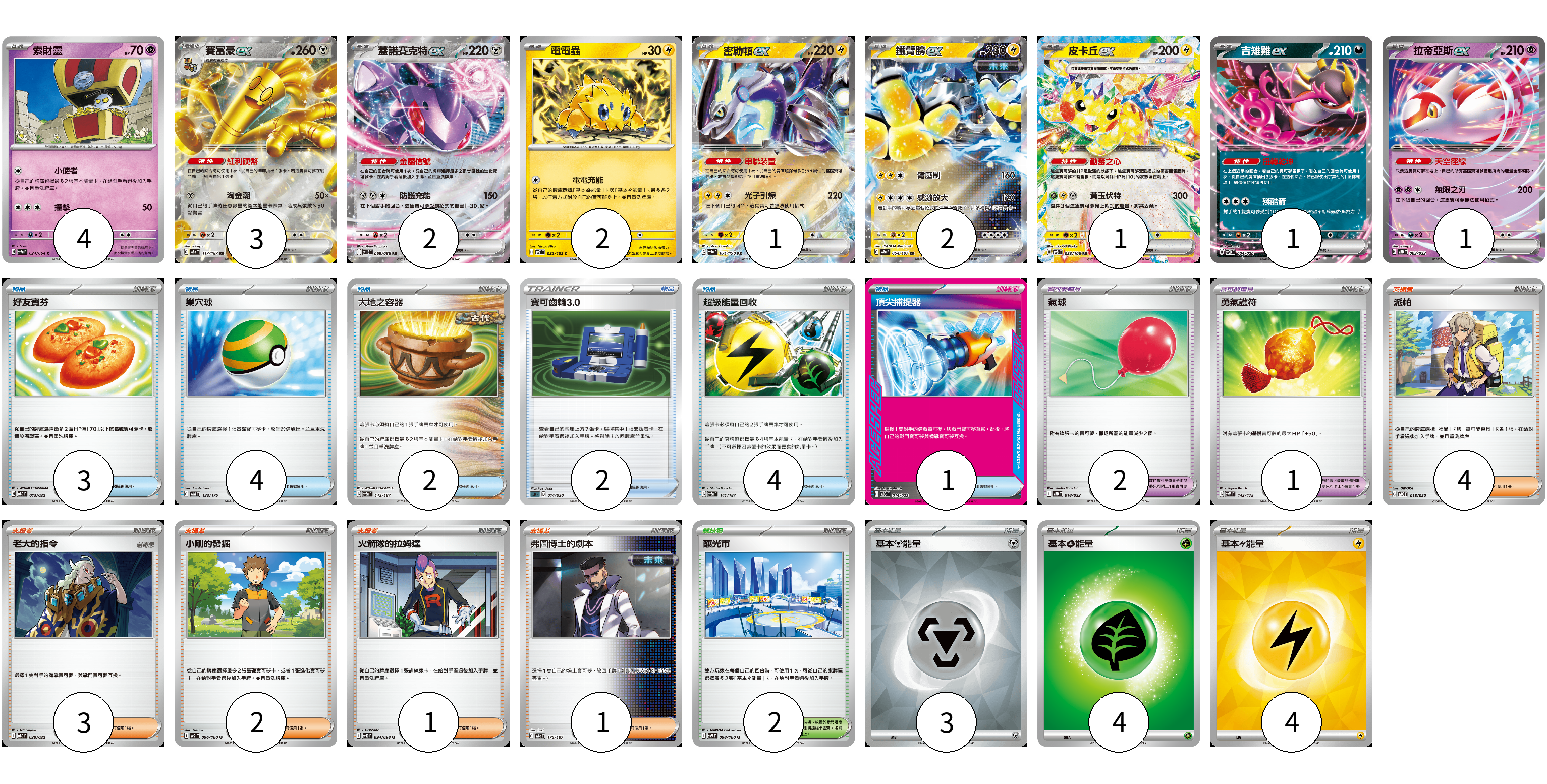牌組構築方案 以此牌組為基礎新構築牌組 顯示卡面 顯示列表 寶可夢卡(17) 4 3 2 2 1 2 1 1 1 寶可夢道具(3) 2 1 物品卡(16) 3 4 2 2 4 1 支援者卡(11) 4 3 2 1 1 競技場卡(2) 2 能量卡(11) 3 4 4 寶可夢卡(17) 卡牌名稱 張數 卡牌名稱 張數 索財靈 SV7a 024/064 04 賽富豪ex SV8a 117/187 03 蓋諾賽克特ex SV11B 069/086 02 電電蟲 SV7 032/102 02 密勒頓ex SV4a 071/190 01 鐵臂膀ex SV8a 054/187 02 皮卡丘ex SV8 033/106 01 吉雉雞ex SVOD 004/020 01 拉帝亞斯ex MBD 003/022 01 寶可夢道具(3) 卡牌名稱 張數 卡牌名稱 張數 氣球 MBD 018/022 02 勇氣護符 SVM 142/175 01 物品卡(16) 卡牌名稱 張數 卡牌名稱 張數 好友寶芬 MBD 013/022 03 巢穴球 SVM 133/175 04 大地之容器 SV8a 143/187 02 寶可齒輪3.0 SLD 014/020 02 超級能量回收 SV8a 141/187 04 頂尖捕捉器 MBG 014/022 01 支援者卡(11) 卡牌名稱 張數 卡牌名稱 張數 派帕 SVOD 018/020 04 老大的指令 MBD 020/022 03 小剛的發掘 SV9 096/100 02 火箭隊的拉姆達 SV10 094/098 01 弗圖博士的劇本 SV8a 175/187 01 競技場卡(2) 卡牌名稱 張數 卡牌名稱 張數 釀光市 SV9 098/100 02 能量卡(11) 卡牌名稱 張數 卡牌名稱 張數 基本【鋼】能量 SVOD MET 03 基本【草】能量 M-P GRA 04 基本【雷】能量 SVQP LIG 04 以此牌組為基礎新構築牌組 牌組編碼 BlhypO-BBeumg-nyXdCS copy 列印牌組單 牌組編碼已複製 分享至SNS