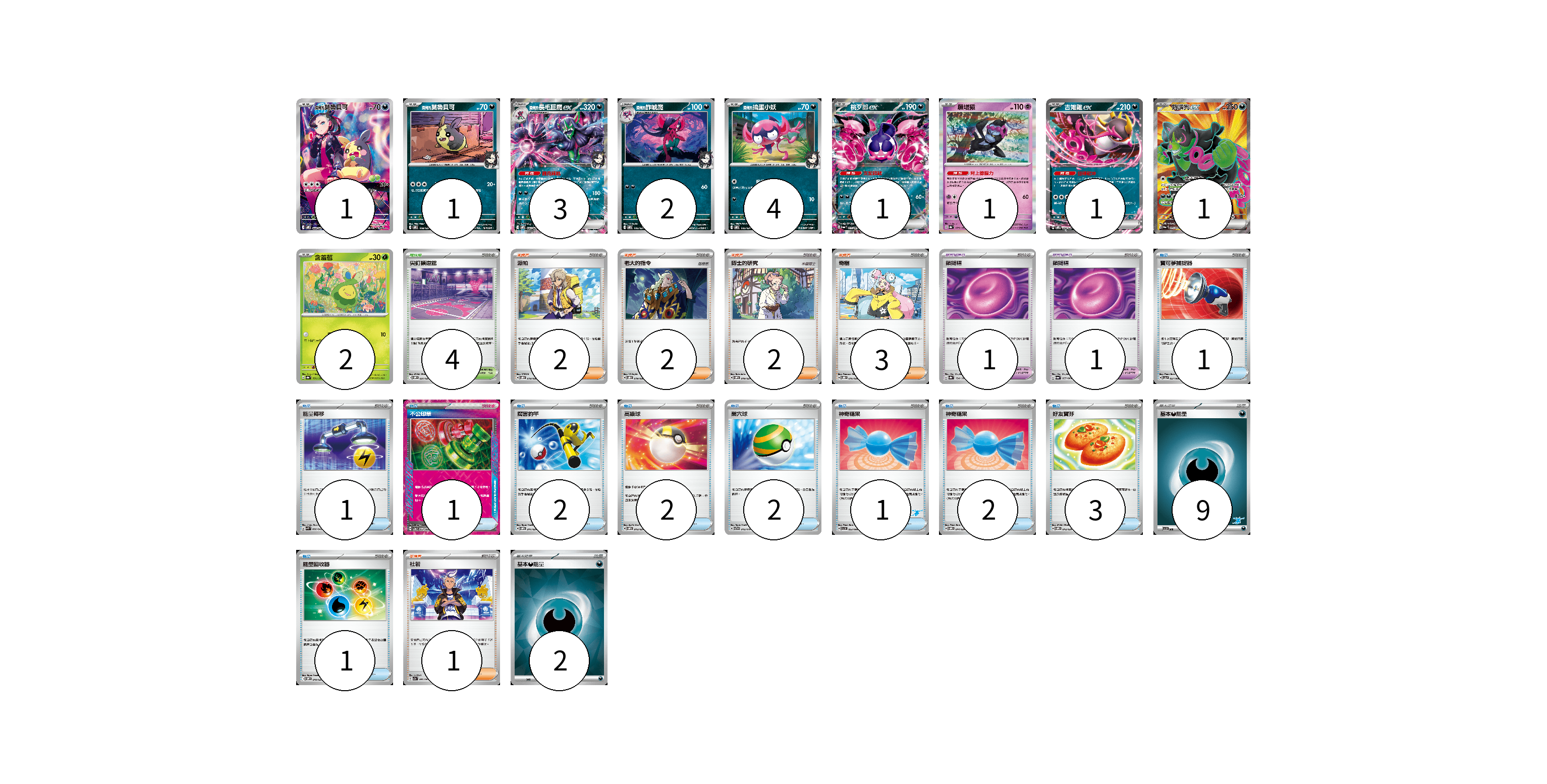 牌組構築方案 以此牌組為基礎新構築牌組 顯示卡面 顯示列表 寶可夢卡(17) 1 1 3 2 4 1 1 1 1 2 寶可夢道具(2) 1 1 物品卡(16) 1 1 1 2 2 2 1 2 3 1 支援者卡(10) 2 2 2 3 1 競技場卡(4) 4 能量卡(11) 9 2 寶可夢卡(17) 卡牌名稱 張數 卡牌名稱 張數 <瑪俐的>莫魯貝可 SVOM 022/021 01 <瑪俐的>莫魯貝可 SVOM 008/021 01 <瑪俐的>長毛巨魔ex SVOM 007/021 03 <瑪俐的>詐唬魔 SVOM 006/021 02 <瑪俐的>搗蛋小妖 SVOM 005/021 04 桃歹郎ex SV6a 039/064 01 願增猿 SV8a 075/187 01 吉雉雞ex SVOM 009/021 01 夠讚狗ex SV6a 079/064 01 含羞苞 SV8a 001/187 02 寶可夢道具(2) 卡牌名稱 張數 卡牌名稱 張數 鎖鏈糬 SV8a 154/187 01 鎖鏈糬 SV6a 057/064 01 物品卡(16) 卡牌名稱 張數 卡牌名稱 張數 寶可夢捕捉器 SV5a 057/066 01 能量轉移 SVK 008/042 01 不公印章 SV5a 053/066 01 厲害釣竿 SVOM 011/021 02 高級球 SVOM 013/021 02 巢穴球 SVTG 012/019 02 神奇糖果 SVI 053/066 01 神奇糖果 SVOM 014/021 02 好友寶芬 SVOM 012/021 03 能量回收器 SVOM 010/021 01 支援者卡(10) 卡牌名稱 張數 卡牌名稱 張數 派帕 SVOD 018/020 02 老大的指令 SVOD 019/020 02 博士的研究 SVOM 019/021 02 奇樹 SVOD 016/020 03 杜若 SV7a 060/064 01 競技場卡(4) 卡牌名稱 張數 卡牌名稱 張數 尖釘鎮道館 SVOM 021/021 04 能量卡(11) 卡牌名稱 張數 卡牌名稱 張數 基本【惡】能量 SVI DAR 09 基本【惡】能量 SVOM DAR 02 以此牌組為基礎新構築牌組 牌組編碼 BmoFap-iMAFSB-EbETIA copy 列印牌組單 牌組編碼已複製 分享至SNS