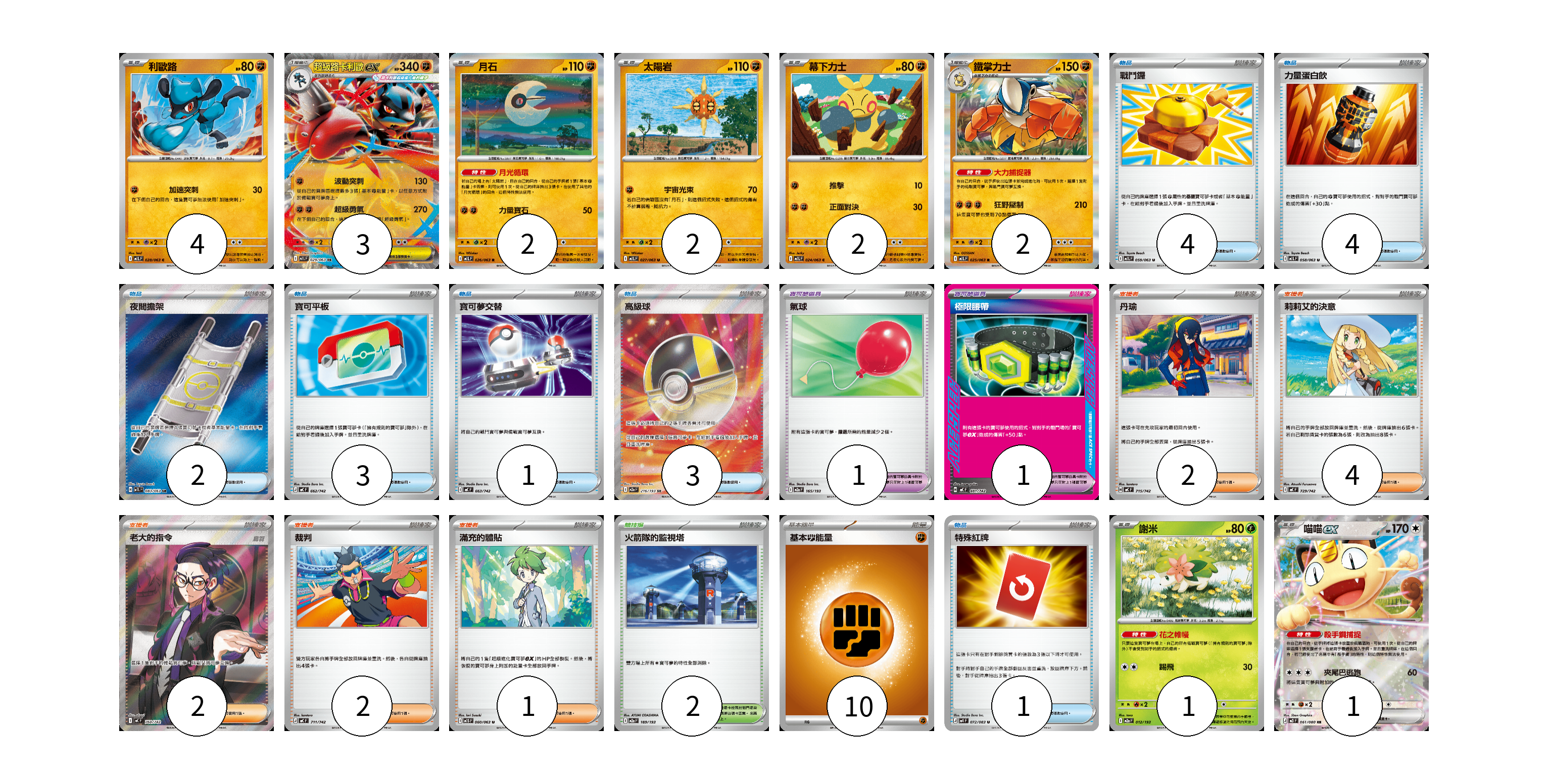 牌組構築方案 以此牌組為基礎新構築牌組 顯示卡面 顯示列表 寶可夢卡(17) 4 3 2 2 2 2 1 1 寶可夢道具(2) 1 1 物品卡(18) 4 4 2 3 1 3 1 支援者卡(11) 2 4 2 2 1 競技場卡(2) 2 能量卡(10) 10 寶可夢卡(17) 卡牌名稱 張數 卡牌名稱 張數 利歐路 M1L 028/063 04 超級路卡利歐ex M1L 029/063 03 月石 M1L 026/063 02 太陽岩 M1L 027/063 02 幕下力士 M1L 024/063 02 鐵掌力士 M1L 025/063 02 謝米 M2a 012/193 01 喵喵ex M3 061/080 01 寶可夢道具(2) 卡牌名稱 張數 卡牌名稱 張數 氣球 M2a 165/193 01 極限腰帶 MC 691/742 01 物品卡(18) 卡牌名稱 張數 卡牌名稱 張數 戰鬥鑼 M1L 059/063 04 力量蛋白飲 M1L 058/063 04 夜間擔架 M1L 083/063 02 寶可平板 MC 662/742 03 寶可夢交替 MC 663/742 01 高級球 M2a 216/193 03 特殊紅牌 M4 072/083 01 支援者卡(11) 卡牌名稱 張數 卡牌名稱 張數 丹瑜 MC 715/742 02 莉莉艾的決意 MC 729/742 04 老大的指令(烏羽) MC 760/742 02 裁判 MC 711/742 02 滿充的體貼 M1S 060/063 01 競技場卡(2) 卡牌名稱 張數 卡牌名稱 張數 火箭隊的監視塔 M2a 189/193 02 能量卡(10) 卡牌名稱 張數 卡牌名稱 張數 基本【鬥】能量 MC FIG 10 以此牌組為基礎新構築牌組 牌組編碼 BmsitH-ATZPOi-ljubBU copy 列印牌組單 牌組編碼已複製 分享至SNS