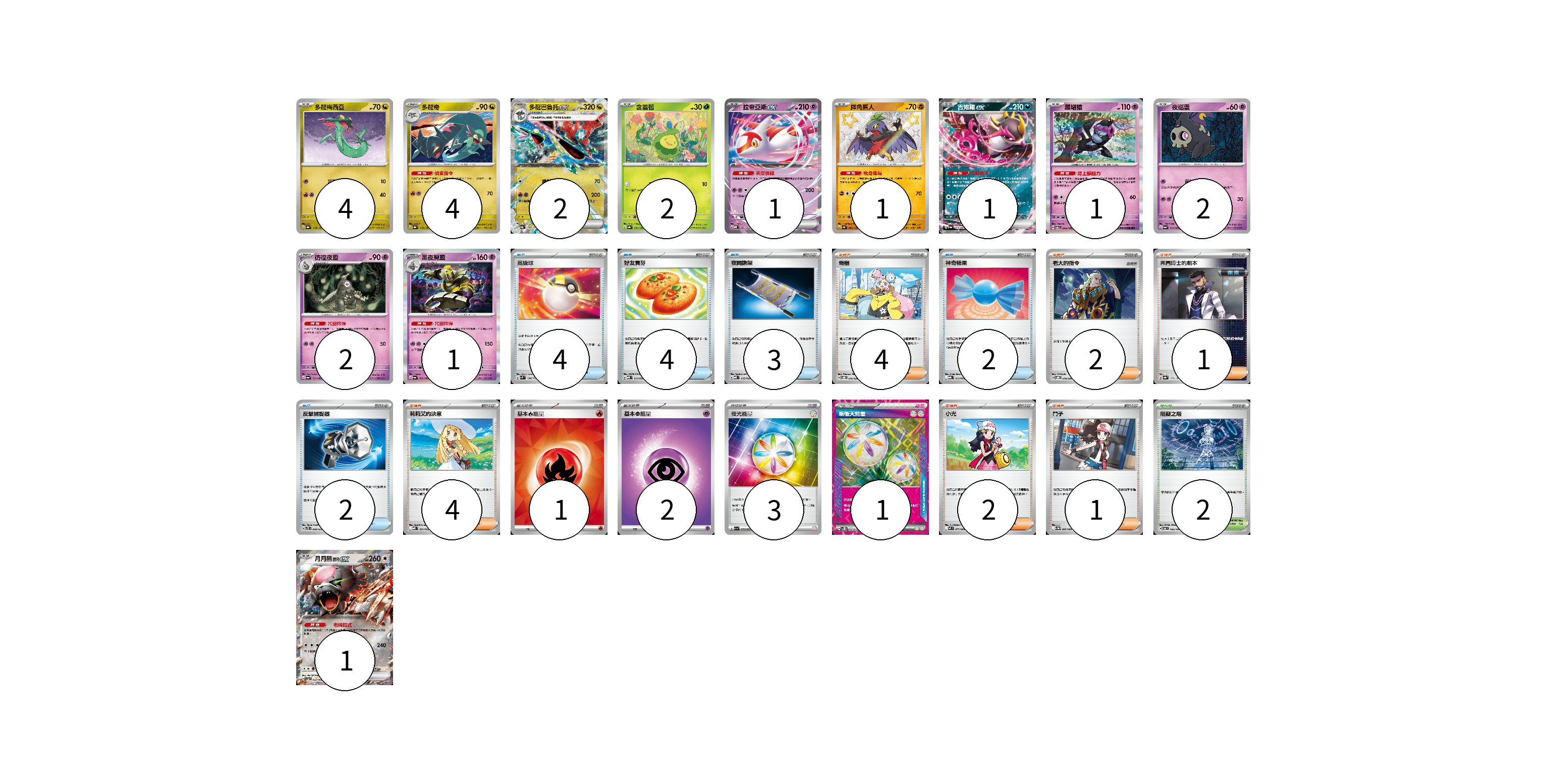 牌組構築方案 以此牌組為基礎新構築牌組 顯示卡面 顯示列表 寶可夢卡(22) 4 4 2 2 1 1 1 1 2 2 1 1 物品卡(15) 4 4 3 2 2 支援者卡(14) 4 2 1 4 2 1 競技場卡(2) 2 能量卡(7) 1 2 3 1 寶可夢卡(22) 卡牌名稱 張數 卡牌名稱 張數 多龍梅西亞 SV8a 118/187 04 多龍奇 SV8a 119/187 04 多龍巴魯托ex SV8a 120/187 02 含羞苞 SV8a 001/187 02 拉帝亞斯ex MBD 003/022 01 摔角鷹人 SV4a 282/190 01 吉雉雞ex SV6a 038/064 01 願增猿 SV6 055/101 01 夜巡靈 SV6a 018/064 02 彷徨夜靈 SV6a 019/064 02 黑夜魔靈 SV6a 020/064 01 月月熊 赫月 ex SV5a 052/066 01 物品卡(15) 卡牌名稱 張數 卡牌名稱 張數 高級球 SVM 134/175 04 好友寶芬 MBD 013/022 04 夜間擔架 MBD 016/022 03 神奇糖果 MBG 013/022 02 反擊捕捉器 SVTS 009/022 02 支援者卡(14) 卡牌名稱 張數 卡牌名稱 張數 奇樹 SVOD 016/020 04 老大的指令 SVOD 019/020 02 弗圖博士的劇本 SV8a 175/187 01 莉莉艾的決意 MBD 021/022 04 小光 M2 077/080 02 鬥子 SV11W 085/086 01 競技場卡(2) 卡牌名稱 張數 卡牌名稱 張數 阻礙之塔 SV6 100/101 02 能量卡(7) 卡牌名稱 張數 卡牌名稱 張數 基本【火】能量 SVQL FIR 01 基本【超】能量 MBD PSY 02 夜光能量 SV1a 073/073 03 新衝天能量 SV5K 071/071 01 以此牌組為基礎新構築牌組 牌組編碼 BnFIlI-RSAeQZ-KDNIBs copy 列印牌組單 牌組編碼已複製 分享至SNS
