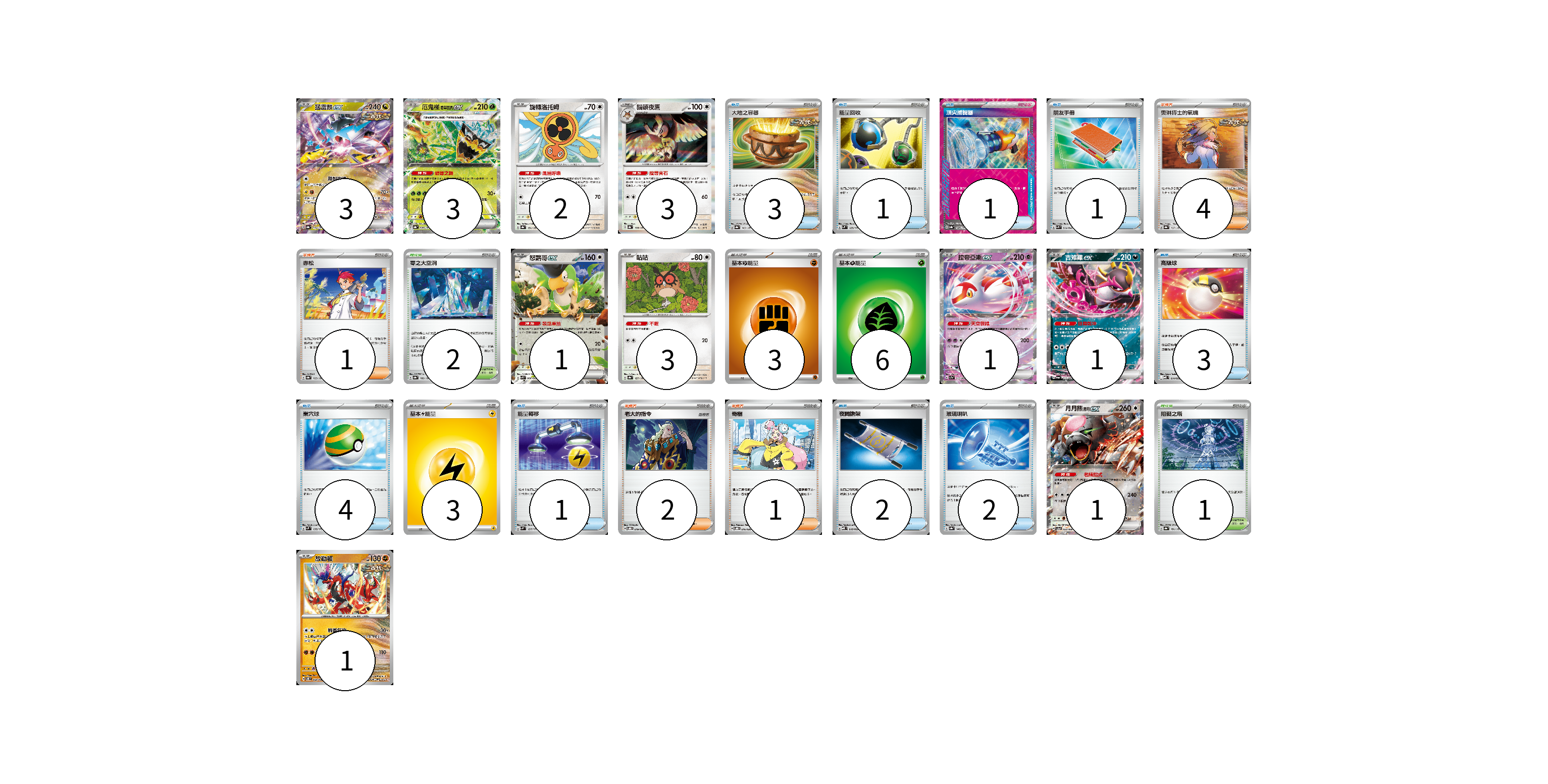 牌組構築方案 以此牌組為基礎新構築牌組 顯示卡面 顯示列表 寶可夢卡(19) 3 3 2 3 1 3 1 1 1 1 物品卡(18) 3 1 1 1 3 4 1 2 2 支援者卡(8) 4 1 2 1 競技場卡(3) 2 1 能量卡(12) 3 6 3 寶可夢卡(19) 卡牌名稱 張數 卡牌名稱 張數 猛雷鼓ex SV8a 124/187 03 厄鬼椪 碧草面具ex SV8a 020/187 03 旋轉洛托姆 SV8a 131/187 02 貓頭夜鷹 SV8a 128/187 03 怒鸚哥ex SVK 006/042 01 咕咕 SV8a 127/187 03 拉帝亞斯ex SV7a 019/064 01 吉雉雞ex SV6a 038/064 01 月月熊 赫月 ex SV5a 052/066 01 故勒頓 SV8 069/106 01 物品卡(18) 卡牌名稱 張數 卡牌名稱 張數 大地之容器 SV8a 143/187 03 能量回收 SVM 125/175 01 頂尖捕捉器 SV8a 148/187 01 朋友手冊 SVK 014/042 01 高級球 MBD 014/022 03 巢穴球 SVM 133/175 04 能量轉移 SVM 127/175 01 夜間擔架 MBD 016/022 02 玻璃喇叭 SV8a 140/187 02 支援者卡(8) 卡牌名稱 張數 卡牌名稱 張數 奧琳博士的氣魄 SV8a 167/187 04 赤松 SV8a 163/187 01 老大的指令 SVOD 019/020 02 奇樹 SVOD 016/020 01 競技場卡(3) 卡牌名稱 張數 卡牌名稱 張數 零之大空洞 SV8a 182/187 02 阻礙之塔 SV8a 181/187 01 能量卡(12) 卡牌名稱 張數 卡牌名稱 張數 基本鬥能量 sv-p FIG 03 基本草能量 sv-p GRA 06 基本雷能量 sv-p LIG 03 以此牌組為基礎新構築牌組 牌組編碼 BqdJxj-UougFx-EPljAt copy 列印牌組單 牌組編碼已複製 分享至SNS