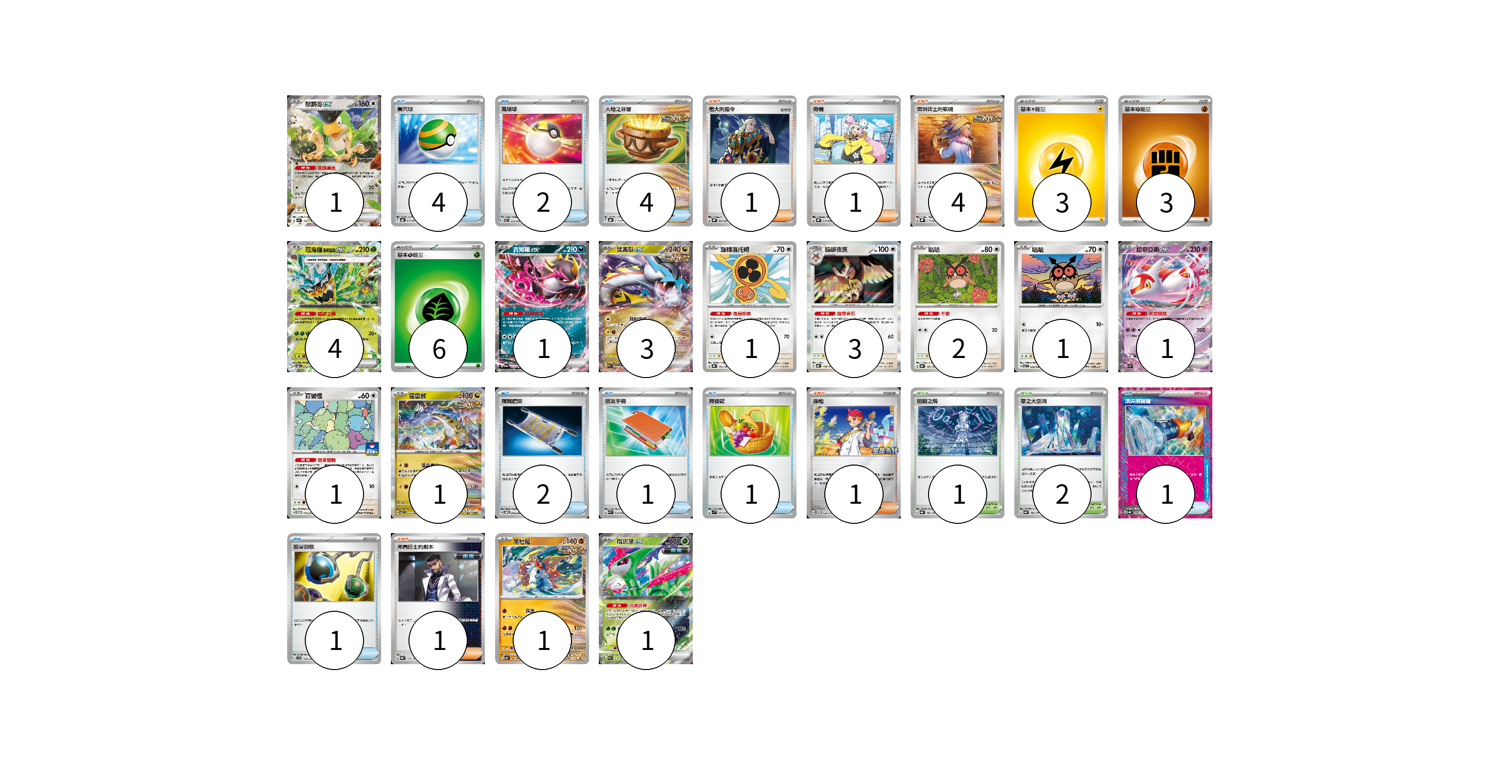 牌組構築方案 以此牌組為基礎新構築牌組 顯示卡面 顯示列表 寶可夢卡(21) 1 4 1 3 1 3 2 1 1 1 1 1 1 物品卡(16) 4 2 4 2 1 1 1 1 支援者卡(8) 1 1 4 1 1 競技場卡(3) 1 2 能量卡(12) 3 3 6 寶可夢卡(21) 卡牌名稱 張數 卡牌名稱 張數 怒鸚哥ex SV4a 154/190 01 厄鬼椪 碧草面具ex SV6 016/101 04 吉雉雞ex SV6a 038/064 01 猛雷鼓ex SV5K 053/071 03 旋轉洛托姆 SV8a 131/187 01 貓頭夜鷹 SV8a 128/187 03 咕咕 SV8a 127/187 02 咕咕 SV7 076/102 01 拉帝亞斯ex SV7a 019/064 01 百變怪 SV-P 111/SV-P 01 猛雷鼓 SV7 075/102 01 爬地翅 SV4K 041/066 01 鐵斑葉ex SV5M 016/071 01 物品卡(16) 卡牌名稱 張數 卡牌名稱 張數 巢穴球 SVHK 012/022 04 高級球 SVEL 012/020 02 大地之容器 SVHK 011/022 04 夜間擔架 SVOM 016/021 02 朋友手冊 SVK 014/042 01 野餐籃 SV1V 071/078 01 頂尖捕捉器 SV8a 148/187 01 能量回收 SVD 110/139 01 支援者卡(8) 卡牌名稱 張數 卡牌名稱 張數 老大的指令 SVHK 022/022 01 奇樹 SVHK 019/022 01 奧琳博士的氣魄 SVHK 017/022 04 赤松 SV-P 150/SV-P 01 弗圖博士的劇本 SV8a 175/187 01 競技場卡(3) 卡牌名稱 張數 卡牌名稱 張數 阻礙之塔 SV8a 181/187 01 零之大空洞 SV8a 182/187 02 能量卡(12) 卡牌名稱 張數 卡牌名稱 張數 基本【雷】能量 SVHM LIG 03 基本【鬥】能量 SVHK FIG 03 基本草能量 sv-p GRA 06 以此牌組為基礎新構築牌組 牌組編碼 BriNMt-UeveGF-gVBtSC copy 列印牌組單 牌組編碼已複製 分享至SNS