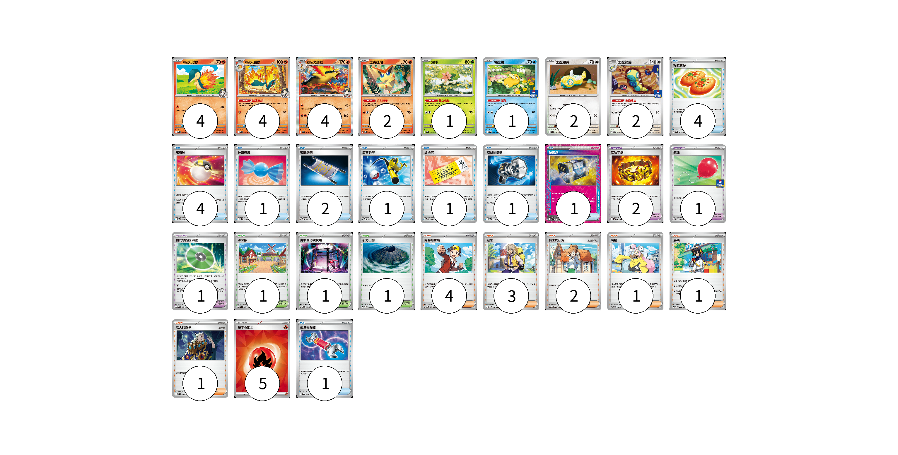 牌組構築方案 以此牌組為基礎新構築牌組 顯示卡面 顯示列表 寶可夢卡(20) 4 4 4 2 1 1 2 2 寶可夢道具(5) 2 1 1 1 物品卡(16) 4 4 1 2 1 1 1 1 1 支援者卡(11) 4 3 2 1 1 競技場卡(3) 1 1 1 能量卡(5) 5 寶可夢卡(20) 卡牌名稱 張數 卡牌名稱 張數 <阿響的>火球鼠 SV9a 015/063 04 <阿響的>火岩鼠 SV9a 016/063 04 <阿響的>火爆獸 SV9a 017/063 04 比克提尼 SV8 012/106 02 謝米 SV9a 006/063 01 可達鴨 SV-P 220/SV-P 01 土龍弟弟 SV9 078/100 02 土龍節節 M-P 045/M-P 02 寶可夢道具(5) 卡牌名稱 張數 卡牌名稱 張數 猛攻手鐲 SV11W 082/086 02 氣球 M-P 047/M-P 01 招式學習器 演進 SV8a 160/187 01 奇樹 SVTL 018/021 01 物品卡(16) 卡牌名稱 張數 卡牌名稱 張數 好友寶芬 MBD 013/022 04 高級球 SVQL 015/022 04 神奇糖果 MBG 013/022 01 夜間擔架 MBD 016/022 02 厲害釣竿 SVK 011/042 01 調換票 SV9 090/100 01 反擊捕捉器 SV8a 139/187 01 秘密箱 SV6 092/101 01 道具拆除器 SV11W 080/086 01 支援者卡(11) 卡牌名稱 張數 卡牌名稱 張數 阿響的冒險 SV9a 063/063 04 派帕 SVOD 018/020 03 博士的研究 SV11B 084/086 02 烏栗 SV6 096/101 01 老大的指令 SVTG 019/019 01 競技場卡(3) 卡牌名稱 張數 卡牌名稱 張數 深缽鎮 SVK 039/042 01 對戰圓形競技場 M2 079/080 01 引力山岳 SV8 106/106 01 能量卡(5) 卡牌名稱 張數 卡牌名稱 張數 基本【火】能量 SVQL FIR 05 以此牌組為基礎新構築牌組 牌組編碼 BxVEsl-slgkJL-RqMATc copy 列印牌組單 牌組編碼已複製 分享至SNS