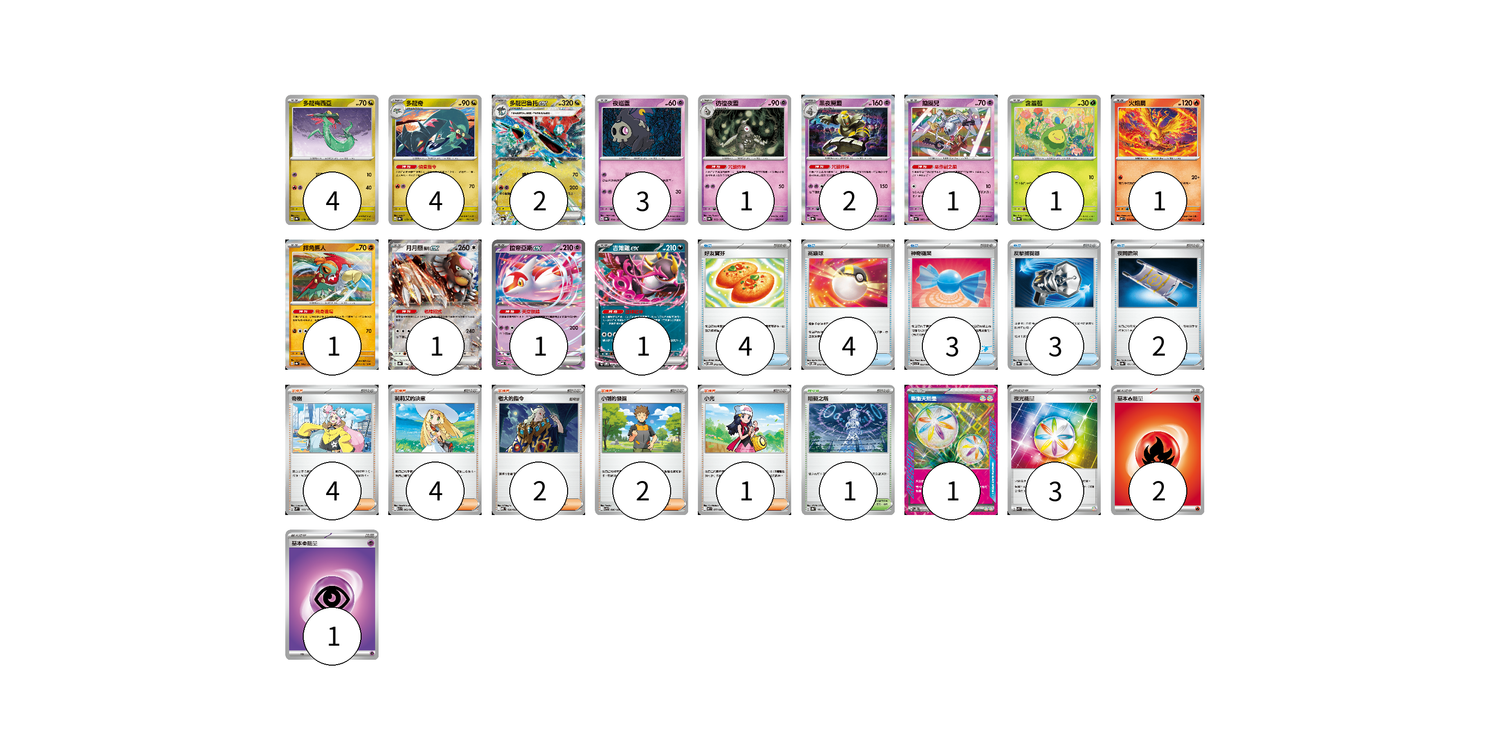 牌組構築方案 以此牌組為基礎新構築牌組 顯示卡面 顯示列表 寶可夢卡(23) 4 4 2 3 1 2 1 1 1 1 1 1 1 物品卡(16) 4 4 3 3 2 支援者卡(13) 4 4 2 2 1 競技場卡(1) 1 能量卡(7) 1 3 2 1 寶可夢卡(23) 卡牌名稱 張數 卡牌名稱 張數 多龍梅西亞 SV8a 118/187 04 多龍奇 SV8a 119/187 04 多龍巴魯托ex SV8a 120/187 02 夜巡靈 SV8a 064/187 03 彷徨夜靈 SV8a 065/187 01 黑夜魔靈 SV8a 066/187 02 鑰圈兒 SV4a 087/190 01 含羞苞 SV8a 001/187 01 火焰鳥 M2 014/080 01 摔角鷹人 SV8a 084/187 01 月月熊 赫月ex SV8a 134/187 01 拉帝亞斯ex MBD 003/022 01 吉雉雞ex SVOM 009/021 01 物品卡(16) 卡牌名稱 張數 卡牌名稱 張數 好友寶芬 SVOM 012/021 04 高級球 SVOD 012/020 04 神奇糖果 SVI 053/066 03 反擊捕捉器 SV8a 139/187 03 夜間擔架 SV8a 151/187 02 支援者卡(13) 卡牌名稱 張數 卡牌名稱 張數 奇樹 SVM 160/175 04 莉莉艾的決意 M1L 062/063 04 老大的指令 MBD 020/022 02 小剛的發掘 SV9 096/100 02 小光 M2 077/080 01 競技場卡(1) 卡牌名稱 張數 卡牌名稱 張數 阻礙之塔 SV8a 181/187 01 能量卡(7) 卡牌名稱 張數 卡牌名稱 張數 新衝天能量 SV5K 071/071 01 夜光能量 SVK 042/042 03 基本火能量 sv-p FIR 02 基本超能量 sv-p PSY 01 以此牌組為基礎新構築牌組 牌組編碼 BxeEBc-UbpzmL-vBBYgj copy 列印牌組單 牌組編碼已複製 分享至SNS