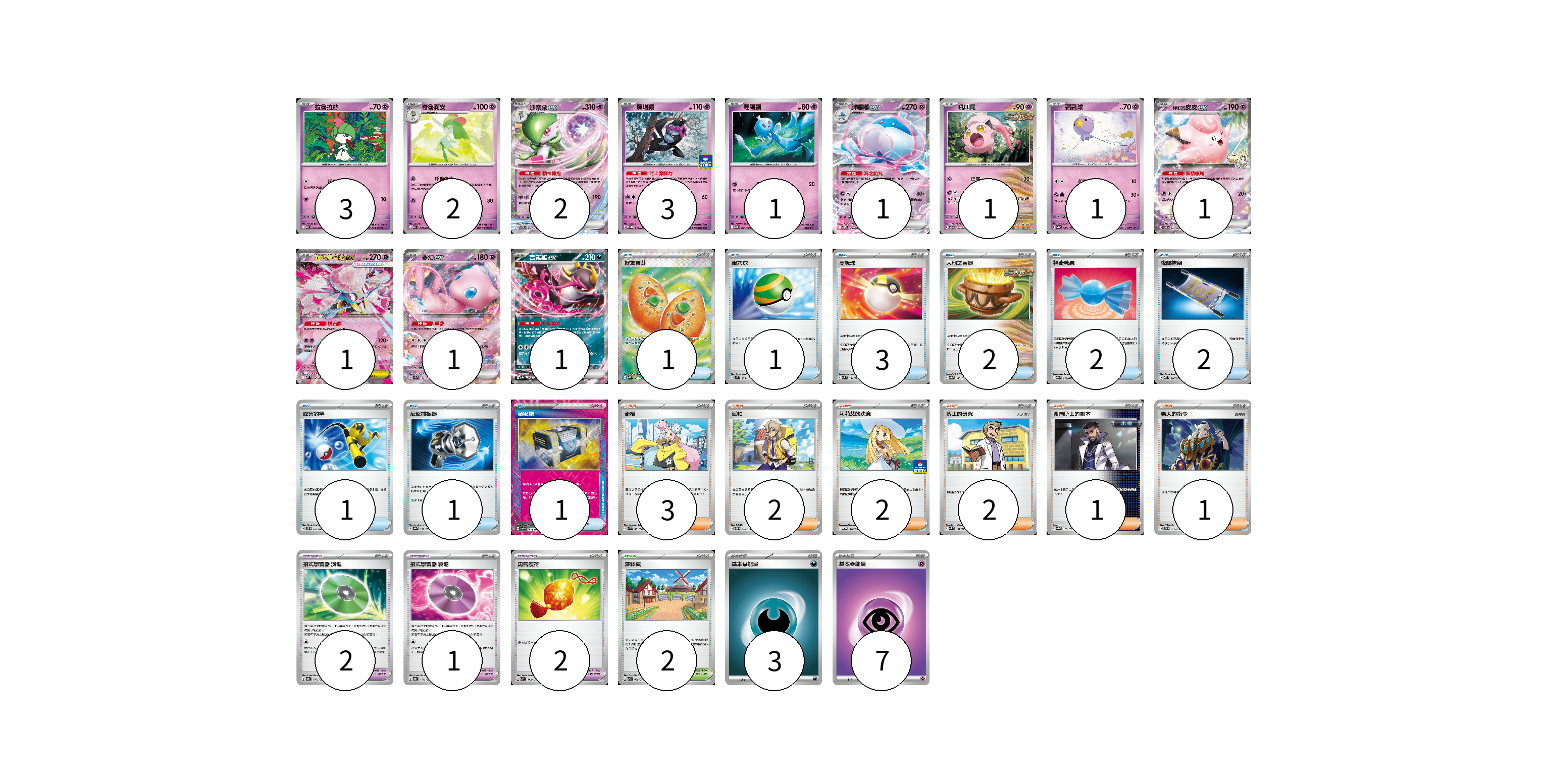 牌組構築方案 以此牌組為基礎新構築牌組 顯示卡面 顯示列表 寶可夢卡(18) 3 2 2 3 1 1 1 1 1 1 1 1 寶可夢道具(5) 2 1 2 物品卡(14) 1 1 3 2 2 2 1 1 1 支援者卡(11) 3 2 2 2 1 1 競技場卡(2) 2 能量卡(10) 3 7 寶可夢卡(18) 卡牌名稱 張數 卡牌名稱 張數 拉魯拉絲 M1S 040/063 03 奇魯莉安 M1S 041/063 02 沙奈朵ex SVTS 004/022 02 願增猿 M-P 014/M-P 03 輕飄飄 SV11W 041/086 01 胖嘟嘟ex SV11W 042/086 01 吼叫尾 SVTS 007/022 01 飄飄球 SV4a 083/190 01 莉莉艾的皮皮ex SV9 033/100 01 超級蒂安希ex MBD 006/022 01 夢幻ex SV2a 151/165 01 吉雉雞ex SV8a 104/187 01 寶可夢道具(5) 卡牌名稱 張數 卡牌名稱 張數 招式學習器 演進 SV8a 160/187 02 招式學習器 衰退 SV8a 161/187 01 勇氣護符 SVM 142/175 02 物品卡(14) 卡牌名稱 張數 卡牌名稱 張數 好友寶芬 M1S 081/063 01 巢穴球 SVM 133/175 01 高級球 SVM 134/175 03 大地之容器 SV8a 143/187 02 神奇糖果 MBG 013/022 02 夜間擔架 MBD 016/022 02 厲害釣竿 SVTS 010/022 01 反擊捕捉器 SV8a 139/187 01 秘密箱 SV6 092/101 01 支援者卡(11) 卡牌名稱 張數 卡牌名稱 張數 奇樹 SVK 031/042 03 派帕 SVTM 019/022 02 莉莉艾的決意 M-P 018/M-P 02 博士的研究 SVM 162/175 02 弗圖博士的劇本 SV8a 175/187 01 老大的指令 SVTH 017/018 01 競技場卡(2) 卡牌名稱 張數 卡牌名稱 張數 深缽鎮 SVK 039/042 02 能量卡(10) 卡牌名稱 張數 卡牌名稱 張數 基本【惡】能量 SVF DAR 03 基本【超】能量 SVEM PSY 07 以此牌組為基礎新構築牌組 牌組編碼 BzTjCp-vCnPWb-WHjSGq copy 列印牌組單 牌組編碼已複製 分享至SNS