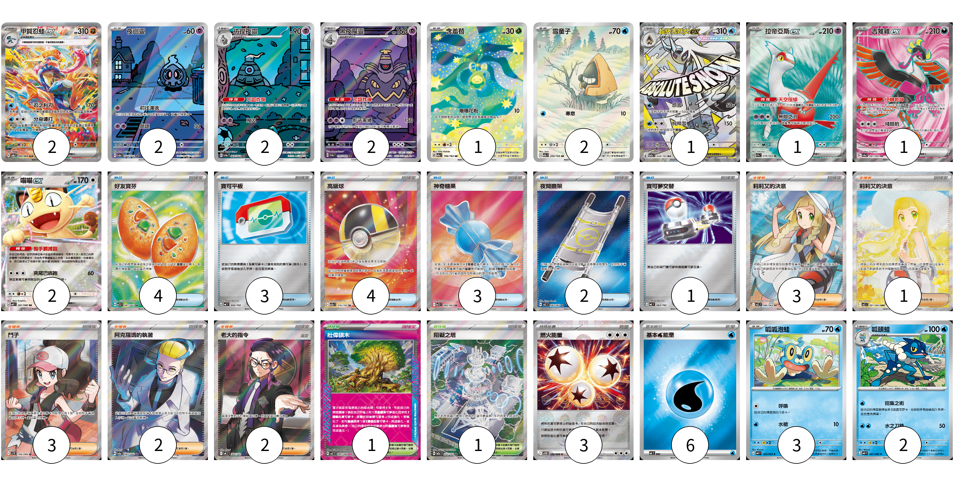 牌組構築方案 以此牌組為基礎新構築牌組 顯示卡面 顯示列表 寶可夢卡(21) 2 2 2 2 1 2 1 1 1 2 3 2 物品卡(17) 4 3 4 3 2 1 支援者卡(11) 3 1 3 2 2 競技場卡(2) 1 1 能量卡(9) 3 6 寶可夢卡(21) 卡牌名稱 張數 卡牌名稱 張數 甲賀忍蛙ex SV5a 090/066 02 夜巡靈 SV6a 068/064 02 彷徨夜靈 SV6a 069/064 02 黑夜魔靈 SV6a 070/064 02 含羞苞 M2a 196/193 01 雪童子 M2a 200/193 02 超級雪妖女ex M2a 224/193 01 拉帝亞斯ex SV7a 078/064 01 吉雉雞ex SV6a 081/064 01 喵喵ex M3 061/080 02 呱呱泡蛙 M4 020/083 03 呱頭蛙 M4 021/083 02 物品卡(17) 卡牌名稱 張數 卡牌名稱 張數 好友寶芬 M1S 081/063 04 寶可平板 MC 662/742 03 高級球 M2a 216/193 04 神奇糖果 M1S 082/063 03 夜間擔架 M1L 083/063 02 寶可夢交替 MC 663/742 01 支援者卡(11) 卡牌名稱 張數 卡牌名稱 張數 莉莉艾的決意 M1L 086/063 03 莉莉艾的決意 M1L 091/063 01 鬥子 SV11W 166/086 03 阿克羅瑪的執著 SV6a 083/064 02 老大的指令(烏羽) MC 760/742 02 競技場卡(2) 卡牌名稱 張數 卡牌名稱 張數 壯偉碩木 SV7 101/102 01 阻礙之塔 M2a 222/193 01 能量卡(9) 卡牌名稱 張數 卡牌名稱 張數 燃火能量 SV11W 086/086 03 基本【水】能量 MC WAT 06 以此牌組為基礎新構築牌組 牌組編碼 CBYOzc-qoJqdZ-XFmcOf copy 列印牌組單 牌組編碼已複製 分享至SNS