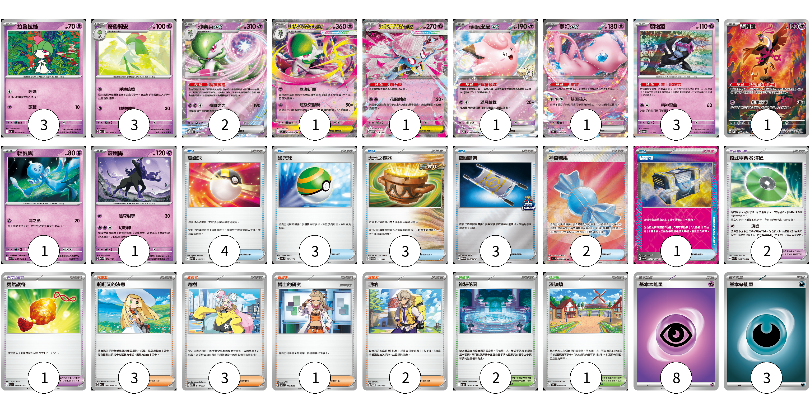 牌組構築方案 以此牌組為基礎新構築牌組 顯示卡面 顯示列表 寶可夢卡(18) 3 3 2 1 1 1 1 3 1 1 1 寶可夢道具(3) 2 1 物品卡(16) 4 3 3 3 2 1 支援者卡(9) 3 3 1 2 競技場卡(3) 2 1 能量卡(11) 8 3 寶可夢卡(18) 卡牌名稱 張數 卡牌名稱 張數 拉魯拉絲 M1S 040/063 03 奇魯莉安 M1S 041/063 03 沙奈朵ex SVTS 004/022 02 超級沙奈朵ex M1S 042/063 01 超級蒂安希ex MBD 006/022 01 莉莉艾的皮皮ex SV9 033/100 01 夢幻ex SVK 001/042 01 願增猿 SV8a 075/187 03 吉雉雞 SV6 108/101 01 輕飄飄 SV11W 041/086 01 靈幽馬 M2a 080/193 01 寶可夢道具(3) 卡牌名稱 張數 卡牌名稱 張數 招式學習器 演進 SV4M 063/066 02 勇氣護符 SV2D 067/071 01 物品卡(16) 卡牌名稱 張數 卡牌名稱 張數 高級球 SVTS 014/022 04 巢穴球 SVM 133/175 03 大地之容器 SVTS 011/022 03 夜間擔架 SV-P 204/SV-P 03 神奇糖果 M1S 082/063 02 秘密箱 SV6 092/101 01 支援者卡(9) 卡牌名稱 張數 卡牌名稱 張數 莉莉艾的決意 M1L 062/063 03 奇樹 SVTS 018/022 03 博士的研究 SVTS 019/022 01 派帕 SVOD 018/020 02 競技場卡(3) 卡牌名稱 張數 卡牌名稱 張數 神秘花園 M1S 063/063 02 深缽鎮 SVK 039/042 01 能量卡(11) 卡牌名稱 張數 卡牌名稱 張數 基本【超】能量 SVTS PSY 08 基本惡能量 sv-p DAR 03 以此牌組為基礎新構築牌組 牌組編碼 CBYoNO-SJrcYe-ohqUwE copy 列印牌組單 牌組編碼已複製 分享至SNS