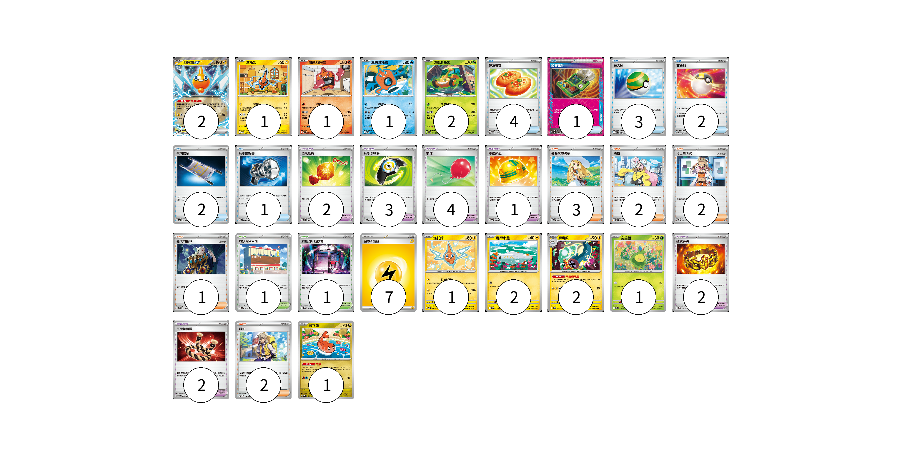 牌組構築方案 以此牌組為基礎新構築牌組 顯示卡面 顯示列表 寶可夢卡(14) 2 1 1 1 2 1 2 2 1 1 寶可夢道具(14) 2 3 4 1 2 2 物品卡(13) 4 1 3 2 2 1 支援者卡(10) 3 2 2 1 2 競技場卡(2) 1 1 能量卡(7) 7 寶可夢卡(14) 卡牌名稱 張數 卡牌名稱 張數 洛托姆ex M2 029/080 02 洛托姆 SV9a 039/063 01 加熱洛托姆 SV10 021/098 01 清洗洛托姆 SV10 028/098 01 切割洛托姆 SV10 004/098 02 洛托姆 SV8 037/106 01 麻麻小魚 SV11B 033/086 02 麻麻鰻 SV11B 034/086 02 含羞苞 SV8a 001/187 01 米立龍 SV8a 121/187 01 寶可夢道具(14) 卡牌名稱 張數 卡牌名稱 張數 勇氣護符 SVM 142/175 02 反擊增幅器 SV7a 059/064 03 氣球 MBD 018/022 04 幸運頭盔 SV5a 060/066 01 猛攻手鐲 SV11W 082/086 02 不服輸頭帶 SVTL 016/021 02 物品卡(13) 卡牌名稱 張數 卡牌名稱 張數 好友寶芬 MBG 011/022 04 珍寶配件 SV8a 146/187 01 巢穴球 SVM 133/175 03 高級球 SVTL 012/021 02 夜間擔架 SV6a 056/064 02 反擊捕捉器 SVK 009/042 01 支援者卡(10) 卡牌名稱 張數 卡牌名稱 張數 莉莉艾的決意 MBG 022/022 03 奇樹 SVOM 018/021 02 博士的研究 SVK 032/042 02 老大的指令 SVK 036/042 01 派帕 SVOD 018/020 02 競技場卡(2) 卡牌名稱 張數 卡牌名稱 張數 城鎮百貨公司 SV4a 183/190 01 對戰圓形競技場 M2 079/080 01 能量卡(7) 卡牌名稱 張數 卡牌名稱 張數 基本雷能量 sv-p LIG 07 以此牌組為基礎新構築牌組 牌組編碼 CCabSB-cadrHQ-HwvdHe copy 列印牌組單 牌組編碼已複製 分享至SNS