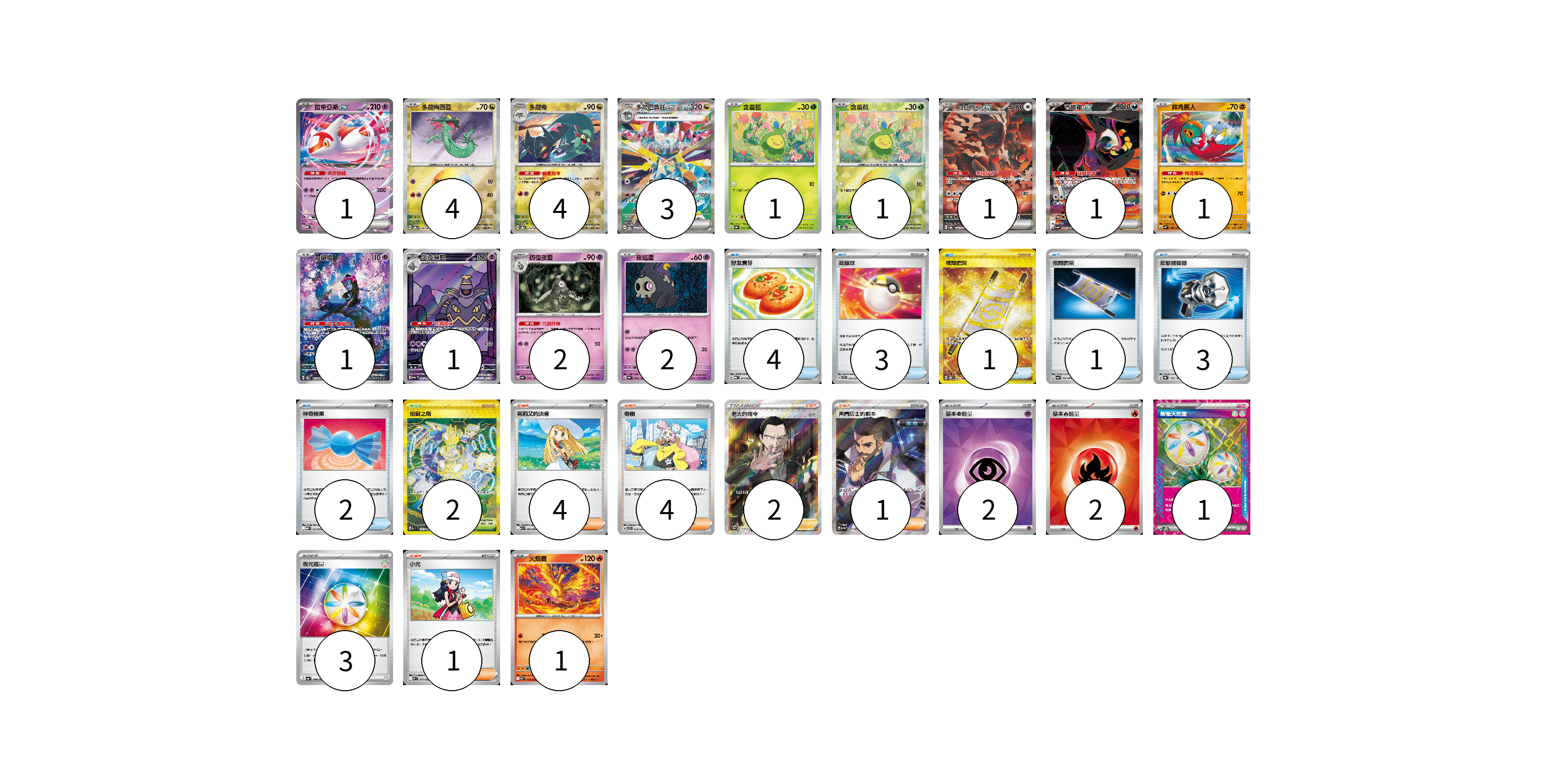 牌組構築方案 以此牌組為基礎新構築牌組 顯示卡面 顯示列表 寶可夢卡(24) 1 4 4 3 1 1 1 1 1 1 1 2 2 1 寶可夢道具(4) 4 物品卡(14) 4 3 1 1 3 2 支援者卡(8) 4 2 1 1 競技場卡(2) 2 能量卡(8) 2 2 1 3 寶可夢卡(24) 卡牌名稱 張數 卡牌名稱 張數 拉帝亞斯ex MBD 003/022 01 多龍梅西亞 SV8a 118/187 04 多龍奇 SV8a 119/187 04 多龍巴魯托ex SV8a 221/187 03 含羞苞 SV8a 001/187 01 含羞苞 SV8a 001/187 01 月月熊 赫月ex SV8a 225/187 01 吉雉雞ex SV6a 089/064 01 摔角鷹人 SV4a 106/190 01 願增猿 SV6 107/101 01 黑夜魔靈 SV6a 070/064 01 彷徨夜靈 SV8a 065/187 02 夜巡靈 SV8a 064/187 02 火焰鳥 M2 014/080 01 寶可夢道具(4) 卡牌名稱 張數 卡牌名稱 張數 奇樹 SVTL 018/021 04 物品卡(14) 卡牌名稱 張數 卡牌名稱 張數 好友寶芬 MBG 011/022 04 高級球 SVTL 012/021 03 夜間擔架 SV8 137/106 01 夜間擔架 SV6a 056/064 01 反擊捕捉器 SV8a 139/187 03 神奇糖果 MBG 013/022 02 支援者卡(8) 卡牌名稱 張數 卡牌名稱 張數 莉莉艾的決意 M1L 062/063 04 老大的指令(坂木) SC1b 170/153 02 弗圖博士的劇本 SV4M 086/066 01 小光 M2 077/080 01 競技場卡(2) 卡牌名稱 張數 卡牌名稱 張數 阻礙之塔 SV10 132/098 02 能量卡(8) 卡牌名稱 張數 卡牌名稱 張數 基本【超】能量 SVOD PSY 02 基本【火】能量 SVQL FIR 02 新衝天能量 SV5K 071/071 01 夜光能量 SV4a 190/190 03 以此牌組為基礎新構築牌組 牌組編碼 CCvewU-CuOqzr-jzjbCg copy 列印牌組單 牌組編碼已複製 分享至SNS