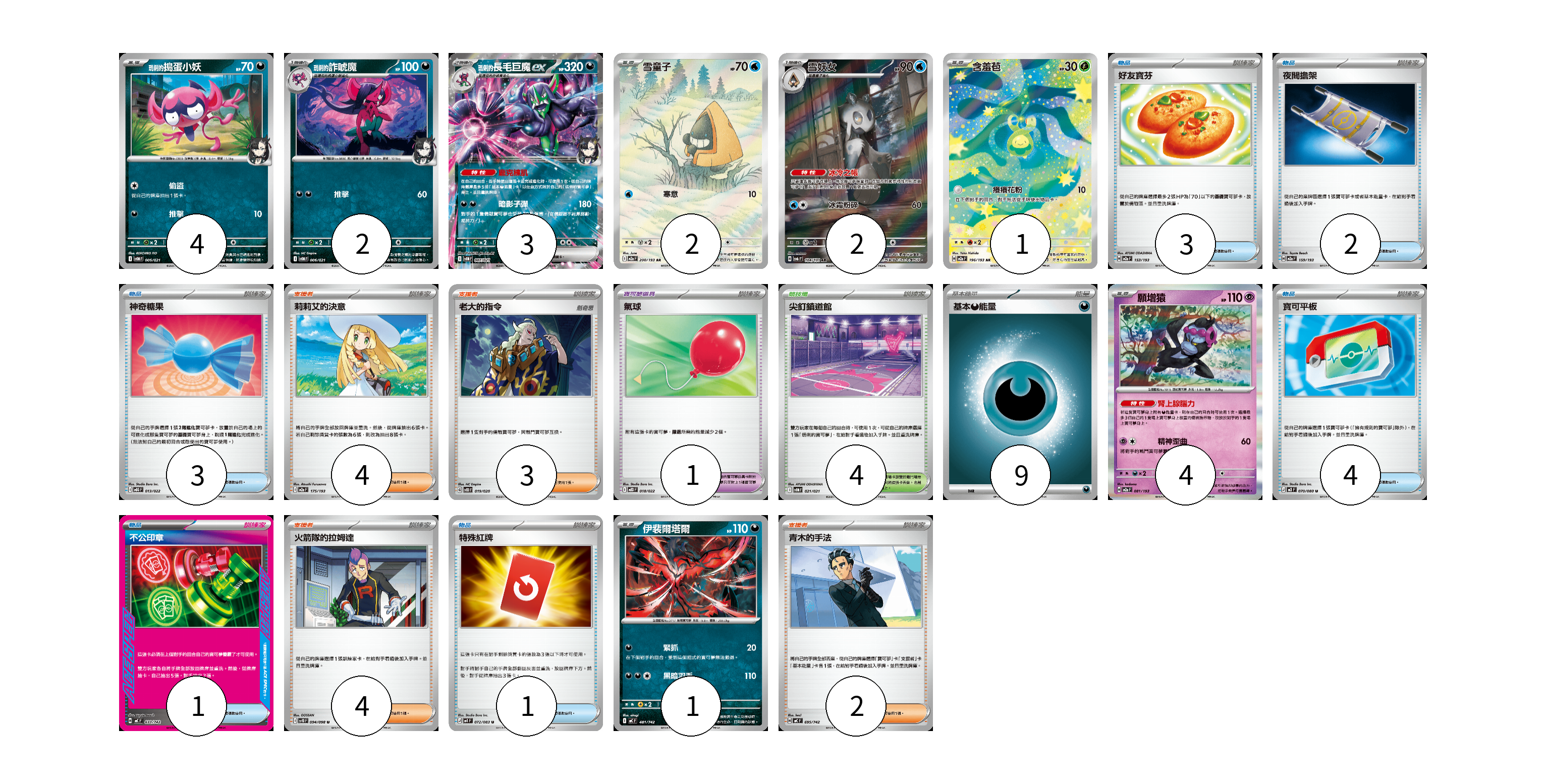 牌組構築方案 以此牌組為基礎新構築牌組 顯示卡面 顯示列表 寶可夢卡(19) 4 2 3 2 2 1 4 1 寶可夢道具(1) 1 物品卡(14) 3 2 3 4 1 1 支援者卡(13) 4 3 4 2 競技場卡(4) 4 能量卡(9) 9 寶可夢卡(19) 卡牌名稱 張數 卡牌名稱 張數 <瑪俐的>搗蛋小妖 SVOM 005/021 04 <瑪俐的>詐唬魔 SVOM 006/021 02 <瑪俐的>長毛巨魔ex SVOM 007/021 03 雪童子 M2a 200/193 02 雪妖女 SV6 104/101 02 含羞苞 M2a 196/193 01 願增猿 M2a 081/193 04 伊裴爾塔爾 MC 481/742 01 寶可夢道具(1) 卡牌名稱 張數 卡牌名稱 張數 氣球 MBD 018/022 01 物品卡(14) 卡牌名稱 張數 卡牌名稱 張數 好友寶芬 M2a 153/193 03 夜間擔架 M2a 159/193 02 神奇糖果 MBG 013/022 03 寶可平板 M3 070/080 04 不公印章 MC 633/742 01 特殊紅牌 M4 072/083 01 支援者卡(13) 卡牌名稱 張數 卡牌名稱 張數 莉莉艾的決意 M2a 175/193 04 老大的指令 SVOD 019/020 03 火箭隊的拉姆達 SV10 094/098 04 青木的手法 MC 695/742 02 競技場卡(4) 卡牌名稱 張數 卡牌名稱 張數 尖釘鎮道館 SVOM 021/021 04 能量卡(9) 卡牌名稱 張數 卡牌名稱 張數 基本【惡】能量 M-P DAR 09 以此牌組為基礎新構築牌組 牌組編碼 CDsGiq-rRrQvw-ghGzHw copy 列印牌組單 牌組編碼已複製 分享至SNS