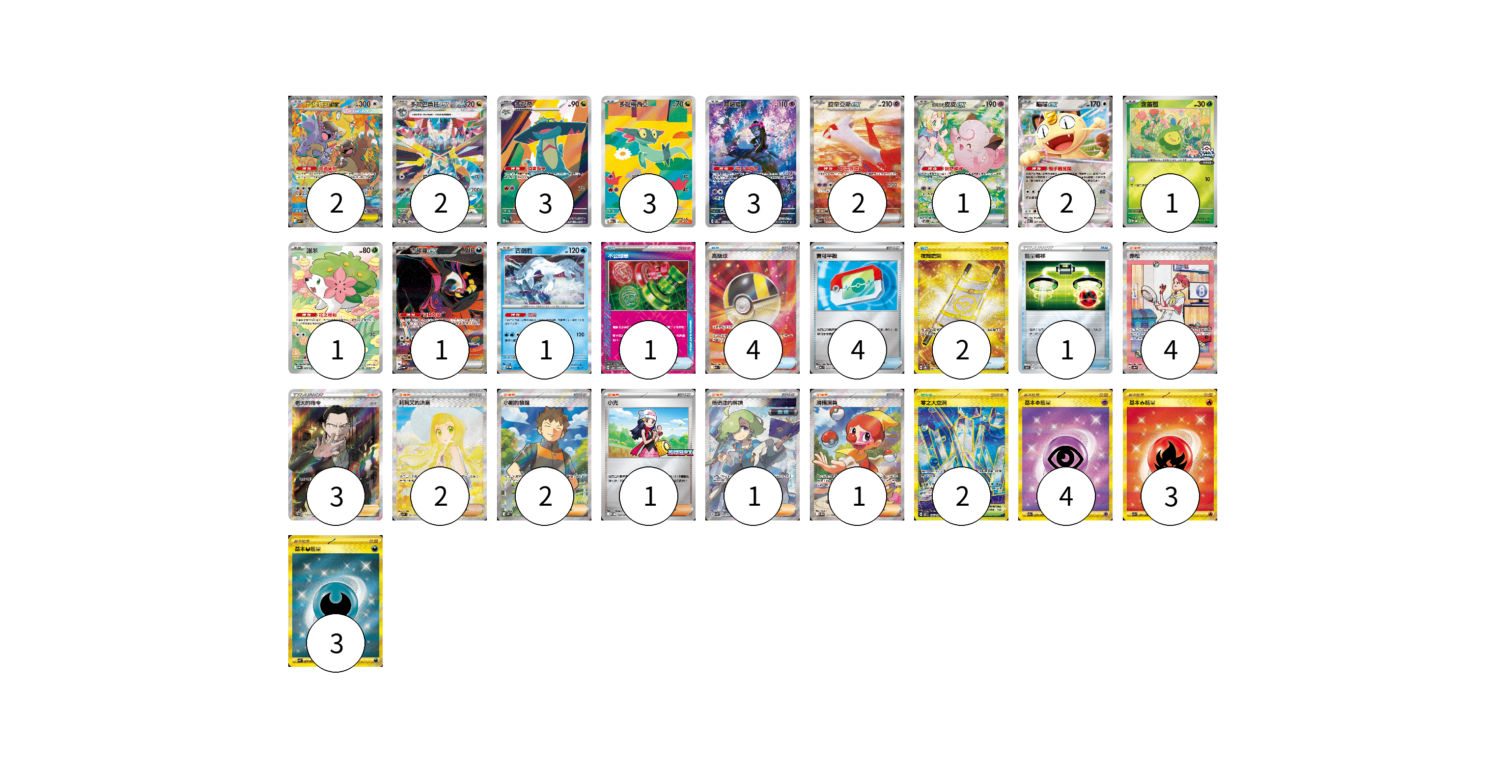 牌組構築方案 以此牌組為基礎新構築牌組 顯示卡面 顯示列表 寶可夢卡(22) 2 2 3 3 3 2 1 2 1 1 1 1 物品卡(12) 1 4 4 2 1 支援者卡(14) 4 3 2 2 1 1 1 競技場卡(2) 2 能量卡(10) 4 3 3 寶可夢卡(22) 卡牌名稱 張數 卡牌名稱 張數 超級袋獸ex M1S 089/063 02 多龍巴魯托ex SV8a 221/187 02 多龍奇 M2a 212/193 03 多龍梅西亞 M2a 211/193 03 願增猿 SV6 107/101 03 拉帝亞斯ex SV7a 087/064 02 莉莉艾的皮皮ex SV9 126/100 01 喵喵ex M3 061/080 02 含羞苞 M-P 037/M-P 01 謝米 SV9a 066/063 01 吉雉雞ex SV6a 089/064 01 古劍豹 SV-P 190/SV-P 01 物品卡(12) 卡牌名稱 張數 卡牌名稱 張數 不公印章 SV5a 053/066 01 高級球 M2a 216/193 04 寶可平板 MC 662/742 04 夜間擔架 SV8 137/106 02 能量轉移 SO 017/030 01 支援者卡(14) 卡牌名稱 張數 卡牌名稱 張數 赤松 SV8a 227/187 04 老大的指令(坂木) SC1b 170/153 03 莉莉艾的決意 M1L 091/063 02 小剛的發掘 SV9 123/100 02 小光 M-P 028/M-P 01 暗碼迷的解讀 SV5M 090/071 01 滑稽演員 SV11W 165/086 01 競技場卡(2) 卡牌名稱 張數 卡牌名稱 張數 零之大空洞 SV7 135/102 02 能量卡(10) 卡牌名稱 張數 卡牌名稱 張數 基本【超】能量 SV2a 210/165 04 基本【火】能量 SV3 141/108 03 基礎【惡】能量 SV4K 095/066 03 以此牌組為基礎新構築牌組 牌組編碼 CEpody-RolDmJ-FitETy copy 列印牌組單 牌組編碼已複製 分享至SNS