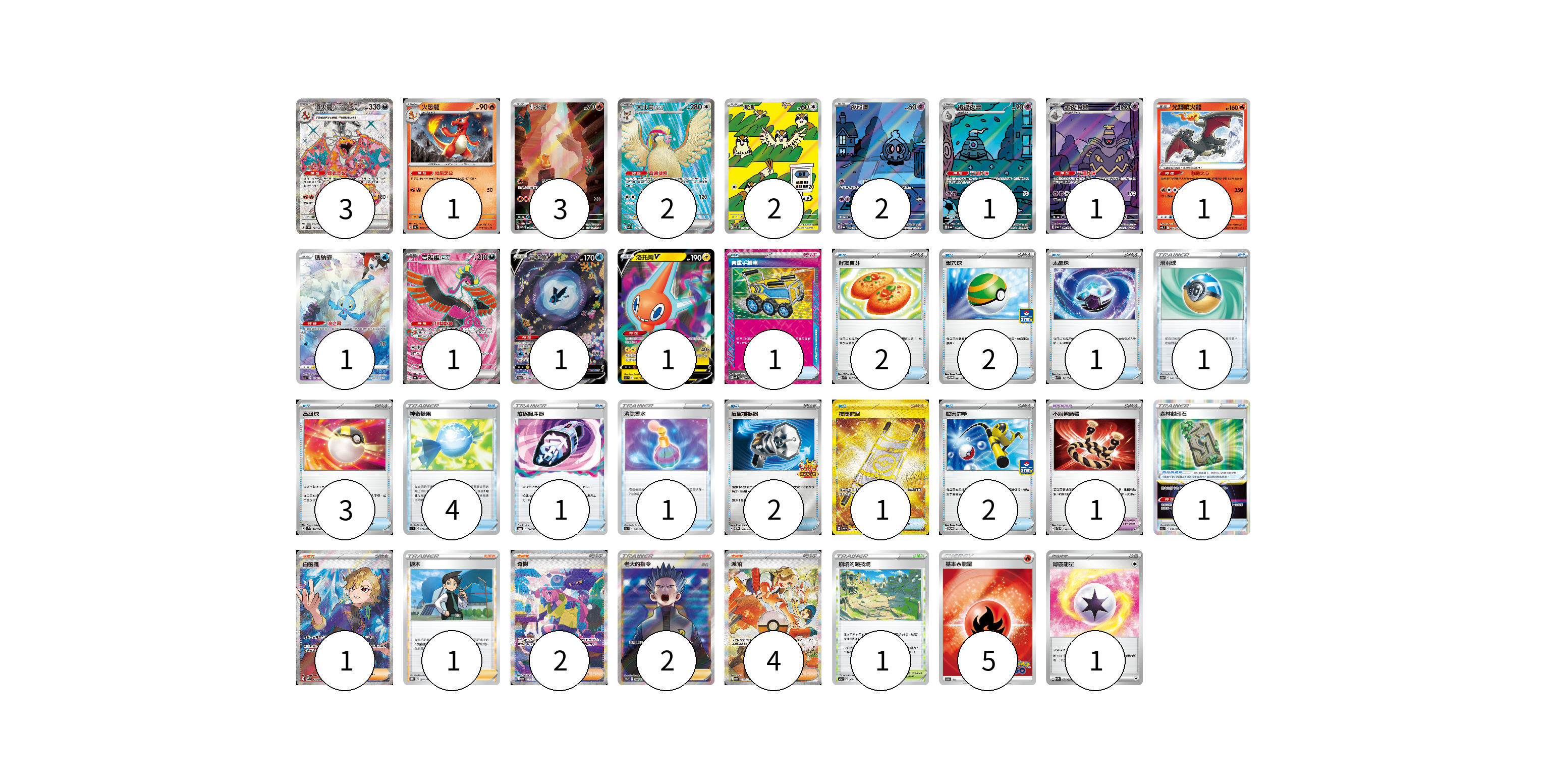 牌組構築方案 以此牌組為基礎新構築牌組 顯示卡面 顯示列表 寶可夢卡(20) 3 1 3 2 2 2 1 1 1 1 1 1 1 寶可夢道具(2) 1 1 物品卡(21) 1 2 2 1 1 3 4 1 1 2 1 2 支援者卡(10) 1 1 2 2 4 競技場卡(1) 1 能量卡(6) 5 1 寶可夢卡(20) 卡牌名稱 張數 卡牌名稱 張數 噴火龍ex SV3 125/108 03 火恐龍 SV4a 026/190 01 小火龍 SV2a 168/165 03 大比鳥ex SV3 128/108 02 波波 SV3 118/108 02 夜巡靈 SV6a 068/064 02 彷徨夜靈 SV6a 069/064 01 黑夜魔靈 SV6a 070/064 01 光輝噴火龍 SVTL 003/021 01 瑪納霏 S12a 178/172 01 吉雉雞ex SV6a 081/064 01 霓虹魚V S12a 216/172 01 洛托姆V S11 037/100 01 寶可夢道具(2) 卡牌名稱 張數 卡牌名稱 張數 不服輸頭帶 SVTL 016/021 01 森林封印石 S12 092/098 01 物品卡(21) 卡牌名稱 張數 卡牌名稱 張數 貴重手推車 SVK 020/042 01 好友寶芬 SVK 015/042 02 巢穴球 SV-P 091/SV-P 02 太晶珠 SVK 013/042 01 飛羽球 S10D 063/067 01 高級球 SVK 018/042 03 神奇糖果 SI 376/414 04 放逐吸塵器 S12a 144/172 01 消除香水 S9a 063/067 01 反擊捕捉器 SV-P 083/SV-P 02 夜間擔架 SV8 137/106 01 厲害釣竿 SV-P 112/SV-P 02 支援者卡(10) 卡牌名稱 張數 卡牌名稱 張數 白蕾雅 SV7 126/102 01 捩木 S11 097/100 01 奇樹 SV4a 350/190 02 老大的指令(赤日) S12a 250/172 02 派帕 SV4a 353/190 04 競技場卡(1) 卡牌名稱 張數 卡牌名稱 張數 崩塌的競技場 S12a 167/172 01 能量卡(6) 卡牌名稱 張數 卡牌名稱 張數 基本火能量 S10b FIR 05 薄霧能量 SV5M 071/071 01 以此牌組為基礎新構築牌組 牌組編碼 CEwLVV-uxbLQS-ULPPlD copy 列印牌組單 牌組編碼已複製 分享至SNS