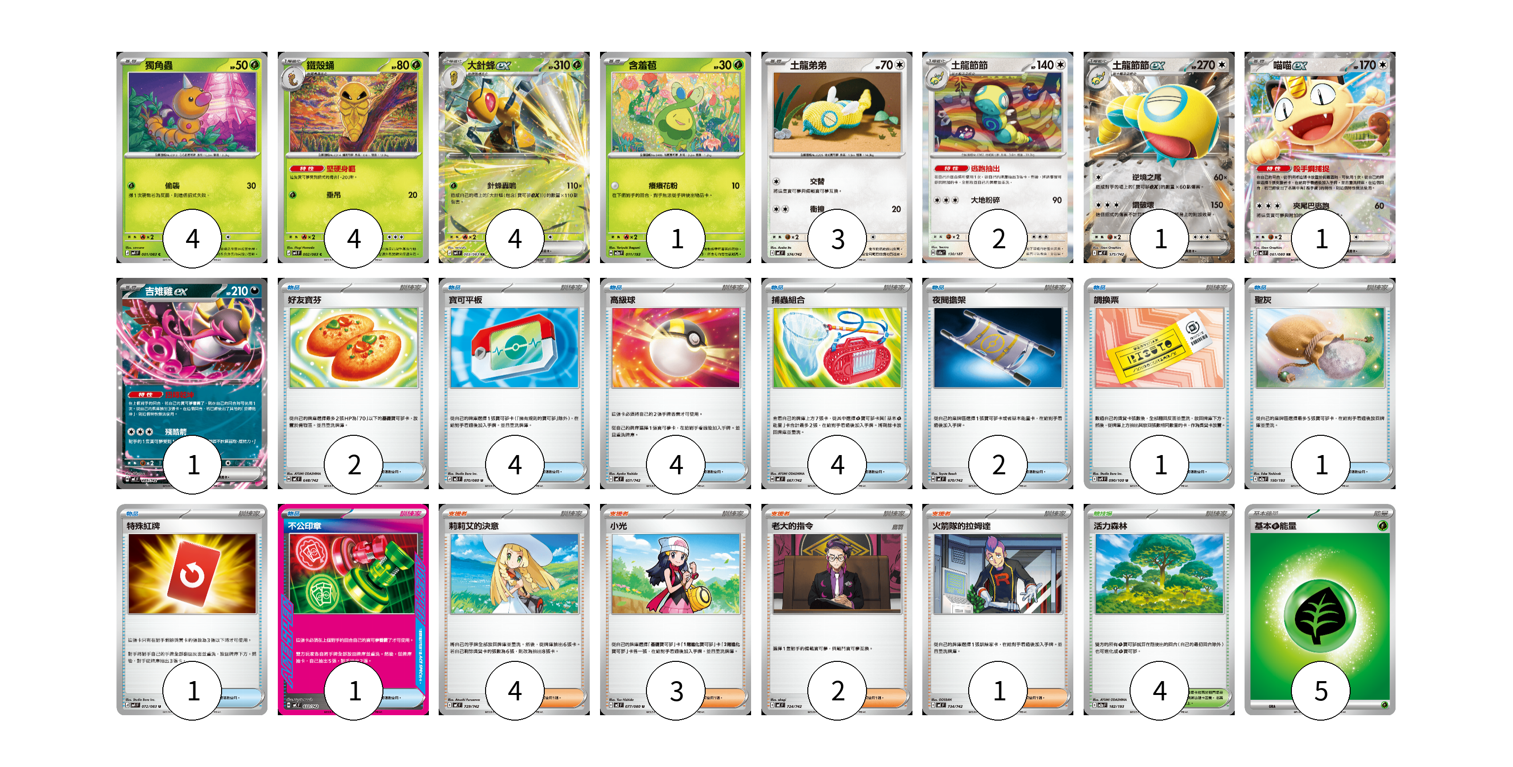 牌組構築方案 以此牌組為基礎新構築牌組 顯示卡面 顯示列表 寶可夢卡(21) 4 4 4 1 3 2 1 1 1 物品卡(20) 2 4 4 4 2 1 1 1 1 支援者卡(10) 4 3 2 1 競技場卡(4) 4 能量卡(5) 5 寶可夢卡(21) 卡牌名稱 張數 卡牌名稱 張數 獨角蟲 M4 001/083 04 鐵殼蛹 M4 002/083 04 大針蜂ex M4 003/083 04 含羞苞 M2a 011/193 01 土龍弟弟 MC 574/742 03 土龍節節 SV8a 130/187 02 土龍節節ex MC 575/742 01 喵喵ex M3 061/080 01 吉雉雞ex MC 489/742 01 物品卡(20) 卡牌名稱 張數 卡牌名稱 張數 好友寶芬 MC 648/742 02 寶可平板 M3 070/080 04 高級球 MC 651/742 04 捕蟲組合 MC 667/742 04 夜間擔架 MC 670/742 02 調換票 SV9 090/100 01 聖灰 M2a 150/193 01 特殊紅牌 M4 072/083 01 不公印章 MC 633/742 01 支援者卡(10) 卡牌名稱 張數 卡牌名稱 張數 莉莉艾的決意 MC 729/742 04 小光 M2 077/080 03 老大的指令 MC 724/742 02 火箭隊的拉姆達 MC 734/742 01 競技場卡(4) 卡牌名稱 張數 卡牌名稱 張數 活力森林 M2a 182/193 04 能量卡(5) 卡牌名稱 張數 卡牌名稱 張數 基本【草】能量 MJ GRA 05 以此牌組為基礎新構築牌組 牌組編碼 CFBSWa-KNFRHq-zNXFGV copy 列印牌組單 牌組編碼已複製 分享至SNS