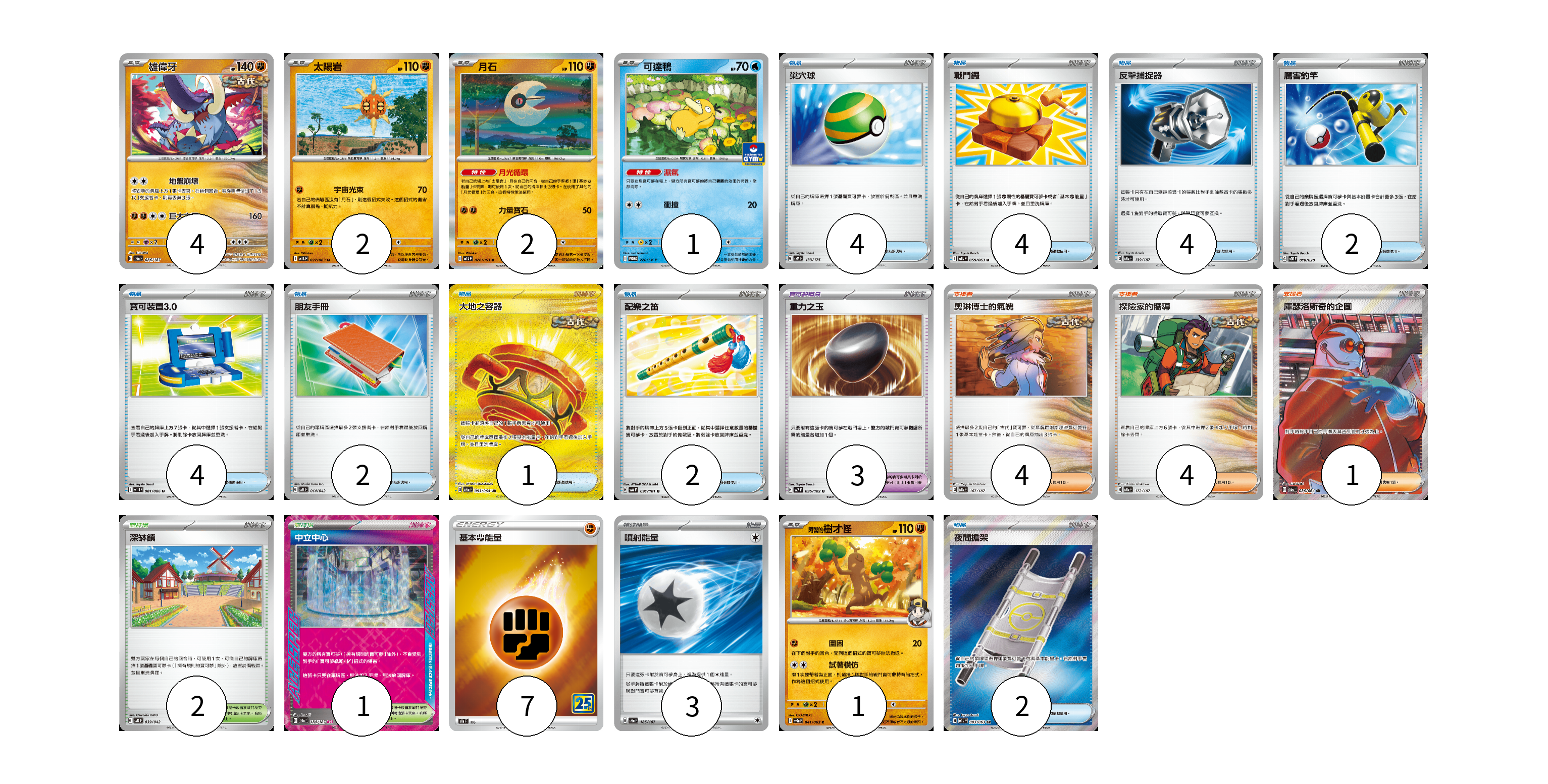 牌組構築方案 以此牌組為基礎新構築牌組 顯示卡面 顯示列表 寶可夢卡(10) 4 2 2 1 1 寶可夢道具(3) 3 物品卡(25) 4 4 4 2 4 2 1 2 2 支援者卡(9) 4 4 1 競技場卡(3) 2 1 能量卡(10) 7 3 寶可夢卡(10) 卡牌名稱 張數 卡牌名稱 張數 雄偉牙 SV8a 086/187 04 太陽岩 M1L 027/063 02 月石 M1L 026/063 02 可達鴨 SV-P 220/SV-P 01 <阿響的>樹才怪 SV9a 041/063 01 寶可夢道具(3) 卡牌名稱 張數 卡牌名稱 張數 重力之玉 SV7 095/102 03 物品卡(25) 卡牌名稱 張數 卡牌名稱 張數 巢穴球 SVM 133/175 04 戰鬥鑼 M1L 059/063 04 反擊捕捉器 SV8a 139/187 04 厲害釣竿 SVOD 010/020 02 寶可裝置3.0 SV11B 081/086 04 朋友手冊 SVK 014/042 02 大地之容器 SV6a 093/064 01 配樂之笛 SV6 091/101 02 夜間擔架 M1L 083/063 02 支援者卡(9) 卡牌名稱 張數 卡牌名稱 張數 奧琳博士的氣魄 SV8a 167/187 04 探險家的嚮導 SV8a 172/187 04 庫瑟洛斯奇的企圖 SV6a 086/064 01 競技場卡(3) 卡牌名稱 張數 卡牌名稱 張數 深缽鎮 SVK 039/042 02 中立中心 SV8a 184/187 01 能量卡(10) 卡牌名稱 張數 卡牌名稱 張數 基本鬥能量 S8a FIG 07 噴射能量 SV8a 185/187 03 以此牌組為基礎新構築牌組 牌組編碼 CFXRcb-XLYHja-ltUIHK copy 列印牌組單 牌組編碼已複製 分享至SNS