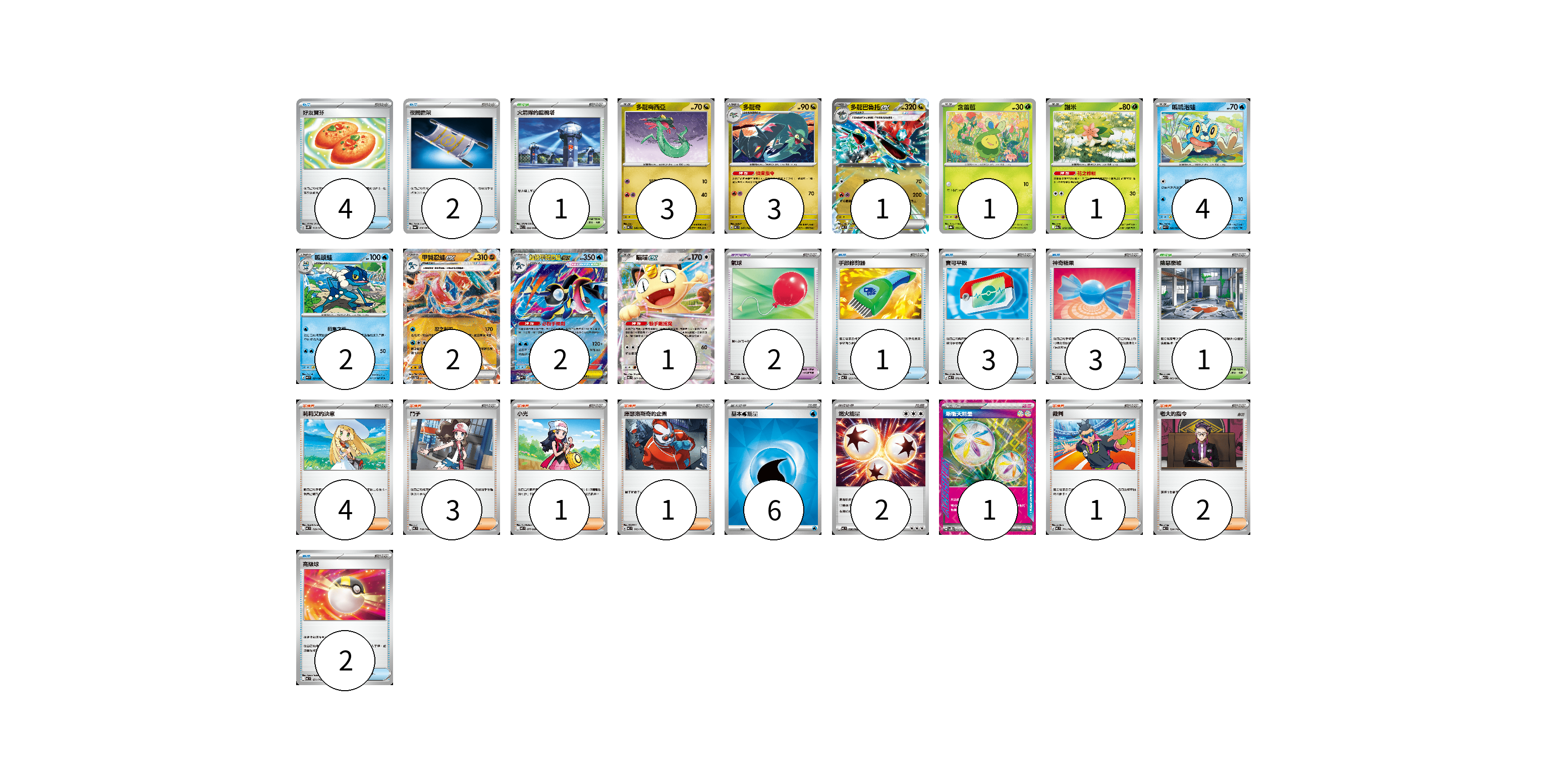 牌組構築方案 以此牌組為基礎新構築牌組 顯示卡面 顯示列表 寶可夢卡(20) 3 3 1 1 1 4 2 2 2 1 寶可夢道具(2) 2 物品卡(15) 4 2 1 3 3 2 支援者卡(12) 4 3 1 1 1 2 競技場卡(2) 1 1 能量卡(9) 6 2 1 寶可夢卡(20) 卡牌名稱 張數 卡牌名稱 張數 多龍梅西亞 MC 546/742 03 多龍奇 MC 547/742 03 多龍巴魯托ex MC 548/742 01 含羞苞 SV8a 001/187 01 謝米 M2a 012/193 01 呱呱泡蛙 M4 020/083 04 呱頭蛙 M4 021/083 02 甲賀忍蛙ex SV5a 045/066 02 超級甲賀忍蛙ex M4 022/083 02 喵喵ex M3 061/080 01 寶可夢道具(2) 卡牌名稱 張數 卡牌名稱 張數 氣球 MC 688/742 02 物品卡(15) 卡牌名稱 張數 卡牌名稱 張數 好友寶芬 SV5K 063/071 04 夜間擔架 SV6a 056/064 02 手部修剪器 MC 653/742 01 寶可平板 M3 070/080 03 神奇糖果 MC 655/742 03 高級球 MC 651/742 02 支援者卡(12) 卡牌名稱 張數 卡牌名稱 張數 莉莉艾的決意 MC 729/742 04 鬥子 MC 718/742 03 小光 M2 077/080 01 庫瑟洛斯奇的企圖 MC 705/742 01 裁判 MC 711/742 01 老大的指令 MC 724/742 02 競技場卡(2) 卡牌名稱 張數 卡牌名稱 張數 火箭隊的監視塔 SV10 096/098 01 險惡廢墟 M1L 063/063 01 能量卡(9) 卡牌名稱 張數 卡牌名稱 張數 基本【水】能量 SVM WAT 06 燃火能量 MC 736/742 02 新衝天能量 SV5K 071/071 01 以此牌組為基礎新構築牌組 牌組編碼 CFgTZN-LjqJdx-Bmxlty copy 列印牌組單 牌組編碼已複製 分享至SNS