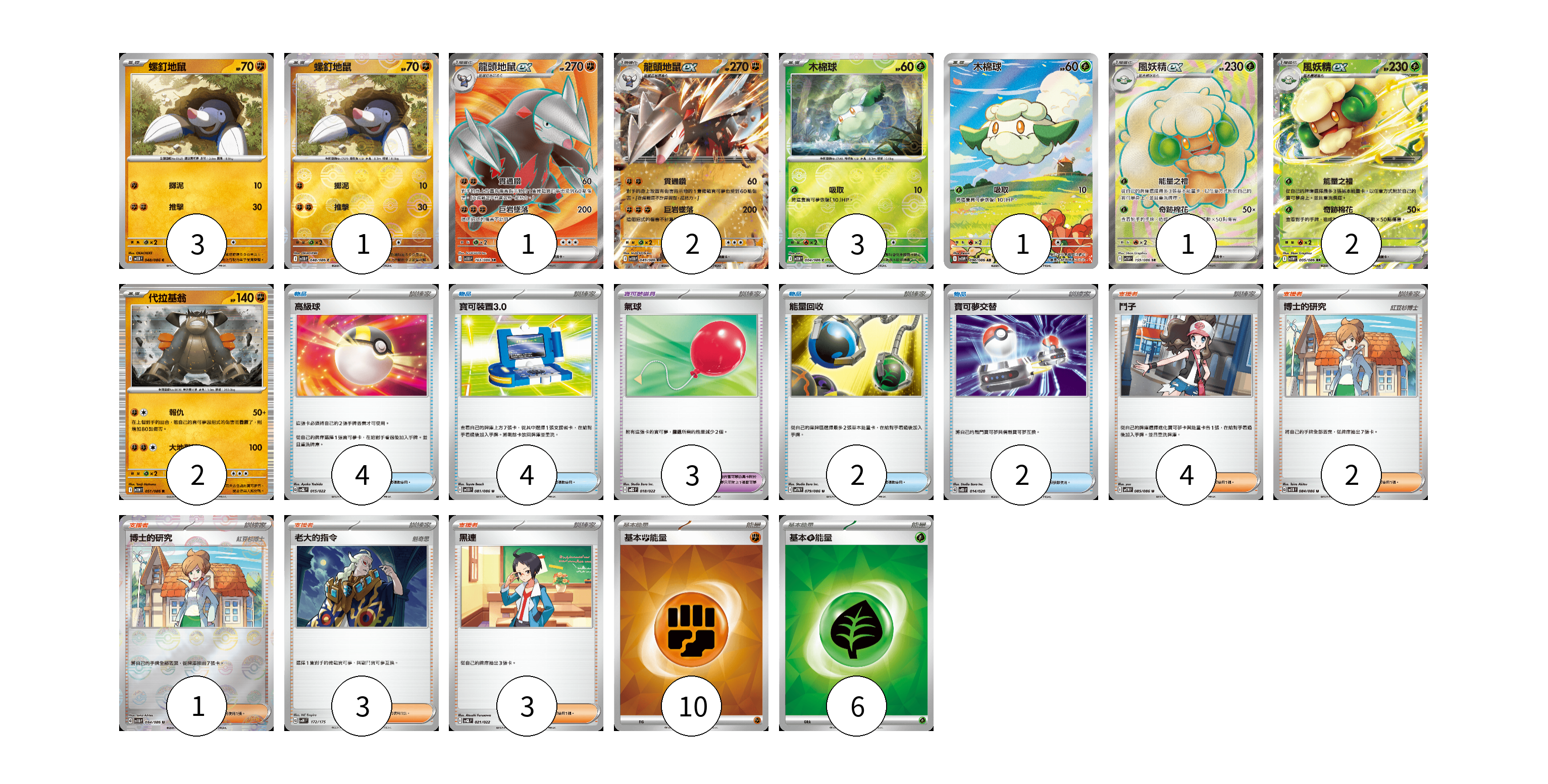 牌組構築方案 以此牌組為基礎新構築牌組 顯示卡面 顯示列表 寶可夢卡(16) 3 1 1 2 3 1 1 2 2 寶可夢道具(3) 3 物品卡(12) 4 4 2 2 支援者卡(13) 4 2 1 3 3 能量卡(16) 10 6 寶可夢卡(16) 卡牌名稱 張數 卡牌名稱 張數 螺釘地鼠 SV11B 048/086 03 螺釘地鼠 SV11B 048/086 01 龍頭地鼠ex SV11B 163/086 01 龍頭地鼠ex SV11B 049/086 02 木棉球 SV11W 004/086 03 木棉球 SV11W 090/086 01 風妖精ex SV11W 159/086 01 風妖精ex SV11W 005/086 02 代拉基翁 SV11W 051/086 02 寶可夢道具(3) 卡牌名稱 張數 卡牌名稱 張數 氣球 MBD 018/022 03 物品卡(12) 卡牌名稱 張數 卡牌名稱 張數 高級球 SVQL 015/022 04 寶可裝置3.0 SV11B 081/086 04 能量回收 SV11W 079/086 02 寶可夢交替 SVOD 014/020 02 支援者卡(13) 卡牌名稱 張數 卡牌名稱 張數 鬥子 SV11W 085/086 04 博士的研究 SV11B 084/086 02 博士的研究 SV11B 084/086 01 老大的指令 SVM 172/175 03 黑連 SVQL 021/022 03 能量卡(16) 卡牌名稱 張數 卡牌名稱 張數 基本【鬥】能量 SVK FIG 10 基本【草】能量 SVK GRA 06 以此牌組為基礎新構築牌組 牌組編碼 CGlLDt-xnmVBx-CNWVxg copy 列印牌組單 牌組編碼已複製 分享至SNS