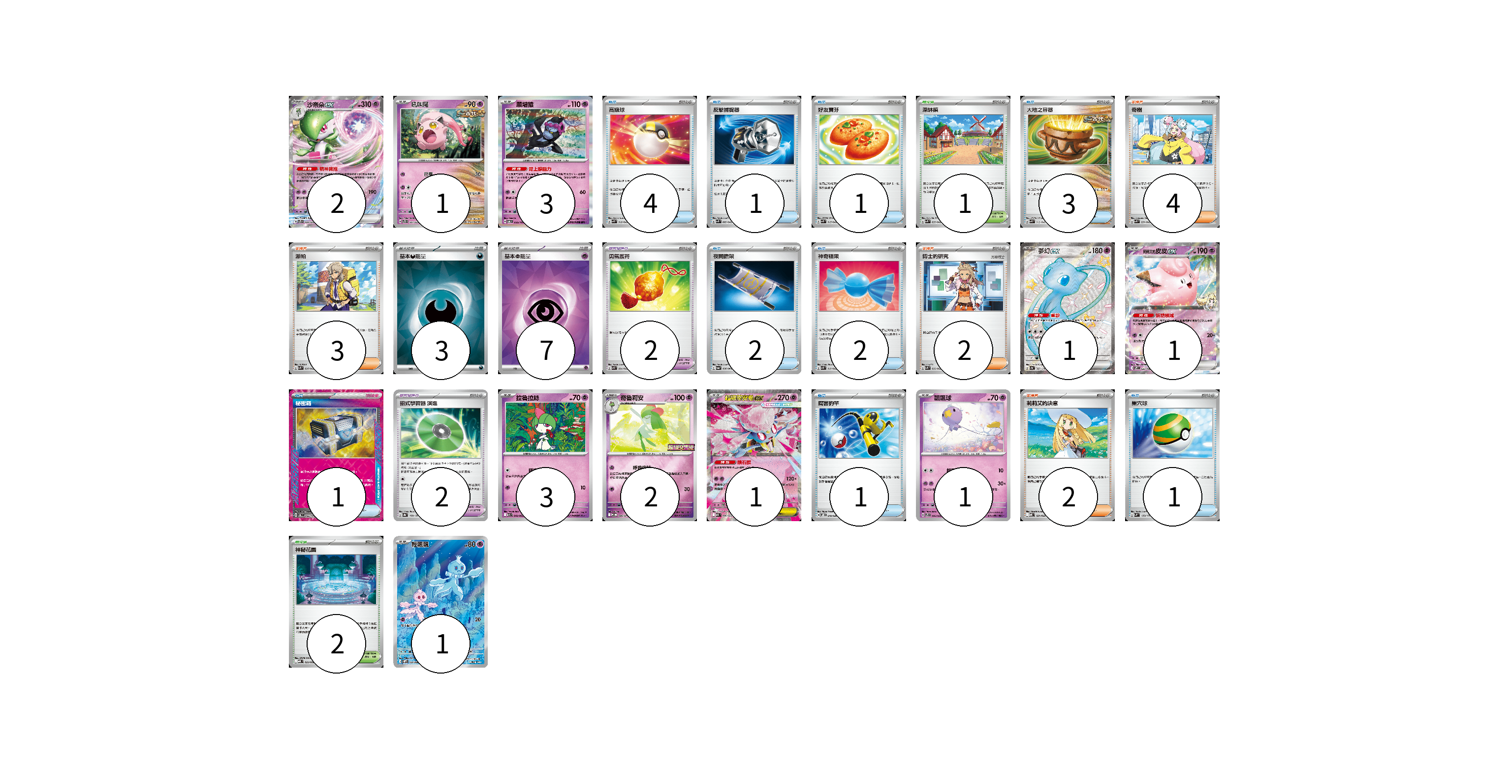 牌組構築方案 以此牌組為基礎新構築牌組 顯示卡面 顯示列表 寶可夢卡(16) 2 1 3 1 1 3 2 1 1 1 寶可夢道具(4) 2 2 物品卡(16) 4 1 1 3 2 2 1 1 1 支援者卡(11) 4 3 2 2 競技場卡(3) 1 2 能量卡(10) 3 7 寶可夢卡(16) 卡牌名稱 張數 卡牌名稱 張數 沙奈朵ex SVTS 004/022 02 吼叫尾 SVTS 007/022 01 願增猿 SV6 055/101 03 夢幻ex SV4a 327/190 01 莉莉艾的皮皮ex SV9 033/100 01 拉魯拉絲 M1S 040/063 03 奇魯莉安 M-P 006/M-P 02 超級蒂安希ex MBD 006/022 01 飄飄球 SVTS 005/022 01 輕飄飄 SV11W 124/086 01 寶可夢道具(4) 卡牌名稱 張數 卡牌名稱 張數 勇氣護符 SVK 024/042 02 招式學習器 演進 SV8a 160/187 02 物品卡(16) 卡牌名稱 張數 卡牌名稱 張數 高級球 SVK 018/042 04 反擊捕捉器 SVK 009/042 01 好友寶芬 SVK 015/042 01 大地之容器 SVK 012/042 03 夜間擔架 SV6a 056/064 02 神奇糖果 SVK 019/042 02 秘密箱 SV6 092/101 01 厲害釣竿 SVOD 010/020 01 巢穴球 SVM 133/175 01 支援者卡(11) 卡牌名稱 張數 卡牌名稱 張數 奇樹 SVK 031/042 04 派帕 SVK 035/042 03 博士的研究 SVK 032/042 02 莉莉艾的決意 MBD 021/022 02 競技場卡(3) 卡牌名稱 張數 卡牌名稱 張數 深缽鎮 SVK 039/042 01 神秘花園 MBD 022/022 02 能量卡(10) 卡牌名稱 張數 卡牌名稱 張數 基本【惡】能量 SVK DAR 03 基本【超】能量 SVK PSY 07 以此牌組為基礎新構築牌組 牌組編碼 CJKyOu-vBfZOq-kKwxir copy 列印牌組單 牌組編碼已複製 分享至SNS