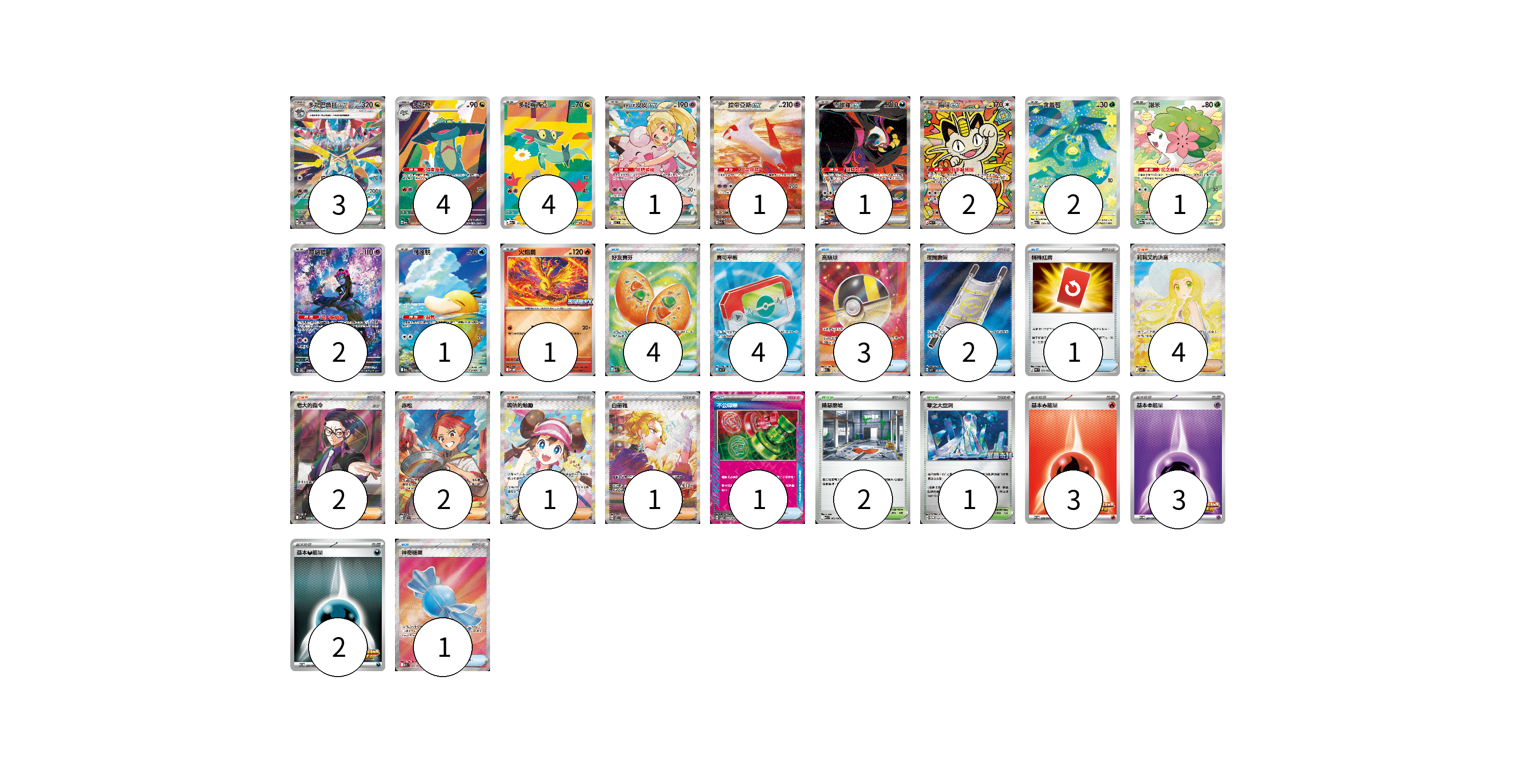牌組構築方案 以此牌組為基礎新構築牌組 顯示卡面 顯示列表 寶可夢卡(23) 3 4 4 1 1 1 2 2 1 2 1 1 物品卡(16) 4 4 3 2 1 1 1 支援者卡(10) 4 2 2 1 1 競技場卡(3) 2 1 能量卡(8) 3 3 2 寶可夢卡(23) 卡牌名稱 張數 卡牌名稱 張數 多龍巴魯托ex SV8a 221/187 03 多龍奇 M2a 212/193 04 多龍梅西亞 M2a 211/193 04 莉莉艾的皮皮ex MC 765/742 01 拉帝亞斯ex SV7a 087/064 01 吉雉雞ex SV6a 089/064 01 喵喵ex M3 114/080 02 含羞苞 M2a 196/193 02 謝米 SV9a 066/063 01 願增猿 SV6 107/101 02 可達鴨 M2a 199/193 01 火焰鳥 M-P 022/M-P 01 物品卡(16) 卡牌名稱 張數 卡牌名稱 張數 好友寶芬 M1S 081/063 04 寶可平板 M3 103/080 04 高級球 M2a 216/193 03 夜間擔架 M1L 083/063 02 特殊紅牌 M4 072/083 01 不公印章 SV5a 053/066 01 神奇糖果 M1S 082/063 01 支援者卡(10) 卡牌名稱 張數 卡牌名稱 張數 莉莉艾的決意 M1L 091/063 04 老大的指令(烏羽) MC 760/742 02 赤松 SV7 123/102 02 鳴依的勉勵 M3 115/080 01 白蕾雅 SV7 132/102 01 競技場卡(3) 卡牌名稱 張數 卡牌名稱 張數 險惡廢墟 M1L 063/063 02 零之大空洞 SV-P 151/SV-P 01 能量卡(8) 卡牌名稱 張數 卡牌名稱 張數 基本【火】能量 SV-P 258/SV-P 03 基本【超】能量 SV-P 261/SV-P 03 基本【惡】能量 SV-P 263/SV-P 02 以此牌組為基礎新構築牌組 牌組編碼 CKbMtR-UnzRXo-BRUlWH copy 列印牌組單 牌組編碼已複製 分享至SNS