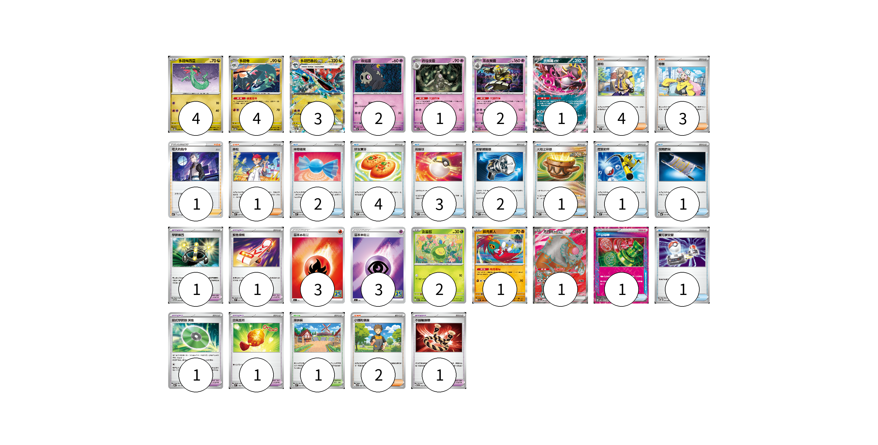 牌組構築方案 以此牌組為基礎新構築牌組 顯示卡面 顯示列表 寶可夢卡(21) 4 4 3 2 1 2 1 2 1 1 寶可夢道具(5) 1 1 1 1 1 物品卡(16) 2 4 3 2 1 1 1 1 1 支援者卡(11) 4 3 1 1 2 競技場卡(1) 1 能量卡(6) 3 3 寶可夢卡(21) 卡牌名稱 張數 卡牌名稱 張數 多龍梅西亞 SV6 079/101 04 多龍奇 SV6 080/101 04 多龍巴魯托ex SV6 081/101 03 夜巡靈 SV6a 018/064 02 彷徨夜靈 SV6a 019/064 01 黑夜魔靈 SV6a 020/064 02 吉雉雞ex SV6a 038/064 01 含羞苞 SV8a 001/187 02 摔角鷹人 SV4a 106/190 01 月月熊 赫月 ex SV5a 084/066 01 寶可夢道具(5) 卡牌名稱 張數 卡牌名稱 張數 學習裝置 SVTM 016/022 01 緊急滑板 SVK 023/042 01 招式學習器 演進 SV8a 160/187 01 勇氣護符 SVM 142/175 01 不服輸頭帶 SVTL 016/021 01 物品卡(16) 卡牌名稱 張數 卡牌名稱 張數 神奇糖果 SVK 019/042 02 好友寶芬 SVK 015/042 04 高級球 SVK 018/042 03 反擊捕捉器 SVK 009/042 02 大地之容器 SVK 012/042 01 厲害釣竿 SVK 011/042 01 夜間擔架 SV6a 056/064 01 不公印章 SV5a 053/066 01 寶可夢交替 SVOD 014/020 01 支援者卡(11) 卡牌名稱 張數 卡牌名稱 張數 派帕 SVK 035/042 04 奇樹 SVK 031/042 03 老大的指令(赤日) SVB 024/028 01 赤松 SVK 027/042 01 小剛的發掘 SV9 096/100 02 競技場卡(1) 卡牌名稱 張數 卡牌名稱 張數 深缽鎮 SVK 039/042 01 能量卡(6) 卡牌名稱 張數 卡牌名稱 張數 基本火能量 S8a FIR 03 基本超能量 S8a PSY 03 以此牌組為基礎新構築牌組 牌組編碼 CLCQtJ-eOtDma-qbulCL copy 列印牌組單 牌組編碼已複製 分享至SNS