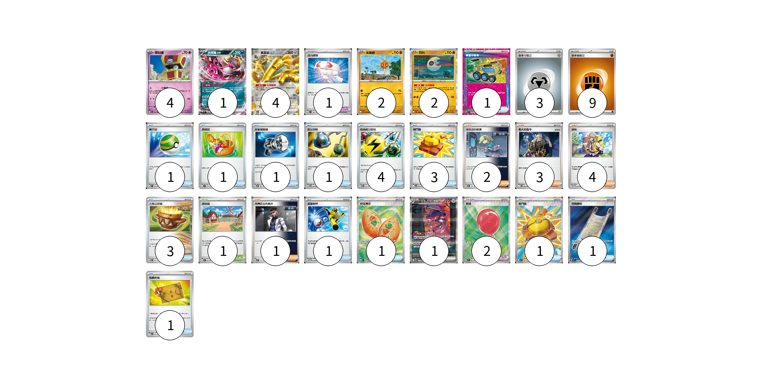 牌組構築方案 以此牌組為基礎新構築牌組 顯示卡面 顯示列表 寶可夢卡(14) 4 1 4 2 2 1 寶可夢道具(3) 1 2 物品卡(20) 1 1 1 1 1 4 3 3 1 1 1 1 1 支援者卡(10) 2 3 4 1 競技場卡(1) 1 能量卡(12) 3 9 寶可夢卡(14) 卡牌名稱 張數 卡牌名稱 張數 索財靈 SV7a 024/064 04 吉雉雞ex SV8a 104/187 01 賽富豪ex SV8a 117/187 04 太陽岩 M1L 027/063 02 月石 M1L 026/063 02 蓋諾賽克特ex SV11B 172/086 01 寶可夢道具(3) 卡牌名稱 張數 卡牌名稱 張數 活力頭帶 SVM 140/175 01 氣球 M1L 084/063 02 物品卡(20) 卡牌名稱 張數 卡牌名稱 張數 貴重手推車 SVK 020/042 01 巢穴球 SVK 016/042 01 野餐籃 SV1V 071/078 01 反擊捕捉器 SV8a 139/187 01 能量回收 SVQL 012/022 01 超級能量回收 SV8a 141/187 04 戰鬥鑼 M1L 059/063 03 大地之容器 SV8a 143/187 03 厲害釣竿 SVOD 010/020 01 好友寶芬 M1S 081/063 01 戰鬥鑼 M1L 082/063 01 夜間擔架 M1L 083/063 01 勉勵的信 SV4a 162/190 01 支援者卡(10) 卡牌名稱 張數 卡牌名稱 張數 暗碼迷的解讀 SV8a 165/187 02 老大的指令 MBD 020/022 03 派帕 SVOD 018/020 04 弗圖博士的劇本 SV8a 175/187 01 競技場卡(1) 卡牌名稱 張數 卡牌名稱 張數 深缽鎮 SVK 039/042 01 能量卡(12) 卡牌名稱 張數 卡牌名稱 張數 基本鋼能量 sv-p MET 03 基本鬥能量 sv-p FIG 09 以此牌組為基礎新構築牌組 牌組編碼 CLRWTK-dcSbrE-AtMSHx copy 列印牌組單 牌組編碼已複製 分享至SNS