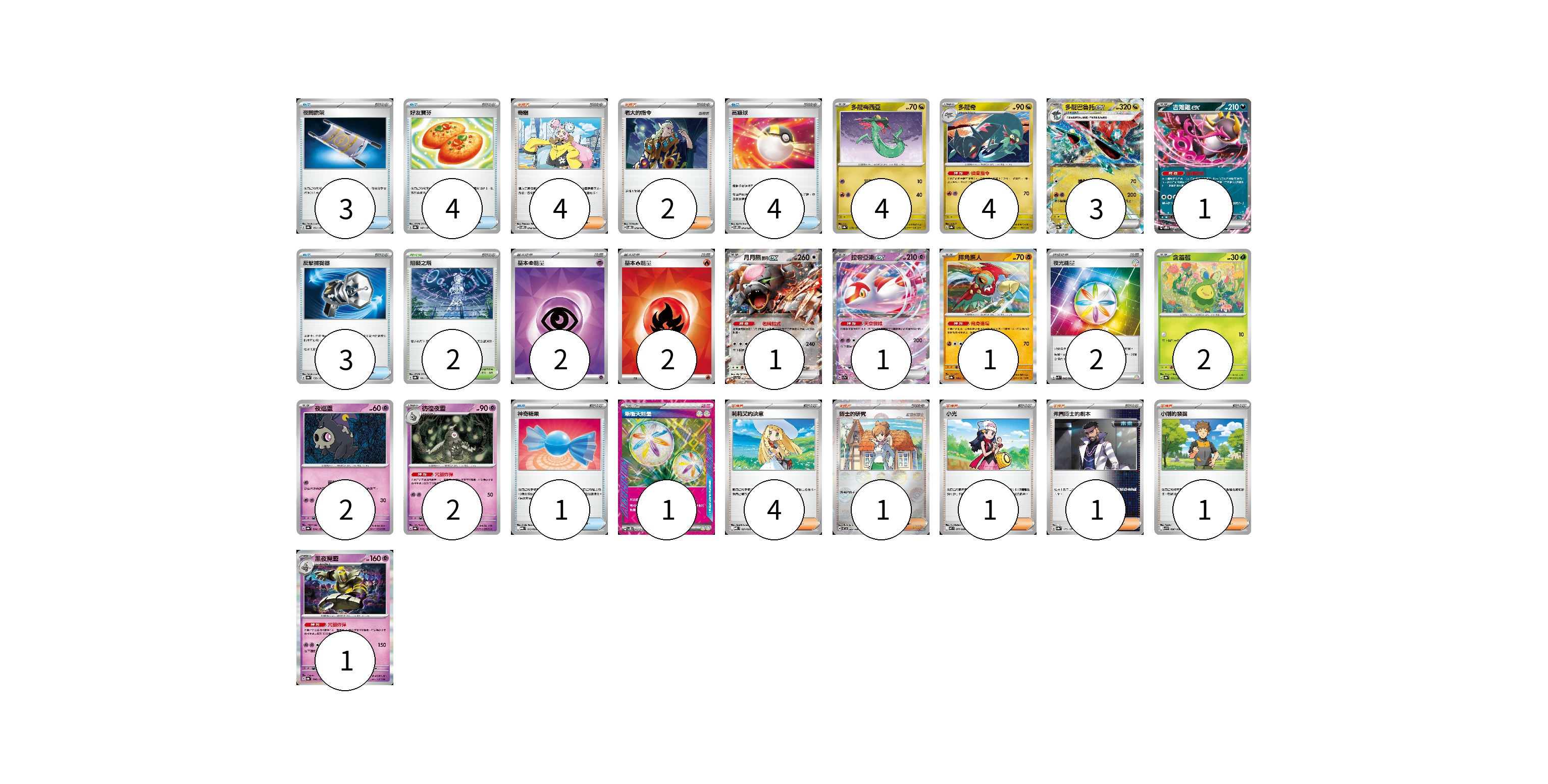 牌組構築方案 以此牌組為基礎新構築牌組 顯示卡面 顯示列表 寶可夢卡(22) 4 4 3 1 1 1 1 2 2 2 1 物品卡(15) 3 4 4 3 1 支援者卡(14) 4 2 4 1 1 1 1 競技場卡(2) 2 能量卡(7) 2 2 2 1 寶可夢卡(22) 卡牌名稱 張數 卡牌名稱 張數 多龍梅西亞 SV8a 118/187 04 多龍奇 SV8a 119/187 04 多龍巴魯托ex SV8a 120/187 03 吉雉雞ex SVOD 004/020 01 月月熊 赫月 ex SV5a 052/066 01 拉帝亞斯ex SV7a 019/064 01 摔角鷹人 SV8a 084/187 01 含羞苞 SV8a 001/187 02 夜巡靈 SV8a 064/187 02 彷徨夜靈 SV8a 065/187 02 黑夜魔靈 SV8a 066/187 01 物品卡(15) 卡牌名稱 張數 卡牌名稱 張數 夜間擔架 SV8a 151/187 03 好友寶芬 SV8a 147/187 04 高級球 SVOM 013/021 04 反擊捕捉器 SV8a 139/187 03 神奇糖果 MBG 013/022 01 支援者卡(14) 卡牌名稱 張數 卡牌名稱 張數 奇樹 SVOM 018/021 04 老大的指令 SVOD 019/020 02 莉莉艾的決意 MBD 021/022 04 博士的研究 SV11B 084/086 01 小光 M2 077/080 01 弗圖博士的劇本 SV8a 175/187 01 小剛的發掘 SV9 096/100 01 競技場卡(2) 卡牌名稱 張數 卡牌名稱 張數 阻礙之塔 SV8a 181/187 02 能量卡(7) 卡牌名稱 張數 卡牌名稱 張數 基本【超】能量 SVOD PSY 02 基本【火】能量 SVK FIR 02 夜光能量 SVK 042/042 02 新衝天能量 SV5K 071/071 01 以此牌組為基礎新構築牌組 牌組編碼 CMGVbU-HZzafO-KaeyMS copy 列印牌組單 牌組編碼已複製 分享至SNS