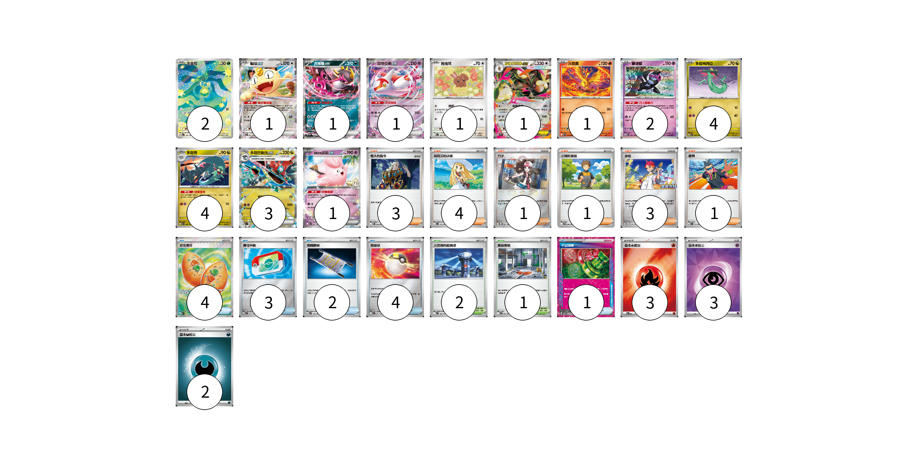 牌組構築方案 以此牌組為基礎新構築牌組 顯示卡面 顯示列表 寶可夢卡(22) 2 1 1 1 1 1 1 2 4 4 3 1 物品卡(14) 4 3 2 4 1 支援者卡(13) 3 4 1 1 3 1 競技場卡(3) 2 1 能量卡(8) 3 3 2 寶可夢卡(22) 卡牌名稱 張數 卡牌名稱 張數 含羞苞 M2a 196/193 02 喵喵ex M3 061/080 01 吉雉雞ex SV8a 104/187 01 拉帝亞斯ex SV7a 019/064 01 捲捲耳 MC 593/742 01 超級長耳兔ex M2 072/080 01 火焰鳥 M2 014/080 01 願增猿 M2a 081/193 02 多龍梅西亞 MC 546/742 04 多龍奇 MC 547/742 04 多龍巴魯托ex M2a 134/193 03 莉莉艾的皮皮ex MC 287/742 01 物品卡(14) 卡牌名稱 張數 卡牌名稱 張數 好友寶芬 M1S 081/063 04 寶可平板 MC 662/742 03 夜間擔架 M2a 159/193 02 高級球 MC 651/742 04 不公印章 SV5a 053/066 01 支援者卡(13) 卡牌名稱 張數 卡牌名稱 張數 老大的指令 MBD 020/022 03 莉莉艾的決意 M2a 175/193 04 鬥子 SV11W 085/086 01 小剛的發掘 SV9 096/100 01 赤松 SV-P 150/SV-P 03 裁判 MC 711/742 01 競技場卡(3) 卡牌名稱 張數 卡牌名稱 張數 火箭隊的監視塔 M2a 189/193 02 險惡廢墟 M1L 063/063 01 能量卡(8) 卡牌名稱 張數 卡牌名稱 張數 基本【火】能量 MC FIR 03 基本【超】能量 SVOD PSY 03 基本【惡】能量 MBG DAR 02 以此牌組為基礎新構築牌組 牌組編碼 CMSzMM-GhCODs-LpcrZl copy 列印牌組單 牌組編碼已複製 分享至SNS