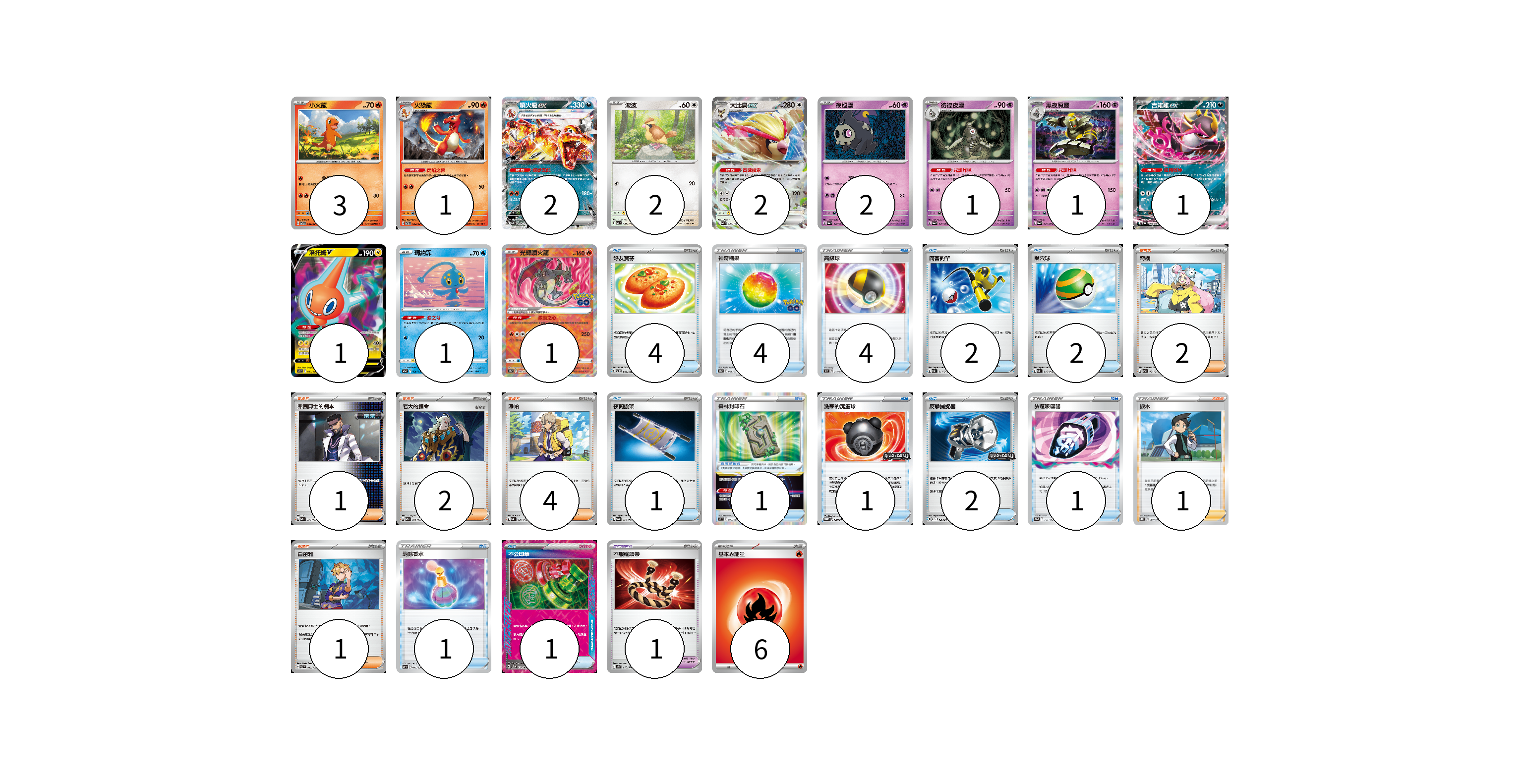 牌組構築方案 以此牌組為基礎新構築牌組 顯示卡面 顯示列表 寶可夢卡(18) 3 1 2 2 2 2 1 1 1 1 1 1 寶可夢道具(2) 1 1 物品卡(23) 4 4 4 2 2 1 1 2 1 1 1 支援者卡(11) 2 1 2 4 1 1 能量卡(6) 6 寶可夢卡(18) 卡牌名稱 張數 卡牌名稱 張數 小火龍 SVTL 001/021 03 火恐龍 SVTL 002/021 01 噴火龍ex SV3 066/108 02 波波 SV3 087/108 02 大比鳥ex SV3 089/108 02 夜巡靈 SV6a 018/064 02 彷徨夜靈 SV6a 019/064 01 黑夜魔靈 SV6a 020/064 01 吉雉雞ex SV6a 038/064 01 洛托姆V S11 037/100 01 瑪納霏 S12a 029/172 01 光輝噴火龍 S10b 011/071 01 寶可夢道具(2) 卡牌名稱 張數 卡牌名稱 張數 森林封印石 S12 092/098 01 不服輸頭帶 SV1S 073/078 01 物品卡(23) 卡牌名稱 張數 卡牌名稱 張數 好友寶芬 SVTH 009/018 04 神奇糖果 S10b 066/071 04 高級球 SK 015/030 04 厲害釣竿 SVK 011/042 02 巢穴球 SVK 016/042 02 夜間擔架 SV6a 056/064 01 洗翠的沉重球 SV-P 138/SV-P 01 反擊捕捉器 SV-P 136/SV-P 02 放逐吸塵器 S12a 144/172 01 消除香水 SVF 011/038 01 不公印章 SV5a 053/066 01 支援者卡(11) 卡牌名稱 張數 卡牌名稱 張數 奇樹 SVK 031/042 02 弗圖博士的劇本 SVK 034/042 01 老大的指令 SVK 036/042 02 派帕 SVK 035/042 04 捩木 S11 097/100 01 白蕾雅 SV7 100/102 01 能量卡(6) 卡牌名稱 張數 卡牌名稱 張數 基本火能量 sv-p FIR 06 以此牌組為基礎新構築牌組 牌組編碼 CMiUxv-Xiaahn-hEngjS copy 列印牌組單 牌組編碼已複製 分享至SNS