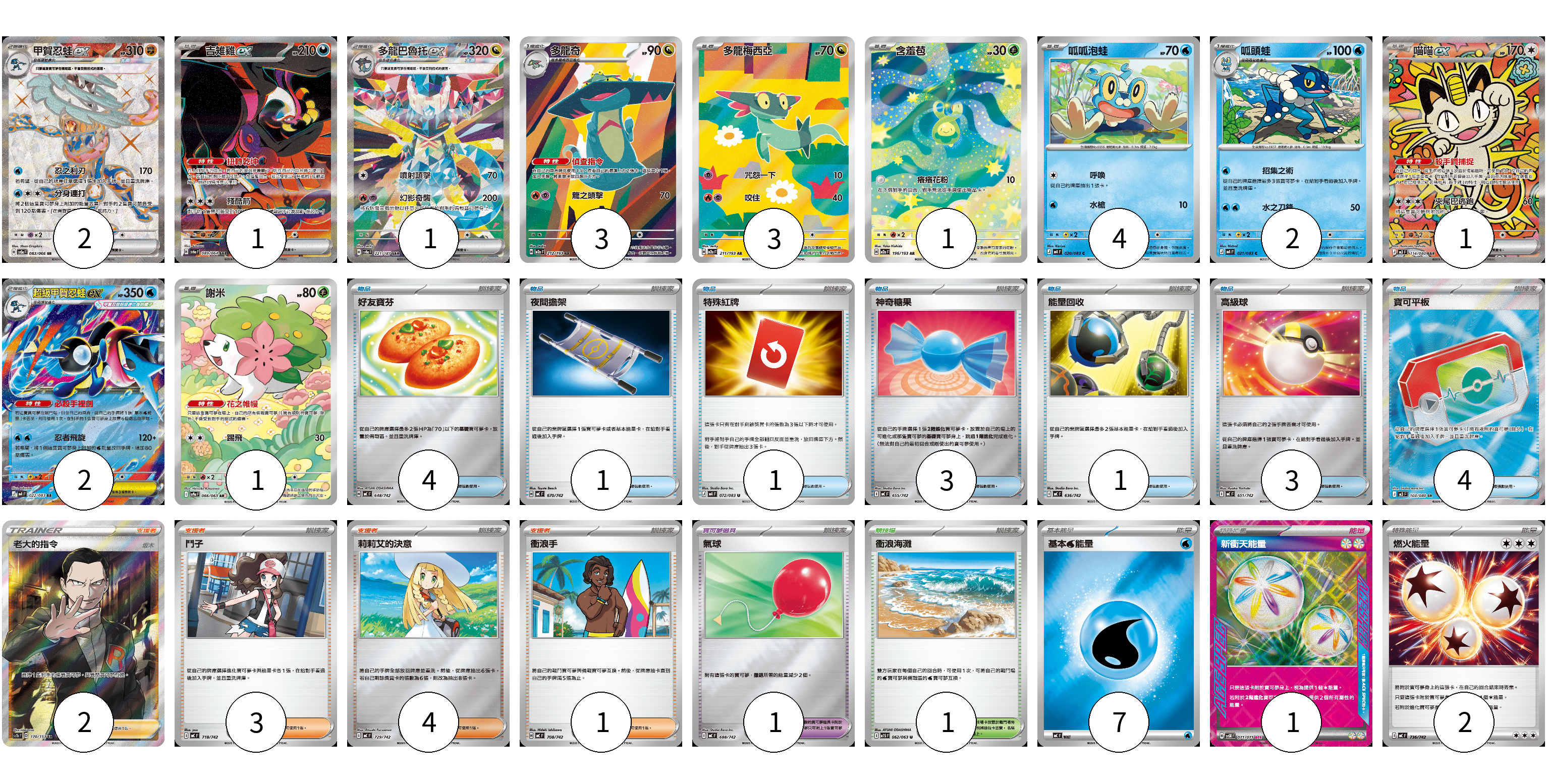 牌組構築方案 以此牌組為基礎新構築牌組 顯示卡面 顯示列表 寶可夢卡(21) 2 1 1 3 3 1 4 2 1 2 1 寶可夢道具(1) 1 物品卡(17) 4 1 1 3 1 3 4 支援者卡(10) 2 3 4 1 競技場卡(1) 1 能量卡(10) 7 1 2 寶可夢卡(21) 卡牌名稱 張數 卡牌名稱 張數 甲賀忍蛙ex SV5a 083/066 02 吉雉雞ex SV6a 089/064 01 多龍巴魯托ex SV8a 221/187 01 多龍奇 M2a 212/193 03 多龍梅西亞 M2a 211/193 03 含羞苞 M2a 196/193 01 呱呱泡蛙 M4 020/083 04 呱頭蛙 M4 021/083 02 喵喵ex M3 114/080 01 超級甲賀忍蛙ex M4 022/083 02 謝米 SV9a 066/063 01 寶可夢道具(1) 卡牌名稱 張數 卡牌名稱 張數 氣球 MC 688/742 01 物品卡(17) 卡牌名稱 張數 卡牌名稱 張數 好友寶芬 MC 648/742 04 夜間擔架 MC 670/742 01 特殊紅牌 M4 072/083 01 神奇糖果 MC 655/742 03 能量回收 MC 636/742 01 高級球 MC 651/742 03 寶可平板 M3 103/080 04 支援者卡(10) 卡牌名稱 張數 卡牌名稱 張數 老大的指令(坂木) SC1b 170/153 02 鬥子 MC 718/742 03 莉莉艾的決意 MC 729/742 04 衝浪手 MC 708/742 01 競技場卡(1) 卡牌名稱 張數 卡牌名稱 張數 衝浪海灘 M1S 062/063 01 能量卡(10) 卡牌名稱 張數 卡牌名稱 張數 基本【水】能量 MC WAT 07 新衝天能量 SV5K 071/071 01 燃火能量 MC 736/742 02 以此牌組為基礎新構築牌組 牌組編碼 CMoVfI-rMPjbP-hnOewR copy 列印牌組單 牌組編碼已複製 分享至SNS