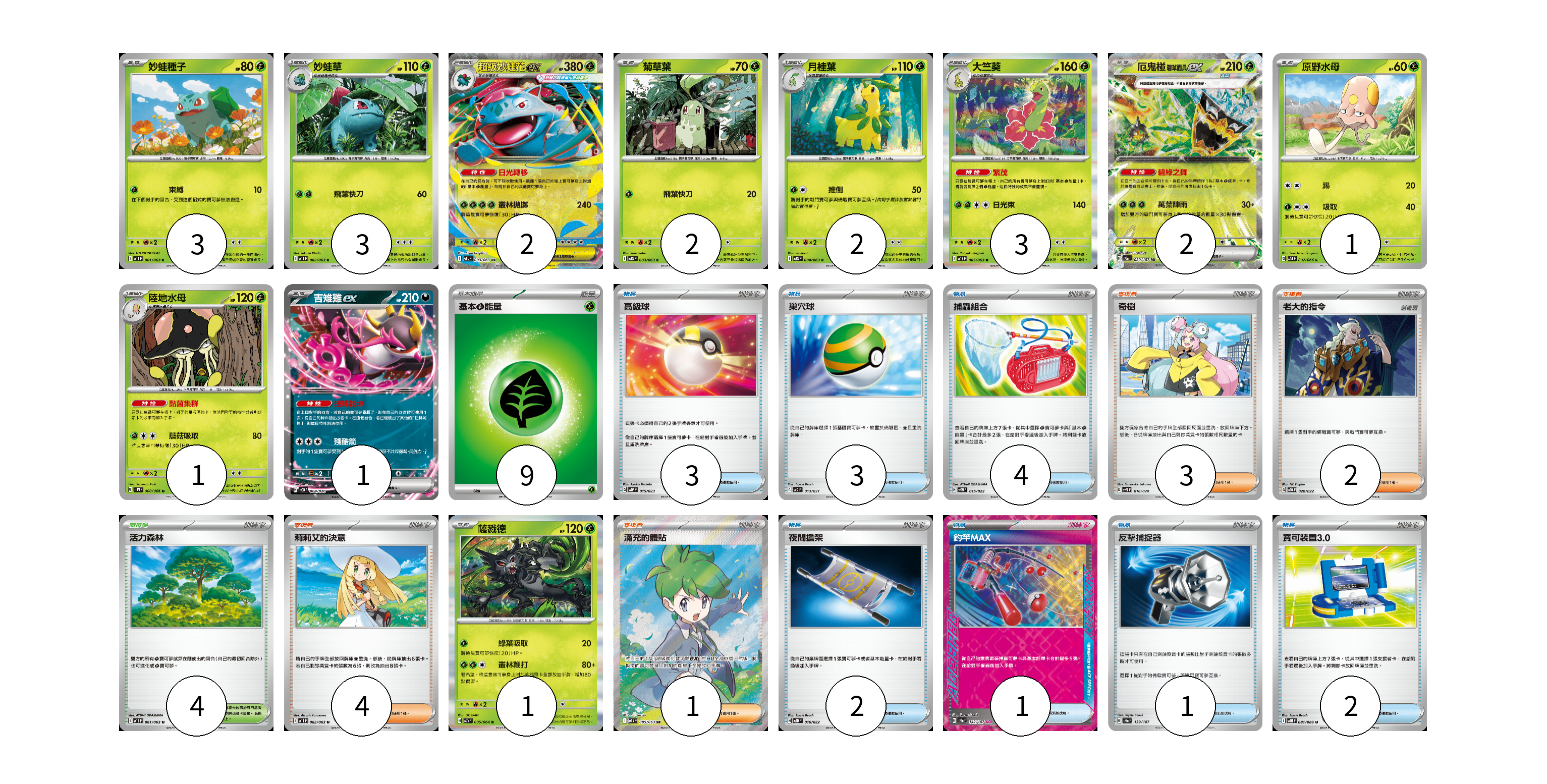 牌組構築方案 以此牌組為基礎新構築牌組 顯示卡面 顯示列表 寶可夢卡(21) 3 3 2 2 2 3 2 1 1 1 1 物品卡(16) 3 3 4 2 1 1 2 支援者卡(10) 3 2 4 1 競技場卡(4) 4 能量卡(9) 9 寶可夢卡(21) 卡牌名稱 張數 卡牌名稱 張數 妙蛙種子 M1L 001/063 03 妙蛙草 M1L 002/063 03 超級妙蛙花ex M1L 003/063 02 菊草葉 M1S 003/063 02 月桂葉 M1S 004/063 02 大竺葵 M1S 005/063 03 厄鬼椪 碧草面具ex SV8a 020/187 02 原野水母 SV4M 007/066 01 陸地水母 SV4M 008/066 01 吉雉雞ex SVOD 004/020 01 薩戮德 SV7a 005/064 01 物品卡(16) 卡牌名稱 張數 卡牌名稱 張數 高級球 SVQP 015/023 03 巢穴球 SVC 013/021 03 捕蟲組合 SVTM 015/022 04 夜間擔架 MBD 016/022 02 釣竿MAX SV8a 142/187 01 反擊捕捉器 SV8a 139/187 01 寶可裝置3.0 SV11B 081/086 02 支援者卡(10) 卡牌名稱 張數 卡牌名稱 張數 奇樹 SVEL 016/020 03 老大的指令 SVTM 020/022 02 莉莉艾的決意 M1L 062/063 04 滿充的體貼 M1S 085/063 01 競技場卡(4) 卡牌名稱 張數 卡牌名稱 張數 活力森林 M1S 061/063 04 能量卡(9) 卡牌名稱 張數 卡牌名稱 張數 基本【草】能量 M-P GRA 09 以此牌組為基礎新構築牌組 牌組編碼 COjxbH-BmPAcO-aHpJMt copy 列印牌組單 牌組編碼已複製 分享至SNS
