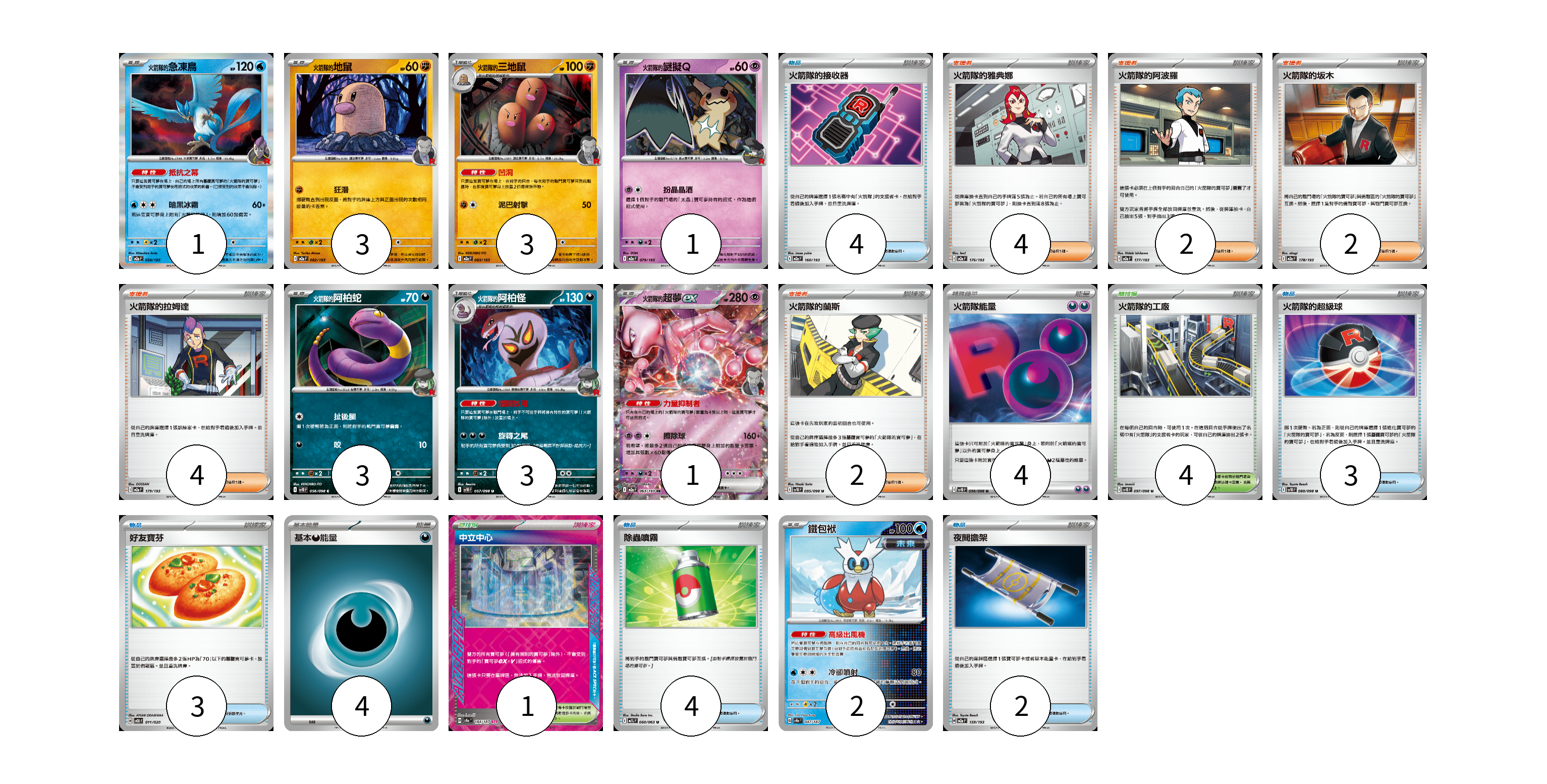 牌組構築方案 以此牌組為基礎新構築牌組 顯示卡面 顯示列表 寶可夢卡(17) 1 3 3 1 3 3 1 2 物品卡(16) 4 3 3 4 2 支援者卡(14) 4 2 2 4 2 競技場卡(5) 4 1 能量卡(8) 4 4 寶可夢卡(17) 卡牌名稱 張數 卡牌名稱 張數 <火箭隊的>急凍鳥 M2a 034/193 01 火箭隊的地鼠 M2a 082/193 03 火箭隊的三地鼠 M2a 083/193 03 <火箭隊的>謎擬Q M2a 079/193 01 <火箭隊的>阿柏蛇 SV10 056/098 03 <火箭隊的>阿柏怪 SV10 057/098 03 <火箭隊的>超夢ex M2a 063/193 01 鐵包袱 SV8a 047/187 02 物品卡(16) 卡牌名稱 張數 卡牌名稱 張數 火箭隊的接收器 M2a 160/193 04 火箭隊的超級球 SV10 088/098 03 好友寶芬 SVOD 011/020 03 除蟲噴霧 M1L 060/063 04 夜間擔架 M2a 159/193 02 支援者卡(14) 卡牌名稱 張數 卡牌名稱 張數 火箭隊的雅典娜 M2a 176/193 04 火箭隊的阿波羅 M2a 177/193 02 火箭隊的坂木 M2a 178/193 02 火箭隊的拉姆達 M2a 179/193 04 火箭隊的蘭斯 SV10 095/098 02 競技場卡(5) 卡牌名稱 張數 卡牌名稱 張數 火箭隊的工廠 SV10 097/098 04 中立中心 SV8a 184/187 01 能量卡(8) 卡牌名稱 張數 卡牌名稱 張數 火箭隊能量 SV10 098/098 04 基本惡能量 sv-p DAR 04 以此牌組為基礎新構築牌組 牌組編碼 CRJnsv-YOEbTx-ilJcgh copy 列印牌組單 牌組編碼已複製 分享至SNS