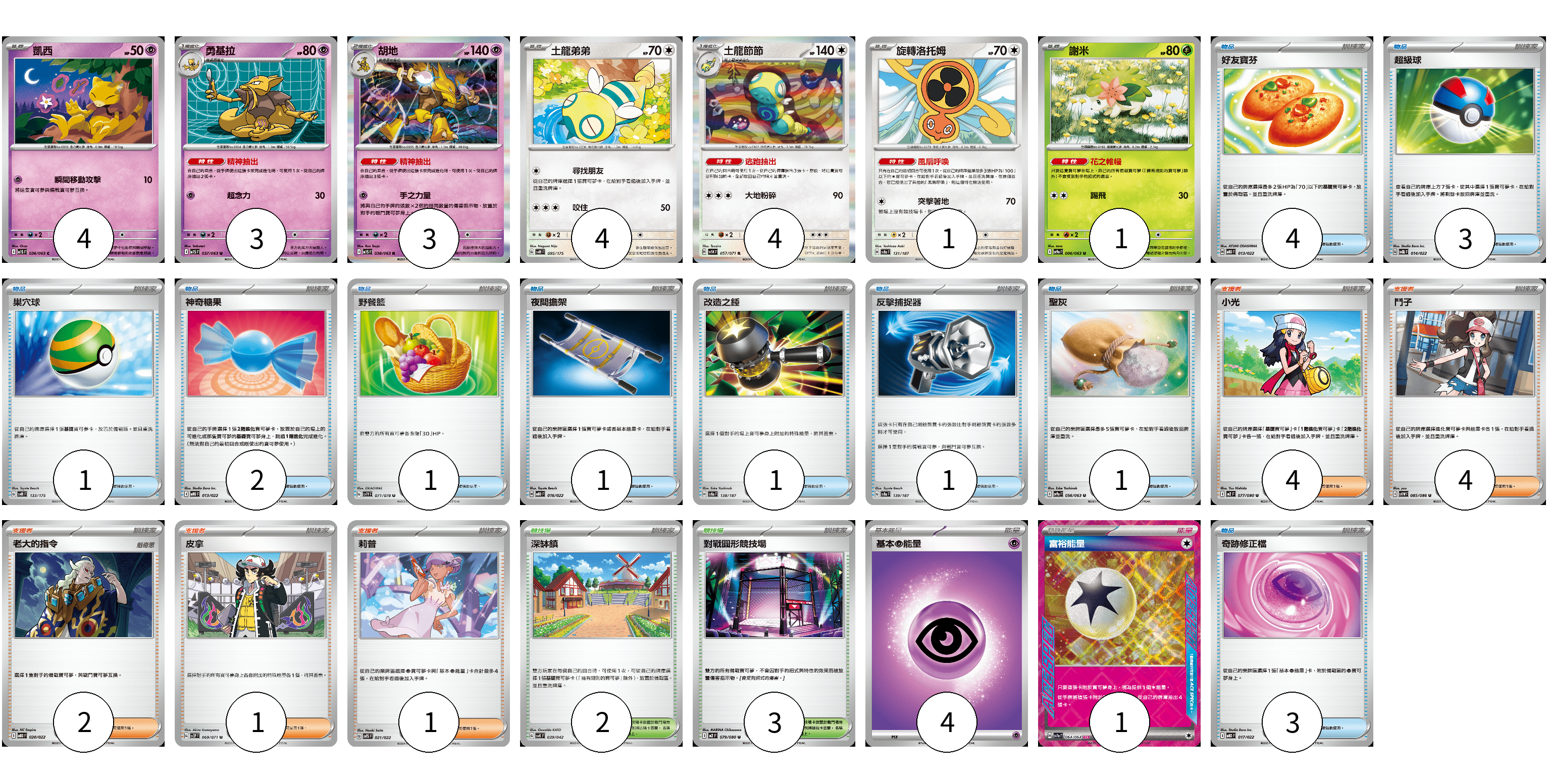 牌組構築方案 以此牌組為基礎新構築牌組 顯示卡面 顯示列表 寶可夢卡(20) 4 3 3 4 4 1 1 物品卡(18) 4 3 1 2 1 1 1 1 1 3 支援者卡(12) 4 4 2 1 1 競技場卡(5) 2 3 能量卡(5) 4 1 寶可夢卡(20) 卡牌名稱 張數 卡牌名稱 張數 凱西 M1S 036/063 04 勇基拉 M1S 037/063 03 胡地 M1S 038/063 03 土龍弟弟 SVM 095/175 04 土龍節節 SV5K 057/071 04 旋轉洛托姆 SV8a 131/187 01 謝米 SV9a 006/063 01 物品卡(18) 卡牌名稱 張數 卡牌名稱 張數 好友寶芬 MBD 013/022 04 超級球 SVQL 014/022 03 巢穴球 SVM 133/175 01 神奇糖果 MBG 013/022 02 野餐籃 SV1V 071/078 01 夜間擔架 MBD 016/022 01 改造之錘 SV8a 138/187 01 反擊捕捉器 SV8a 139/187 01 聖灰 SV9a 056/063 01 奇跡修正檔 MBD 017/022 03 支援者卡(12) 卡牌名稱 張數 卡牌名稱 張數 小光 M2 077/080 04 鬥子 SV11W 085/086 04 老大的指令 MBD 020/022 02 皮拿 SV2P 069/071 01 莉普 SVTS 021/022 01 競技場卡(5) 卡牌名稱 張數 卡牌名稱 張數 深缽鎮 SVK 039/042 02 對戰圓形競技場 M2 079/080 03 能量卡(5) 卡牌名稱 張數 卡牌名稱 張數 基本【超】能量 MBD PSY 04 富裕能量 SV7a 064/064 01 以此牌組為基礎新構築牌組 牌組編碼 CUyFkE-ckJczo-UNRool copy 列印牌組單 牌組編碼已複製 分享至SNS