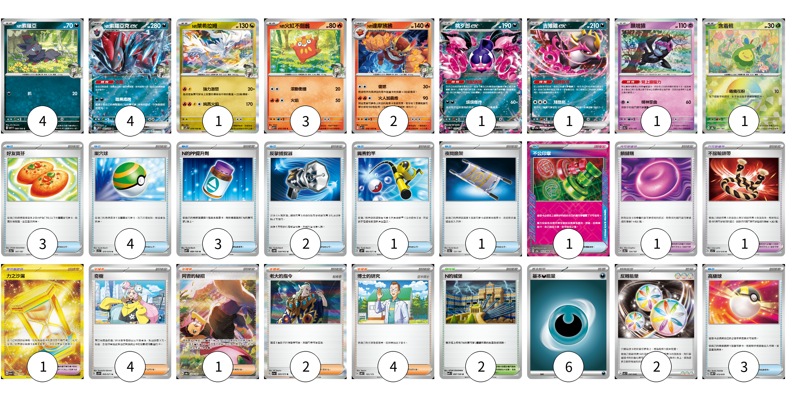 牌組構築方案 以此牌組為基礎新構築牌組 顯示卡面 顯示列表 寶可夢卡(18) 4 4 1 3 2 1 1 1 1 寶可夢道具(3) 1 1 1 物品卡(18) 3 4 3 2 1 1 1 3 支援者卡(11) 4 1 2 4 競技場卡(2) 2 能量卡(8) 6 2 寶可夢卡(18) 卡牌名稱 張數 卡牌名稱 張數 N的索羅亞 SV9 060/100 04 N的索羅亞克ex SV9 061/100 04 N的萊希拉姆 SV9 074/100 01 N的火紅不倒翁 SV9 015/100 03 N的達摩狒狒 SV9 016/100 02 桃歹郎ex SV8a 105/187 01 吉雉雞ex SV8a 104/187 01 願增猿 SV8a 075/187 01 含羞苞 SV8a 001/187 01 寶可夢道具(3) 卡牌名稱 張數 卡牌名稱 張數 鎖鏈糬 SV8a 154/187 01 不服輸頭帶 SV1S 073/078 01 力之沙漏 SV6a 094/064 01 物品卡(18) 卡牌名稱 張數 卡牌名稱 張數 好友寶芬 SV8a 147/187 03 巢穴球 SV1S 070/078 04 N的PP提升劑 SV9 089/100 03 反擊捕捉器 SV4M 059/066 02 厲害釣竿 SV2P 066/071 01 夜間擔架 SV8a 151/187 01 不公印章 SV5a 053/066 01 高級球 SVTG 013/019 03 支援者卡(11) 卡牌名稱 張數 卡牌名稱 張數 奇樹 SV2D 069/071 04 阿杏的秘招 SV8a 228/187 01 老大的指令 SV1a 069/073 02 博士的研究 SVM 163/175 04 競技場卡(2) 卡牌名稱 張數 卡牌名稱 張數 N的城堡 SV9 097/100 02 能量卡(8) 卡牌名稱 張數 卡牌名稱 張數 基本【惡】能量 SVF DAR 06 反轉能量 SVK 041/042 02 以此牌組為基礎新構築牌組 牌組編碼 CVtGds-jNbVrK-gCgvnj copy 列印牌組單 牌組編碼已複製 分享至SNS