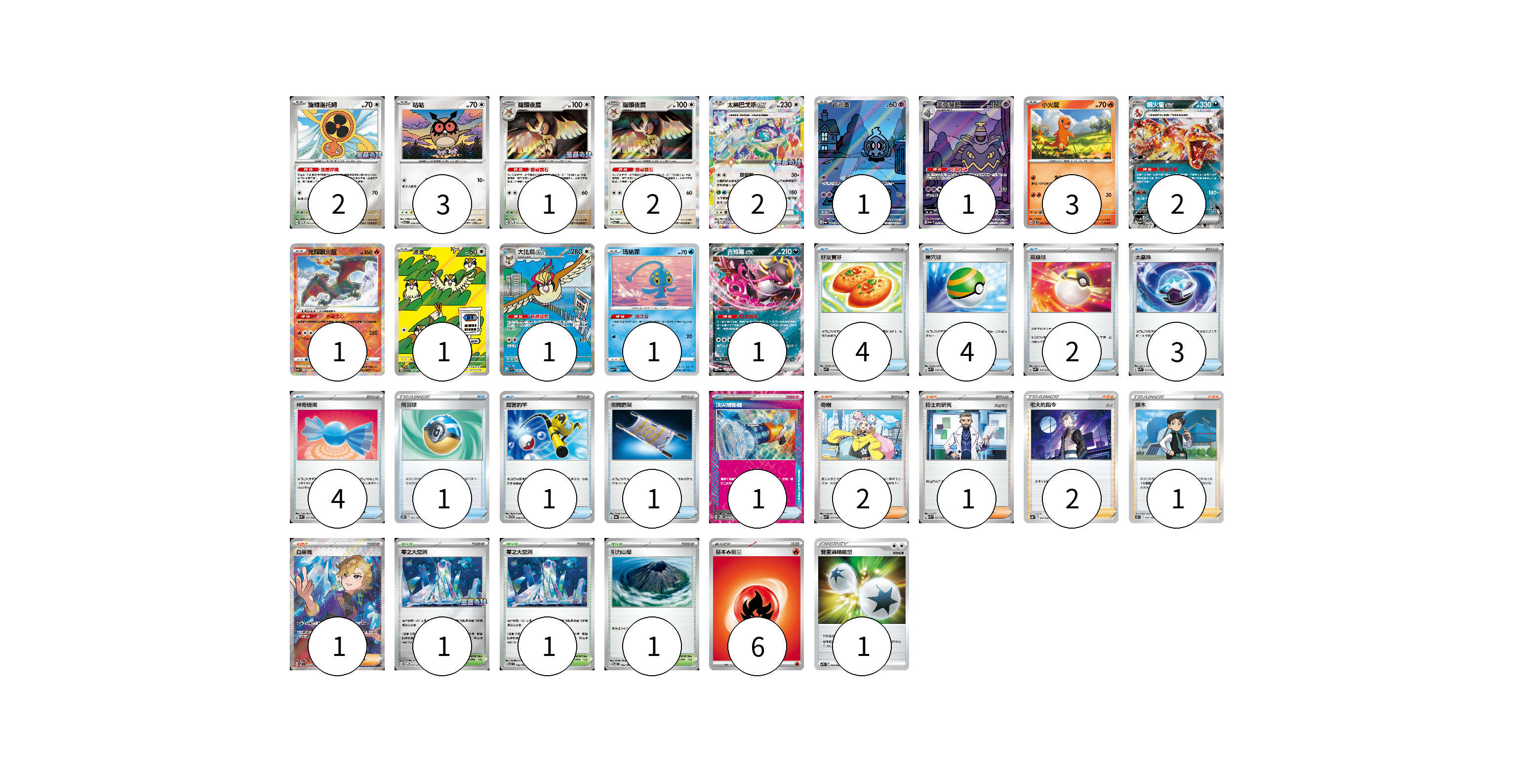 牌組構築方案 以此牌組為基礎新構築牌組 顯示卡面 顯示列表 寶可夢卡(22) 2 3 1 2 2 1 1 3 2 1 1 1 1 1 物品卡(21) 4 4 2 3 4 1 1 1 1 支援者卡(7) 2 1 2 1 1 競技場卡(3) 1 1 1 能量卡(7) 6 1 寶可夢卡(22) 卡牌名稱 張數 卡牌名稱 張數 旋轉洛托姆 SV-P 146/SV-P 02 咕咕 SV7 076/102 03 貓頭夜鷹 SV-P 145/SV-P 01 貓頭夜鷹 SV7 077/102 02 太樂巴戈斯ex SV-P 148/SV-P 02 夜巡靈 SV6a 068/064 01 黑夜魔靈 SV6a 070/064 01 小火龍 SVTL 001/021 03 噴火龍ex SV4a 115/190 02 光輝噴火龍 SVF 001/038 01 波波 SV3 118/108 01 大比鳥ex SV3 136/108 01 瑪納霏 SVF 003/038 01 吉雉雞ex SV6a 038/064 01 物品卡(21) 卡牌名稱 張數 卡牌名稱 張數 好友寶芬 SVK 015/042 04 巢穴球 SVK 016/042 04 高級球 SVK 018/042 02 太晶珠 SVK 013/042 03 神奇糖果 SVK 019/042 04 飛羽球 S10D 063/067 01 厲害釣竿 SVTH 008/018 01 夜間擔架 SV6a 056/064 01 頂尖捕捉器 SV5M 062/071 01 支援者卡(7) 卡牌名稱 張數 卡牌名稱 張數 奇樹 SVK 031/042 02 博士的研究 SVK 033/042 01 老大的指令(赤日) SVB 024/028 02 捩木 S11 097/100 01 白蕾雅 SV7 126/102 01 競技場卡(3) 卡牌名稱 張數 卡牌名稱 張數 零之大空洞 SV-P 151/SV-P 01 零之大空洞 SV7 102/102 01 引力山岳 SV8 106/106 01 能量卡(7) 卡牌名稱 張數 卡牌名稱 張數 基本火能量 sv-p FIR 06 雙重渦輪能量 SVTM 022/022 01 以此牌組為基礎新構築牌組 牌組編碼 CWhXcq-pJMyhR-yNiYzC copy 列印牌組單 牌組編碼已複製 分享至SNS