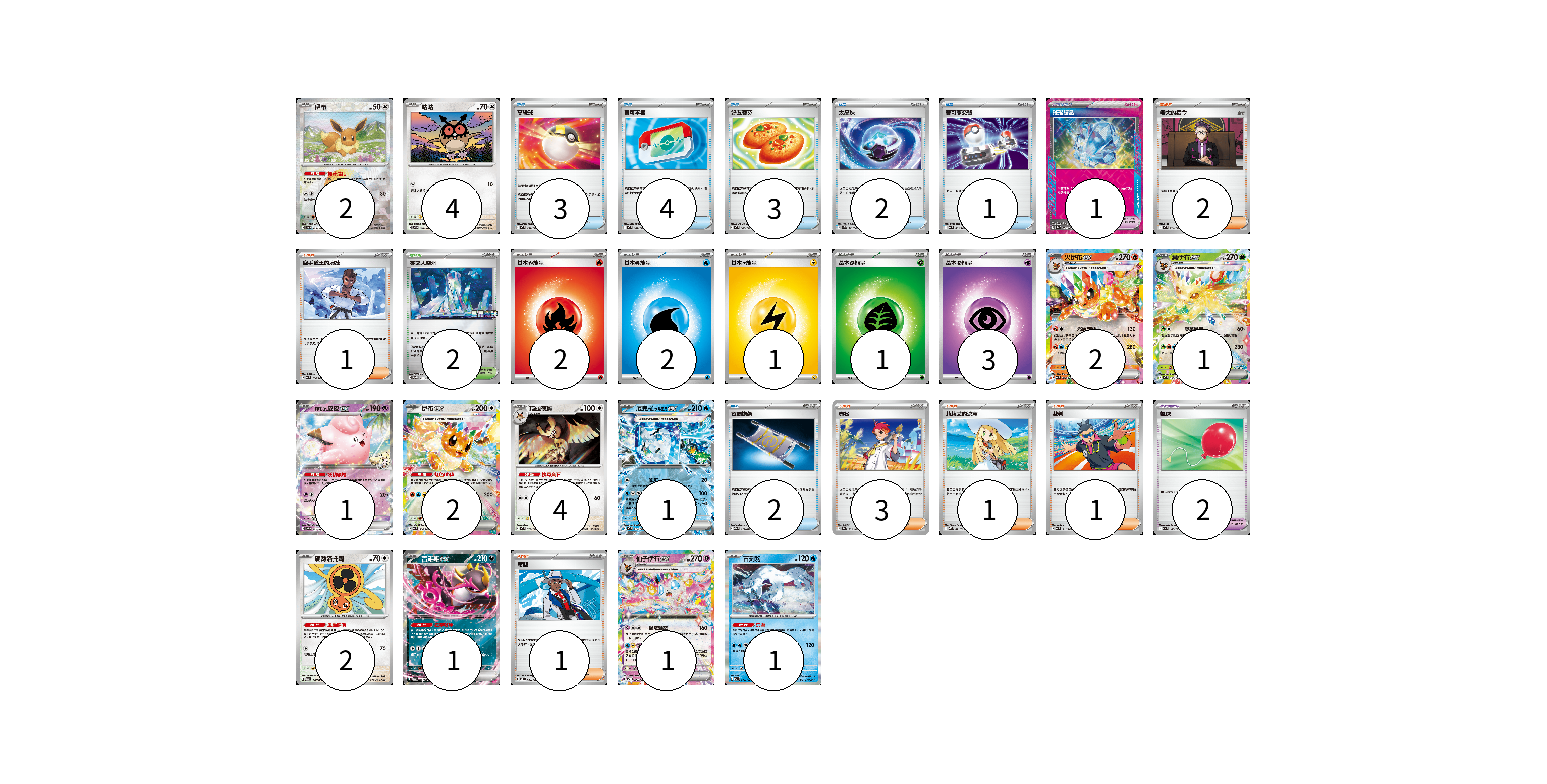 牌組構築方案 以此牌組為基礎新構築牌組 顯示卡面 顯示列表 寶可夢卡(22) 2 4 2 1 1 2 4 1 2 1 1 1 寶可夢道具(3) 1 2 物品卡(15) 3 4 3 2 1 2 支援者卡(9) 2 1 3 1 1 1 競技場卡(2) 2 能量卡(9) 2 2 1 1 3 寶可夢卡(22) 卡牌名稱 張數 卡牌名稱 張數 伊布 SV8a 125/187 02 咕咕 SV7 076/102 04 火伊布ex MC 094/742 02 葉伊布ex MC 038/742 01 莉莉艾的皮皮ex SV9 033/100 01 伊布ex MC 566/742 02 貓頭夜鷹 MC 573/742 04 厄鬼椪 水井面具ex MC 224/742 01 旋轉洛托姆 M2a 139/193 02 吉雉雞ex M2a 114/193 01 仙子伊布ex SVPN 005/008 01 古劍豹 M2a 043/193 01 寶可夢道具(3) 卡牌名稱 張數 卡牌名稱 張數 璀璨結晶 SV8a 152/187 01 氣球 M2a 165/193 02 物品卡(15) 卡牌名稱 張數 卡牌名稱 張數 高級球 MC 651/742 03 寶可平板 MC 662/742 04 好友寶芬 MC 648/742 03 太晶珠 SVK 013/042 02 寶可夢交替 MC 663/742 01 夜間擔架 MBG 017/022 02 支援者卡(9) 卡牌名稱 張數 卡牌名稱 張數 老大的指令 MC 724/742 02 空手道王的演練 MC 704/742 01 赤松 SV8a 163/187 03 莉莉艾的決意 MBD 021/022 01 裁判 MC 711/742 01 席藍 SV8 102/106 01 競技場卡(2) 卡牌名稱 張數 卡牌名稱 張數 零之大空洞 SV-P 151/SV-P 02 能量卡(9) 卡牌名稱 張數 卡牌名稱 張數 基本【火】能量 MC FIR 02 基本【水】能量 MC WAT 02 基本【雷】能量 MC LIG 01 基本【草】能量 MC GRA 01 基本【超】能量 MC PSY 03 以此牌組為基礎新構築牌組 牌組編碼 CWrPCa-ANKAoL-NYSIbb copy 列印牌組單 牌組編碼已複製 分享至SNS