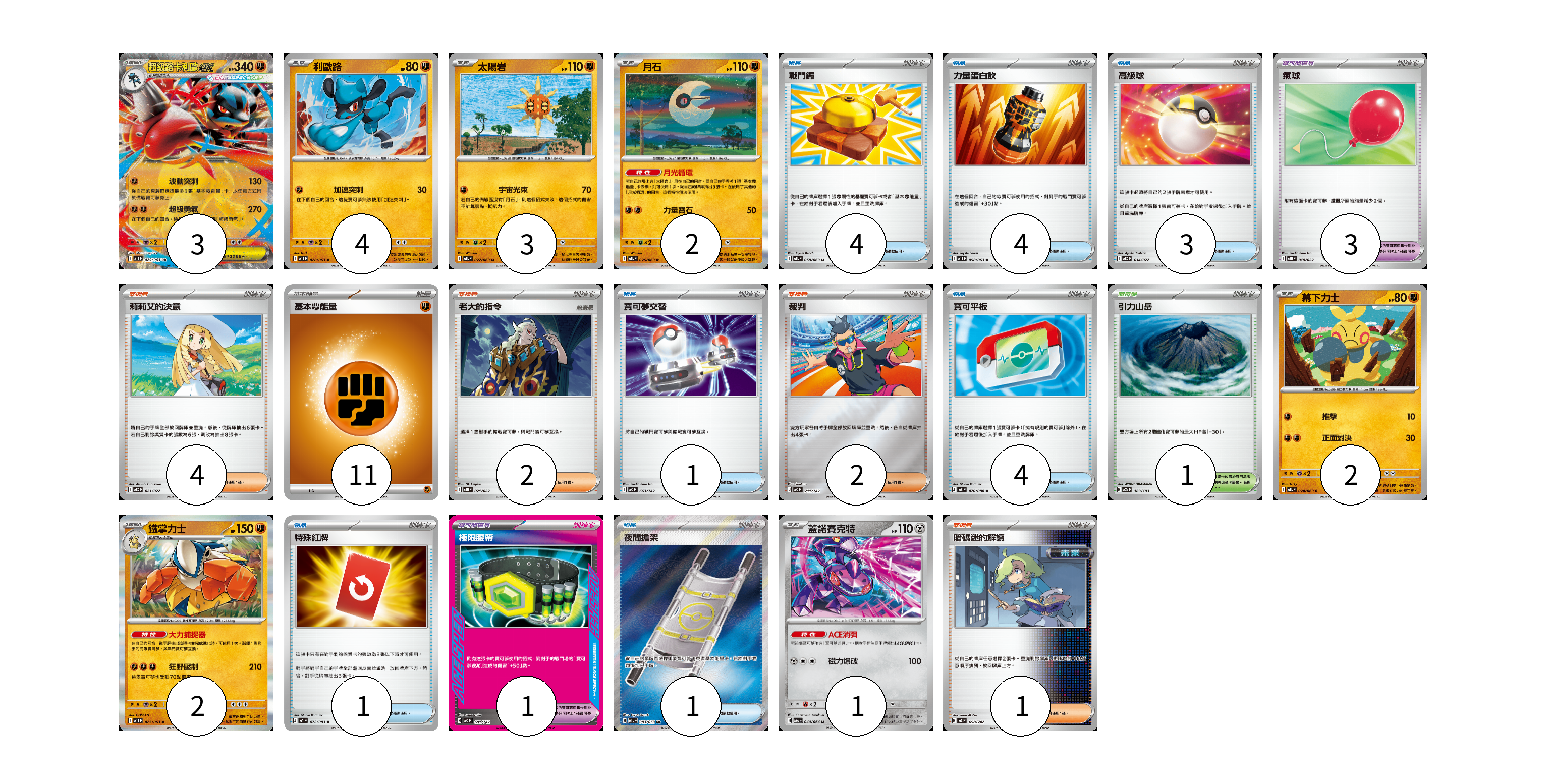 牌組構築方案 以此牌組為基礎新構築牌組 顯示卡面 顯示列表 寶可夢卡(17) 3 4 3 2 2 2 1 寶可夢道具(4) 3 1 物品卡(18) 4 4 3 1 4 1 1 支援者卡(9) 4 2 2 1 競技場卡(1) 1 能量卡(11) 11 寶可夢卡(17) 卡牌名稱 張數 卡牌名稱 張數 超級路卡利歐ex M1L 029/063 03 利歐路 M1L 028/063 04 太陽岩 M1L 027/063 03 月石 M1L 026/063 02 幕下力士 M1L 024/063 02 鐵掌力士 M1L 025/063 02 蓋諾賽克特 SV6a 040/064 01 寶可夢道具(4) 卡牌名稱 張數 卡牌名稱 張數 氣球 MBD 018/022 03 極限腰帶 MC 691/742 01 物品卡(18) 卡牌名稱 張數 卡牌名稱 張數 戰鬥鑼 M1L 059/063 04 力量蛋白飲 M1L 058/063 04 高級球 MBD 014/022 03 寶可夢交替 MC 663/742 01 寶可平板 M3 070/080 04 特殊紅牌 M4 072/083 01 夜間擔架 M1L 083/063 01 支援者卡(9) 卡牌名稱 張數 卡牌名稱 張數 莉莉艾的決意 MBD 021/022 04 老大的指令 MBG 021/022 02 裁判 MC 711/742 02 暗碼迷的解讀 MC 698/742 01 競技場卡(1) 卡牌名稱 張數 卡牌名稱 張數 引力山岳 M2a 183/193 01 能量卡(11) 卡牌名稱 張數 卡牌名稱 張數 基本【鬥】能量 M-P FIG 11 以此牌組為基礎新構築牌組 牌組編碼 CXPNKJ-ronlQf-YhBNjv copy 列印牌組單 牌組編碼已複製 分享至SNS