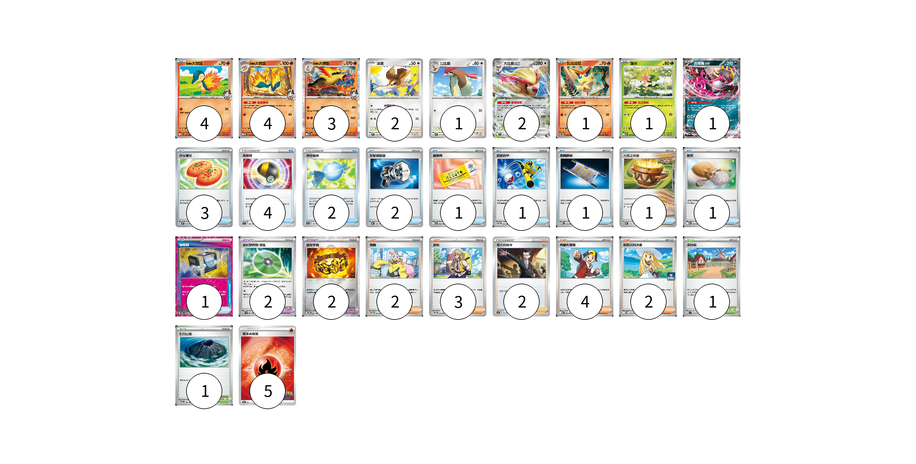 牌組構築方案 以此牌組為基礎新構築牌組 顯示卡面 顯示列表 寶可夢卡(19) 4 4 3 2 1 2 1 1 1 寶可夢道具(4) 2 2 物品卡(17) 3 4 2 2 1 1 1 1 1 1 支援者卡(13) 2 3 2 4 2 競技場卡(2) 1 1 能量卡(5) 5 寶可夢卡(19) 卡牌名稱 張數 卡牌名稱 張數 <阿響的>火球鼠 SV9a 015/063 04 <阿響的>火岩鼠 SV9a 016/063 04 <阿響的>火爆獸 SV9a 017/063 03 波波 SV2a 016/165 02 比比鳥 SV2a 017/165 01 大比鳥ex SV3 089/108 02 比克提尼 SV8 012/106 01 謝米 SV9a 006/063 01 吉雉雞ex SV6a 038/064 01 寶可夢道具(4) 卡牌名稱 張數 卡牌名稱 張數 招式學習器 演進 SV4M 063/066 02 猛攻手鐲 SV11W 082/086 02 物品卡(17) 卡牌名稱 張數 卡牌名稱 張數 好友寶芬 SV5K 063/071 03 高級球 S9 089/100 04 神奇糖果 SC1b 139/153 02 反擊捕捉器 SV8a 139/187 02 調換票 SV9 090/100 01 厲害釣竿 SVOD 010/020 01 夜間擔架 MBD 016/022 01 大地之容器 SV8a 143/187 01 聖灰 SV9a 056/063 01 秘密箱 SV6 092/101 01 支援者卡(13) 卡牌名稱 張數 卡牌名稱 張數 奇樹 SVOD 016/020 02 派帕 SVOD 018/020 03 老大的指令(坂木) SC1D 161/164 02 阿響的冒險 SV9a 063/063 04 莉莉艾的決意 M-P 018/M-P 02 競技場卡(2) 卡牌名稱 張數 卡牌名稱 張數 深缽鎮 SV1a 070/073 01 引力山岳 SV8 106/106 01 能量卡(5) 卡牌名稱 張數 卡牌名稱 張數 基本火能量 S10b FIR 05 以此牌組為基礎新構築牌組 牌組編碼 CZgCll-DhvypX-UHRTBm copy 列印牌組單 牌組編碼已複製 分享至SNS